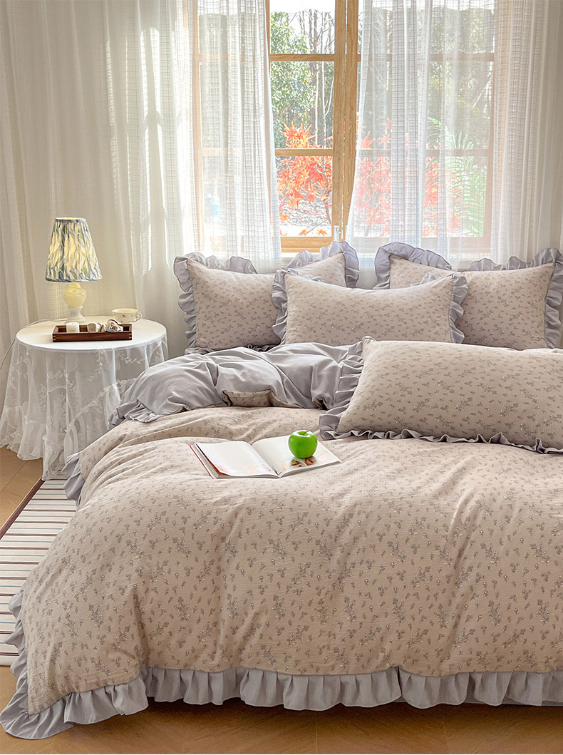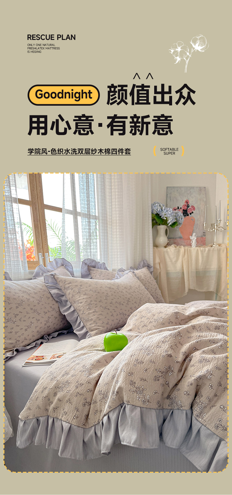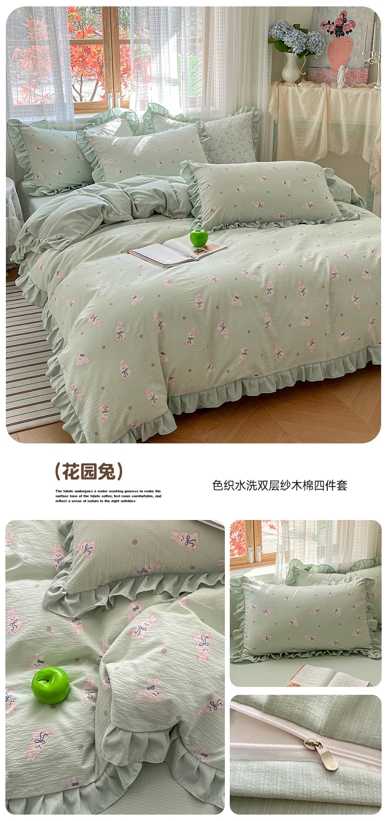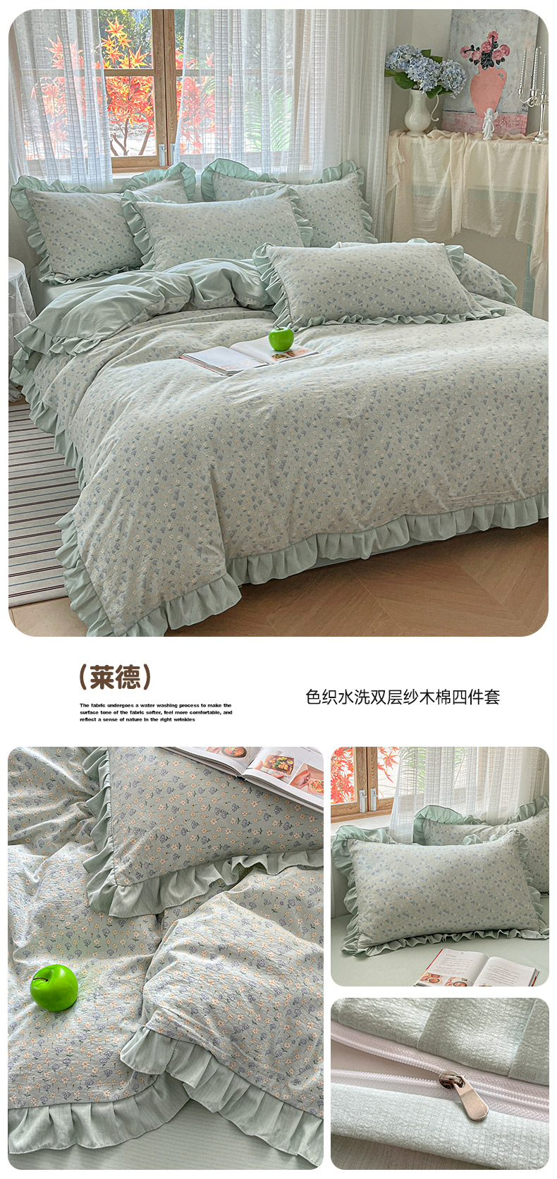 (总)库里梦家纺 2025新款韩版花边小清新色织水洗双层纱木棉四件套