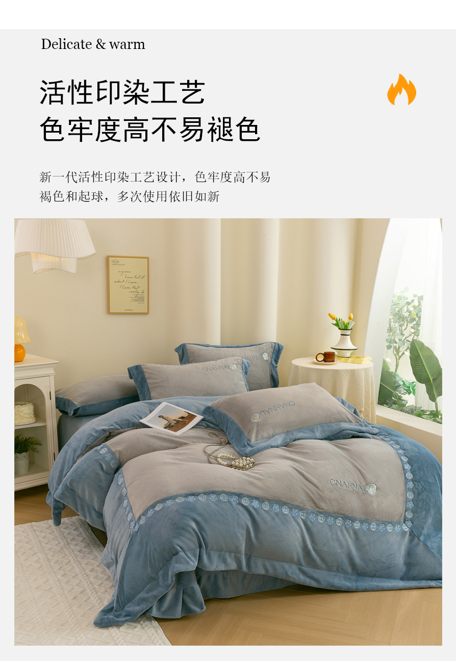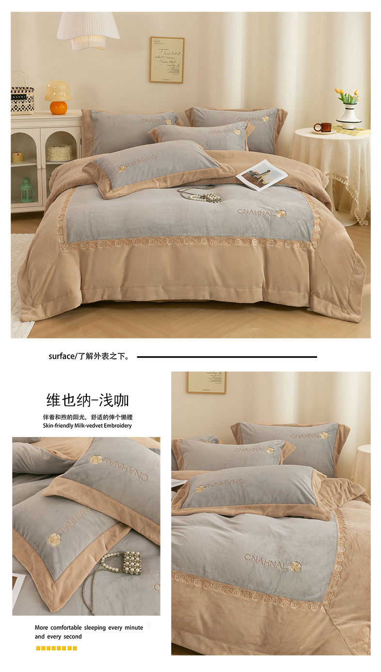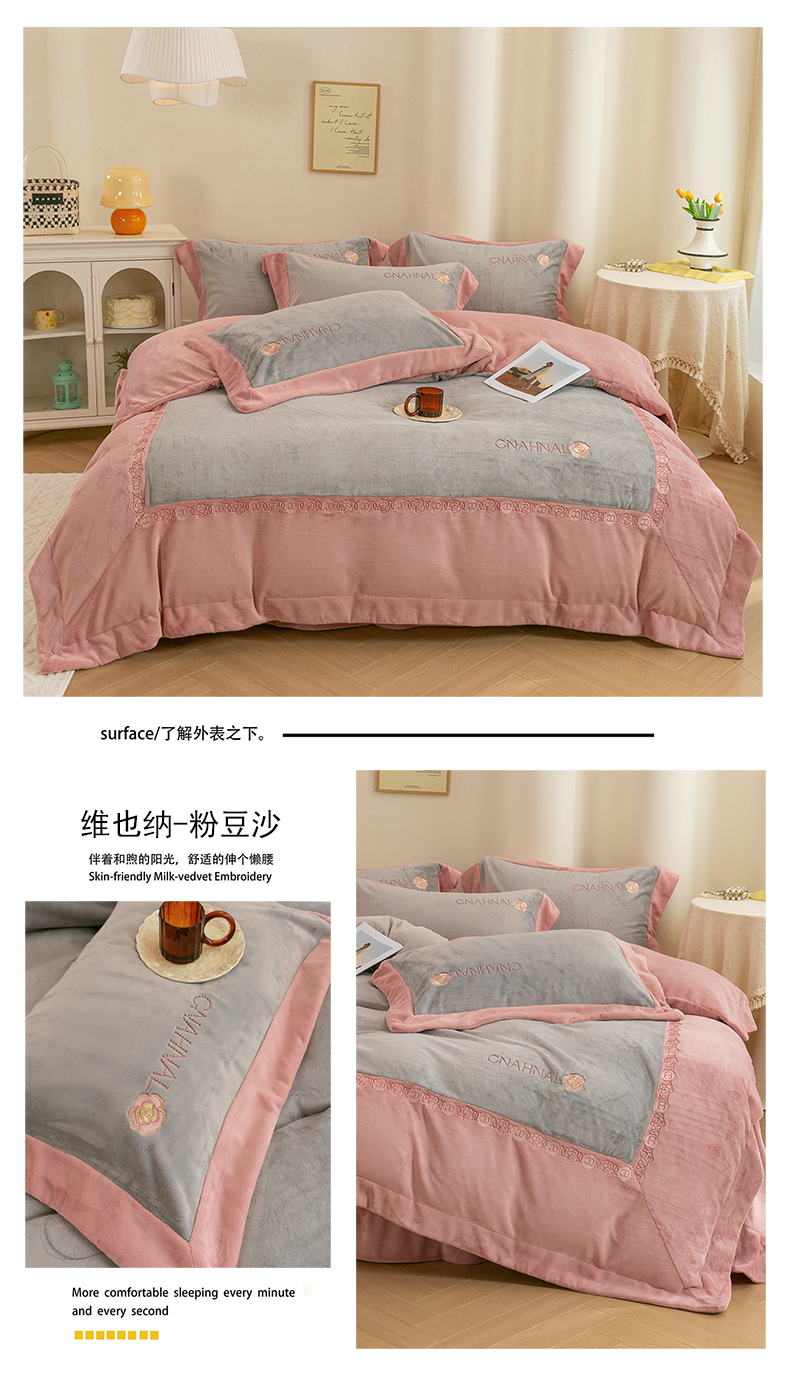 (总)绒博士 2025新款270克牛奶绒双拼角刺绣宽边款四件套--维也纳系列,维也纳-粉豆沙,维也纳-果绿,维也纳-浅咖,维也纳-浅蓝