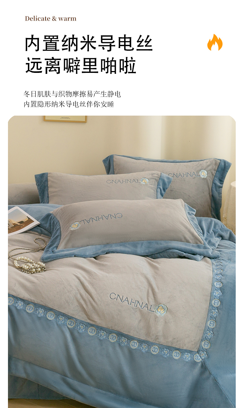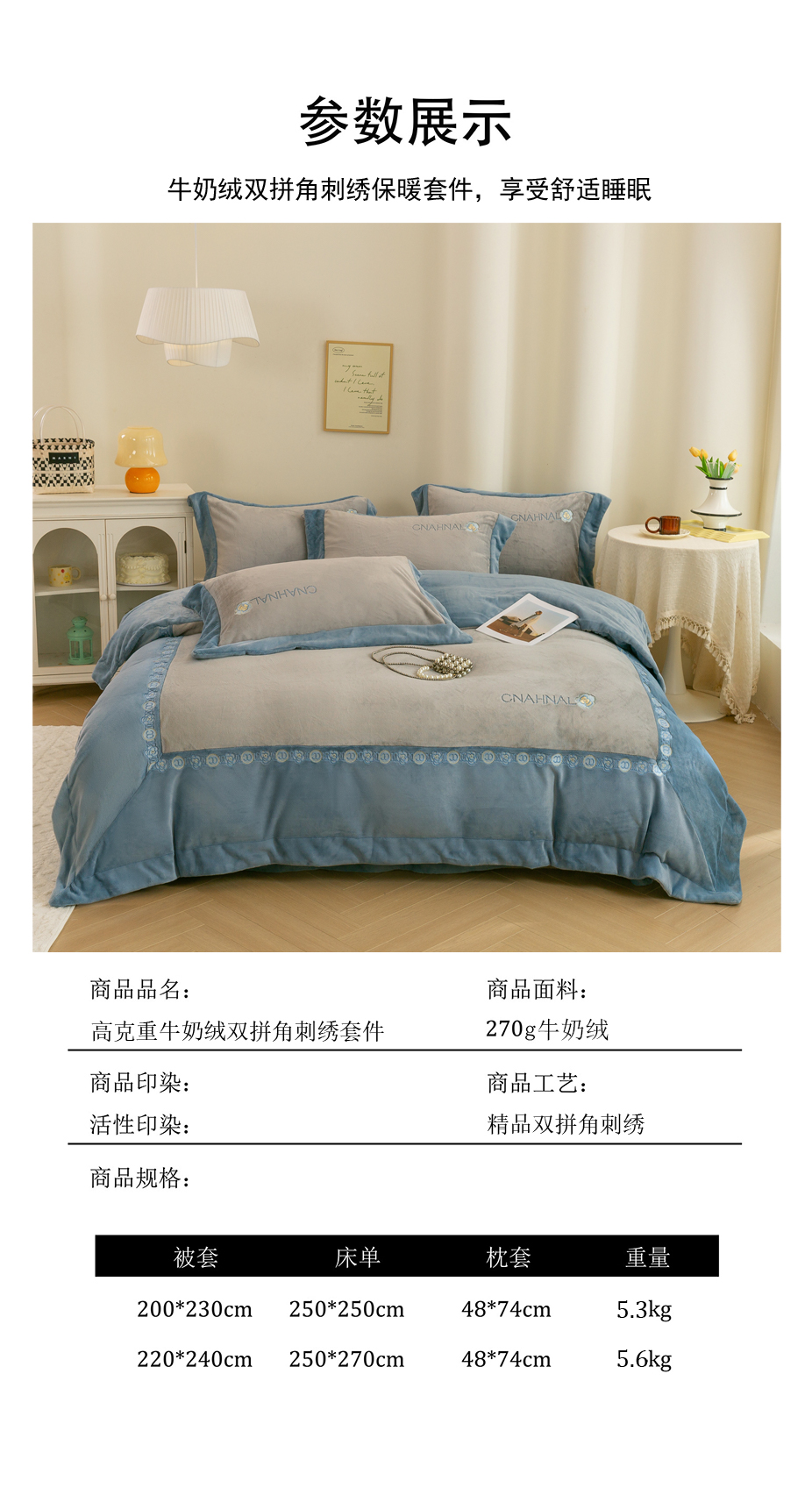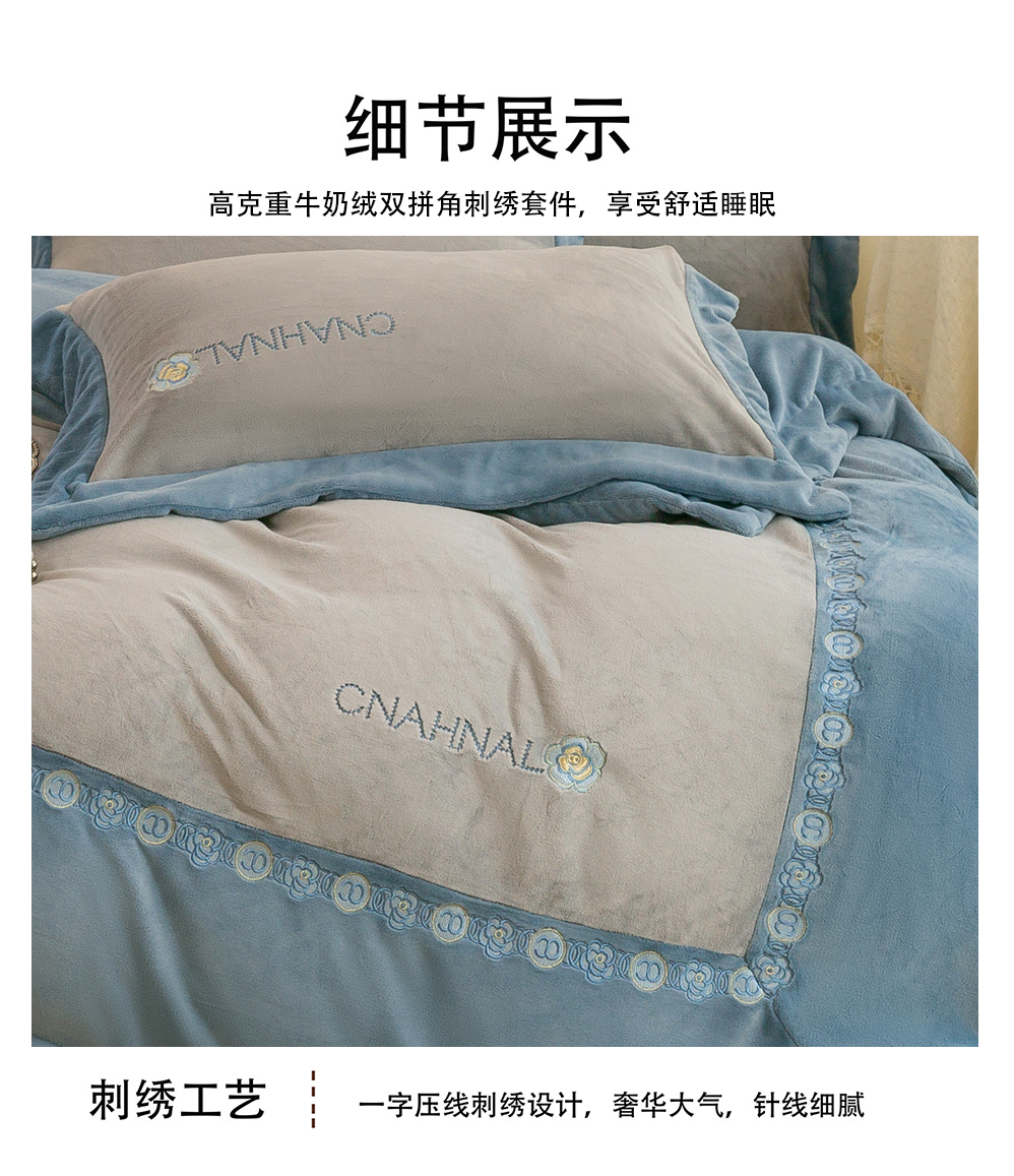 商品名称:绒博士 2025新款270克牛奶绒双拼角刺绣宽边款四件套--维也纳系列 维也纳-浅蓝