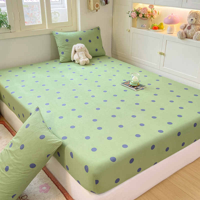 玉海棠家纺 2025新款直播爆款双层纱床笠三件套 咖色绿波点