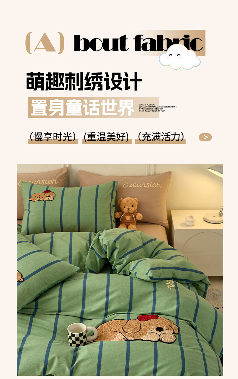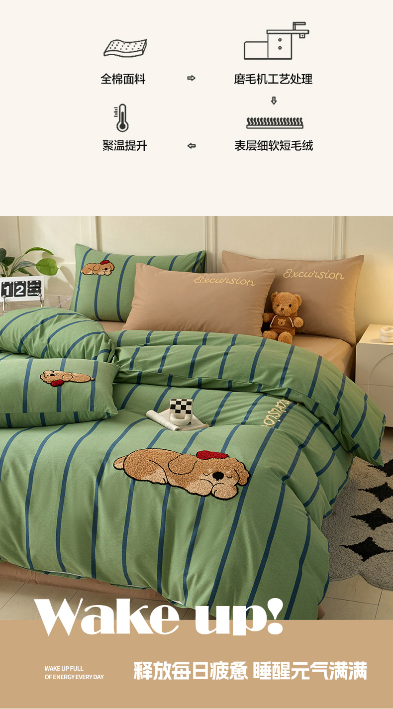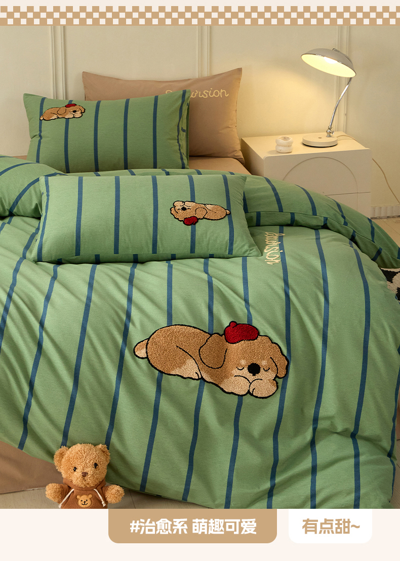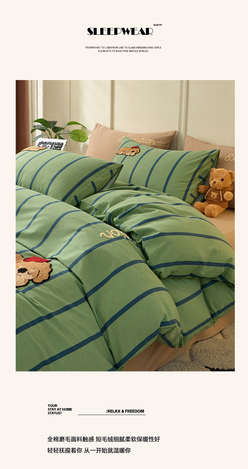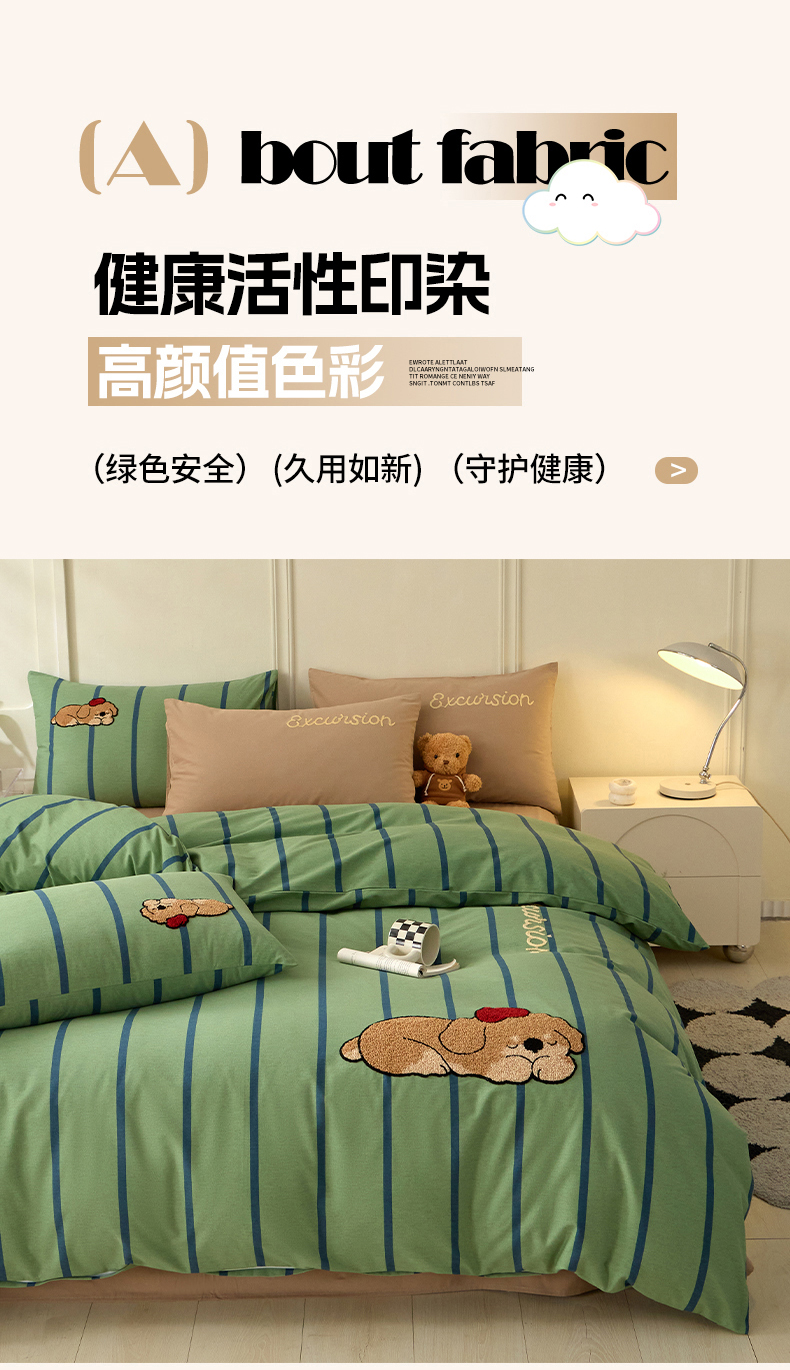 当前位置: 91家纺网 > 商品网购 > 床品套件 > 四件套 > 普通磨毛四件套 > 蓝邻家纺 2025新款全棉磨毛卡通刺绣款四件套--毛巾绣系列 瑞瑞-绿