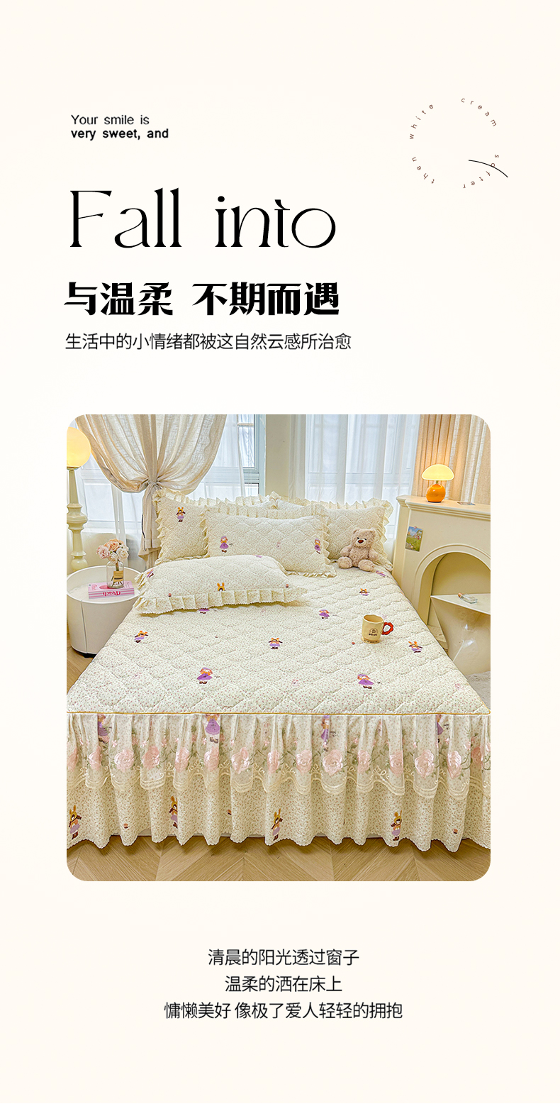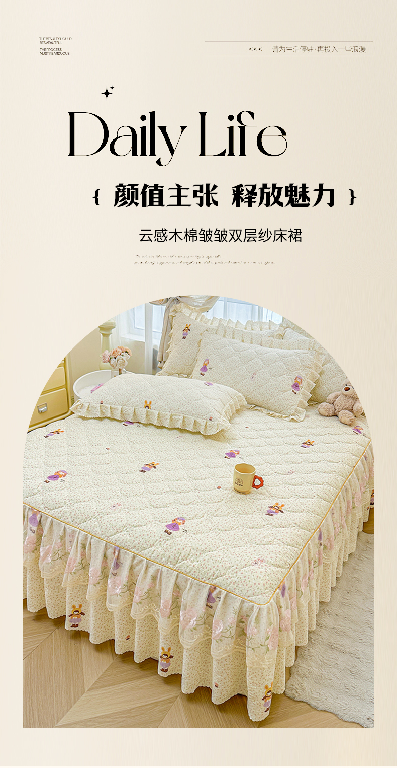 • 91家纺网 家纺一手货源 找家纺 艾裙海 2025秋冬新款木棉皱皱双层纱夹棉床裙系列单品床裙 可爱小女孩