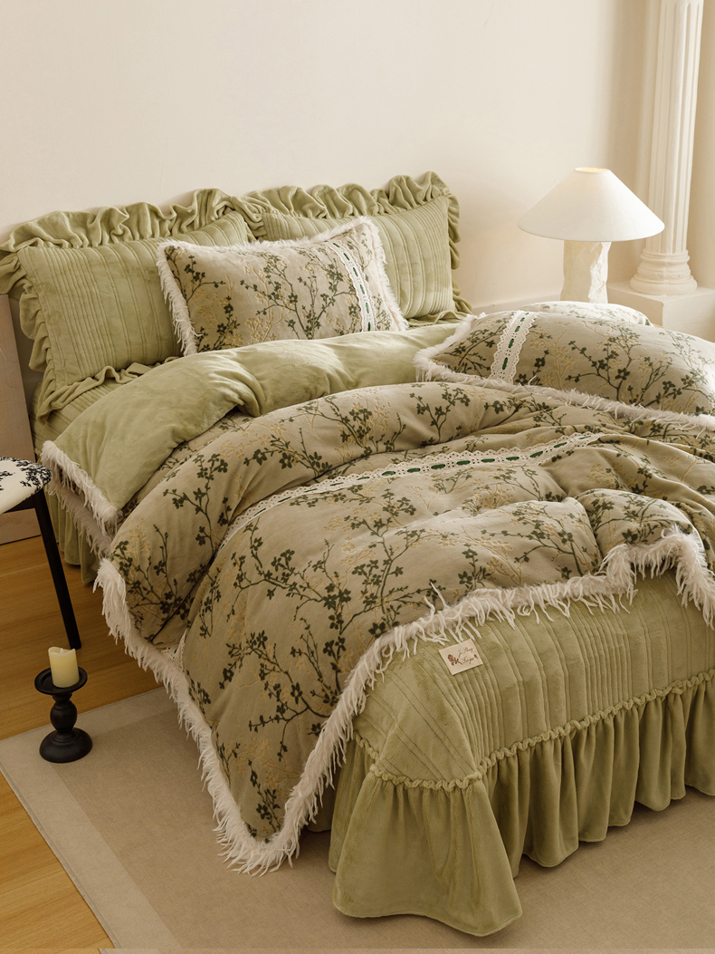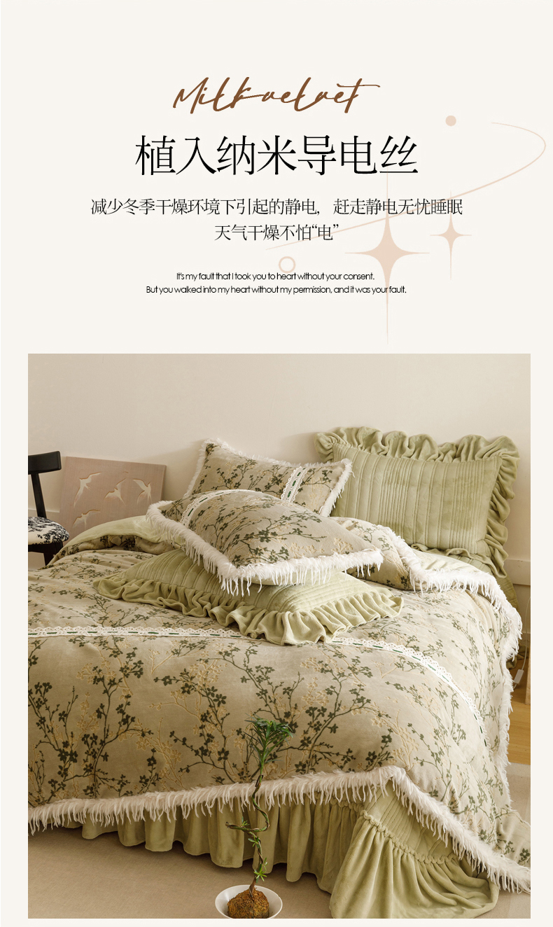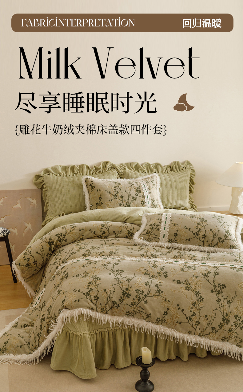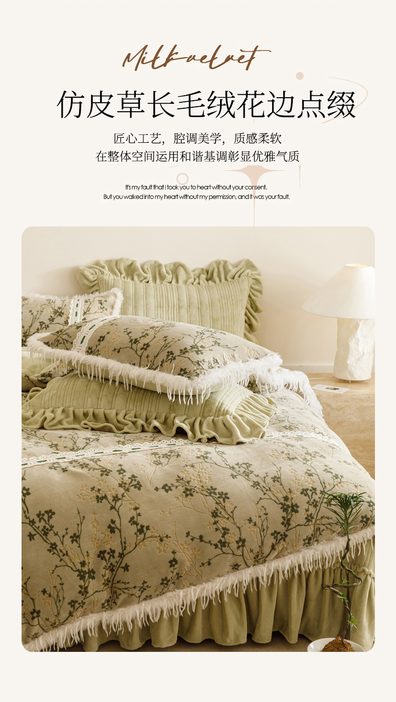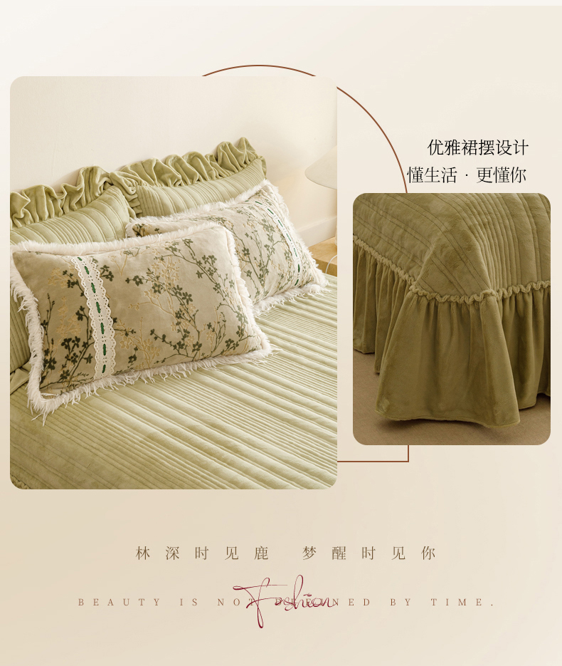 当前位置: 91家纺网 > 商品网购 > 床品套件 > 四件套 > 牛奶绒四件套 > 菊上家纺 2025新款高克重5D雕花牛奶绒时尚仿皮草国潮风床盖四件套-羽妃系列 羽妃-豆绿