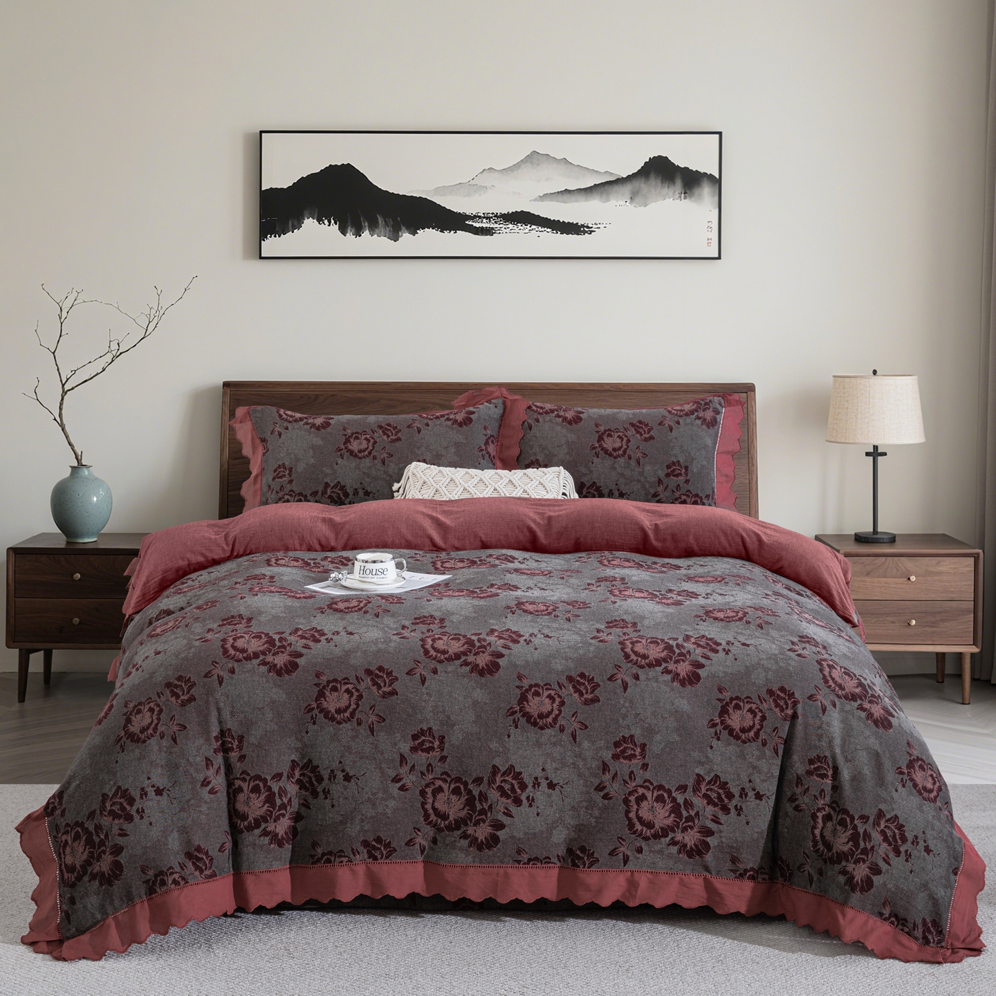 鲁爱家纺供货 2025新款全棉色织提花(花边镂空款)四件套 云纱-中古色
