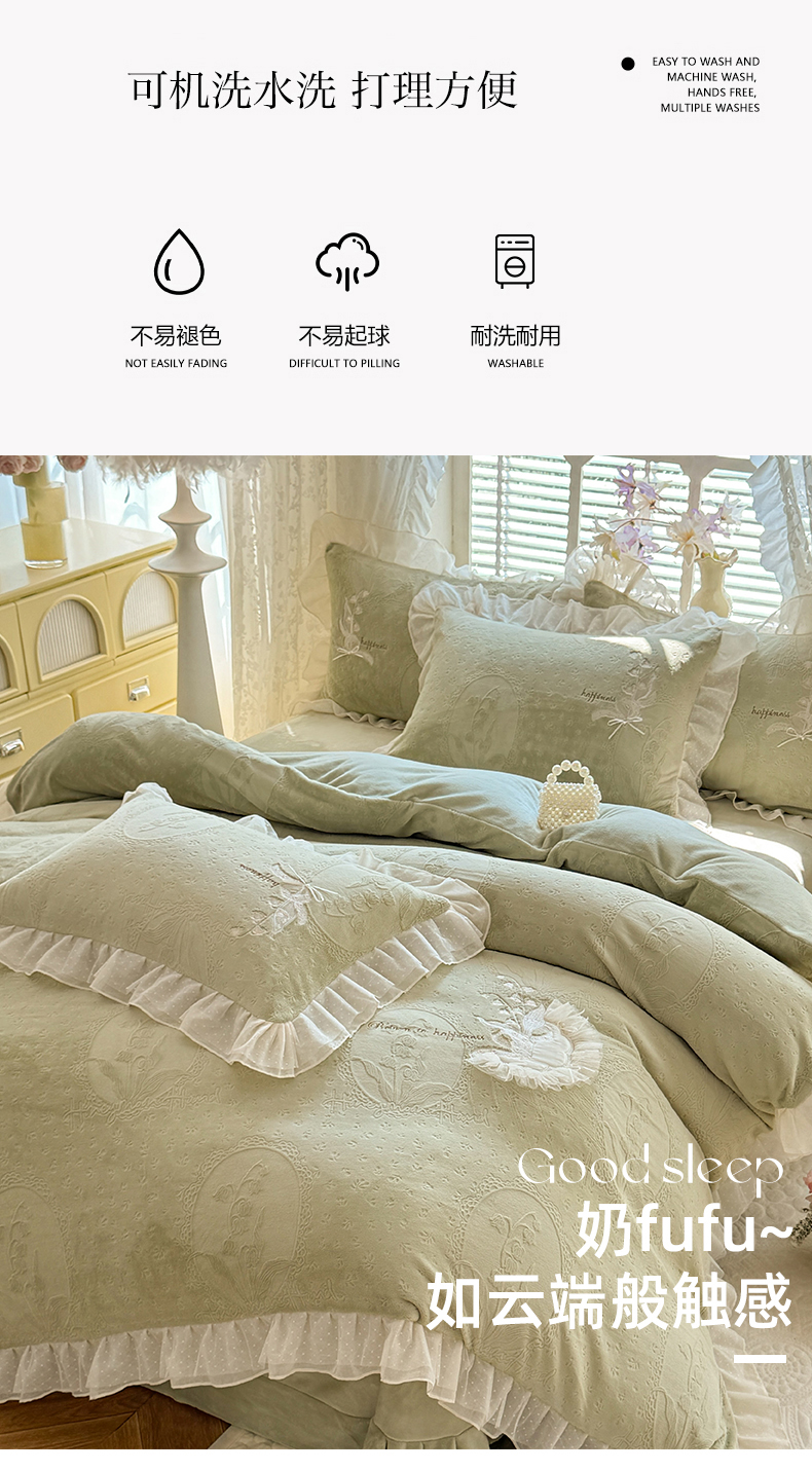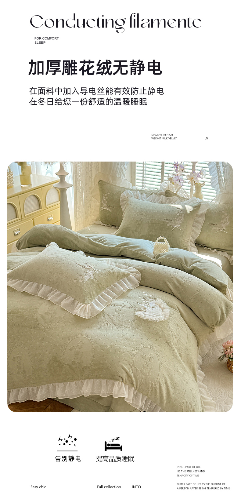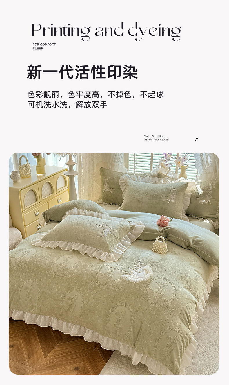 商品名称:艾唯希家纺 2025新款韩版全消光雕花绒花边四件套牛奶绒-铃兰花边系列 铃兰-绿