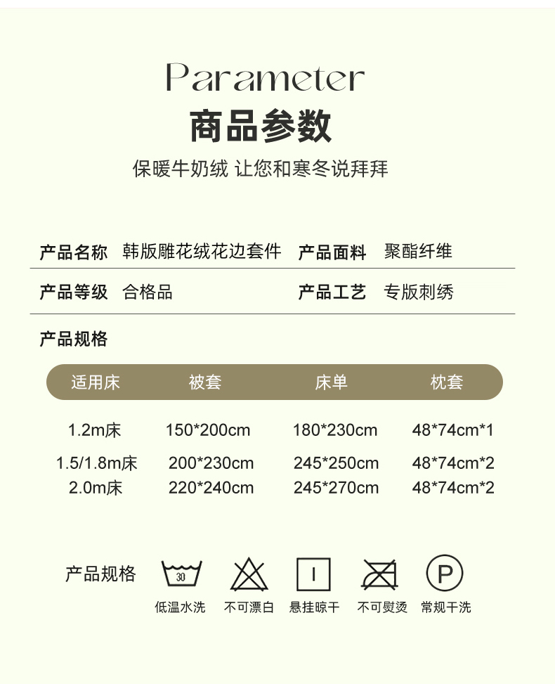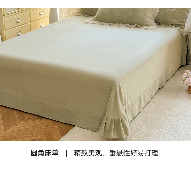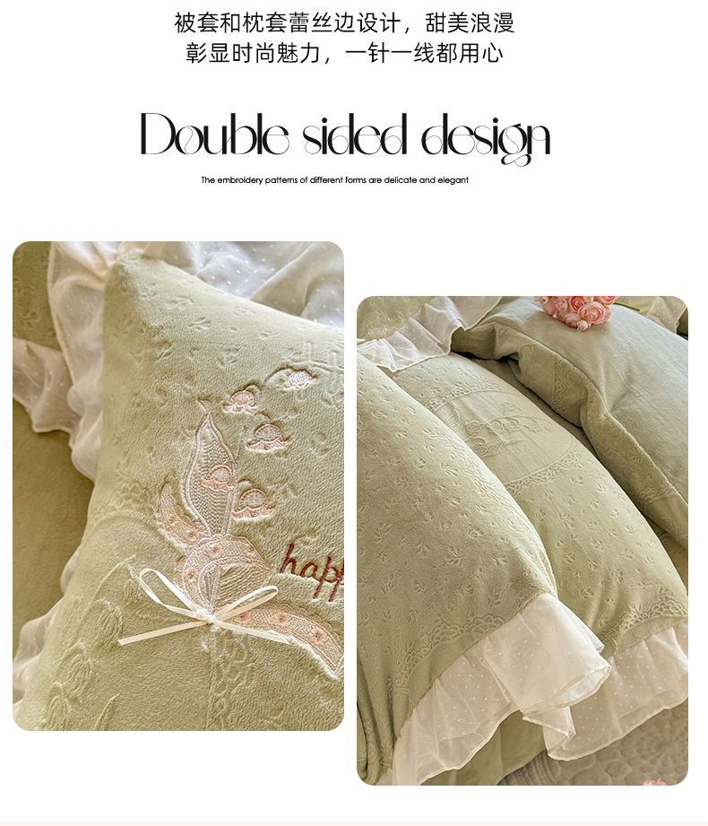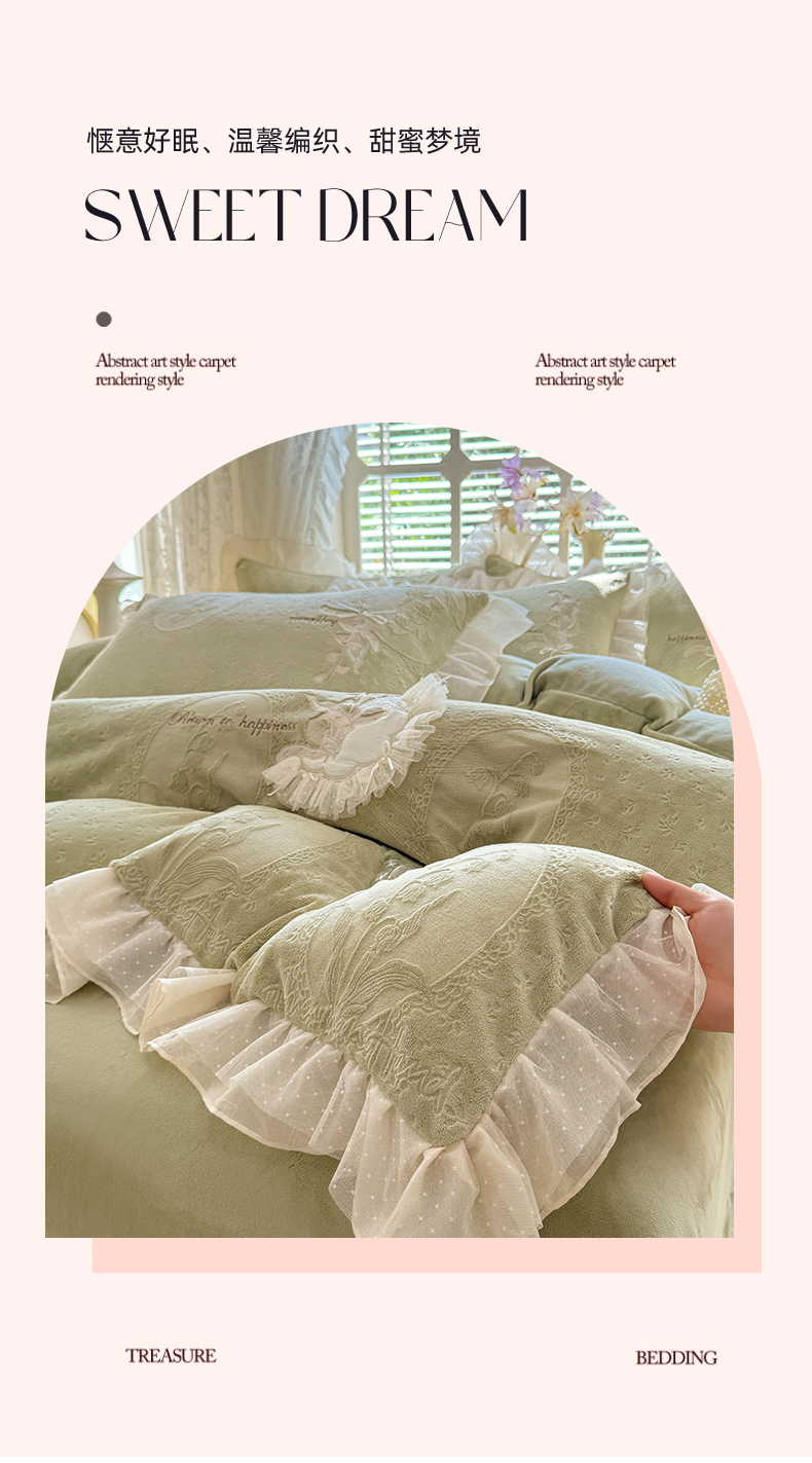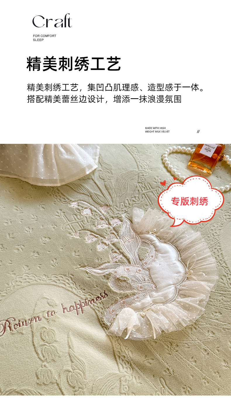 商品名称:艾唯希家纺 2025新款韩版全消光雕花绒花边四件套牛奶绒-铃兰花边系列 铃兰-绿