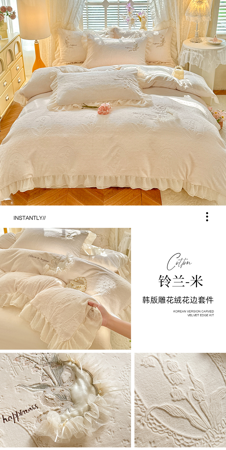 (总)艾唯希家纺 2025新款韩版全消光雕花绒花边四件套牛奶绒-铃兰花边系列,铃兰-绿,铃兰-米,铃兰-粉,铃兰-浅紫,铃兰-蓝