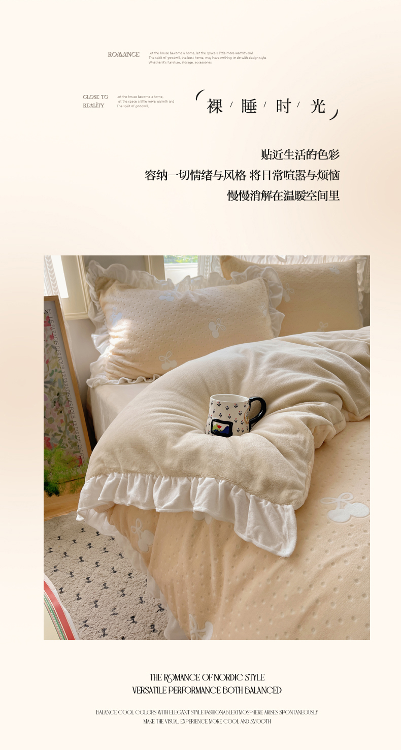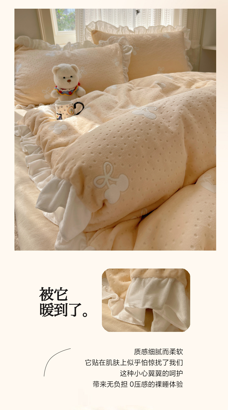 商品名称:三朵家纺 2025新款韩系花边雕花绒牛奶绒法莱绒四件套 茶语山樱-黄
