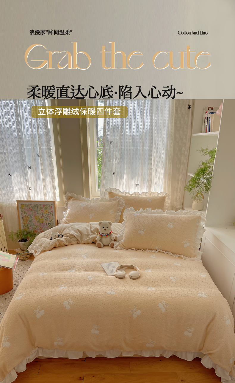 (总)三朵家纺 2025新款3D立体加厚雕花绒牛奶绒花边款四件套,花边宽条-灰色,花边宽条-蓝色,花边宽条-玉色,花边宽条-紫
