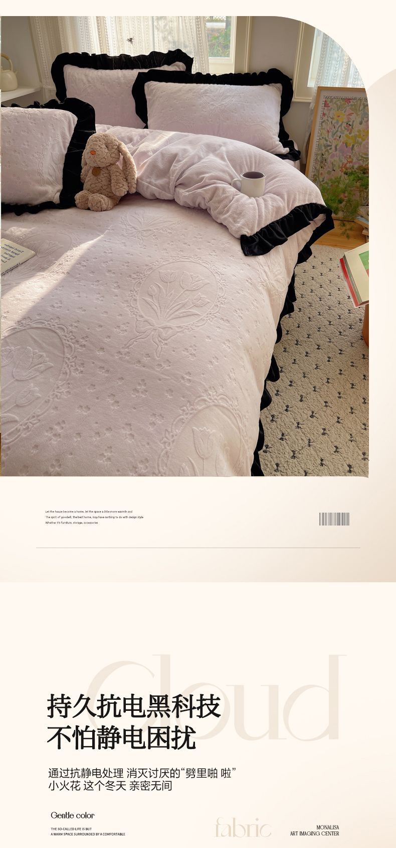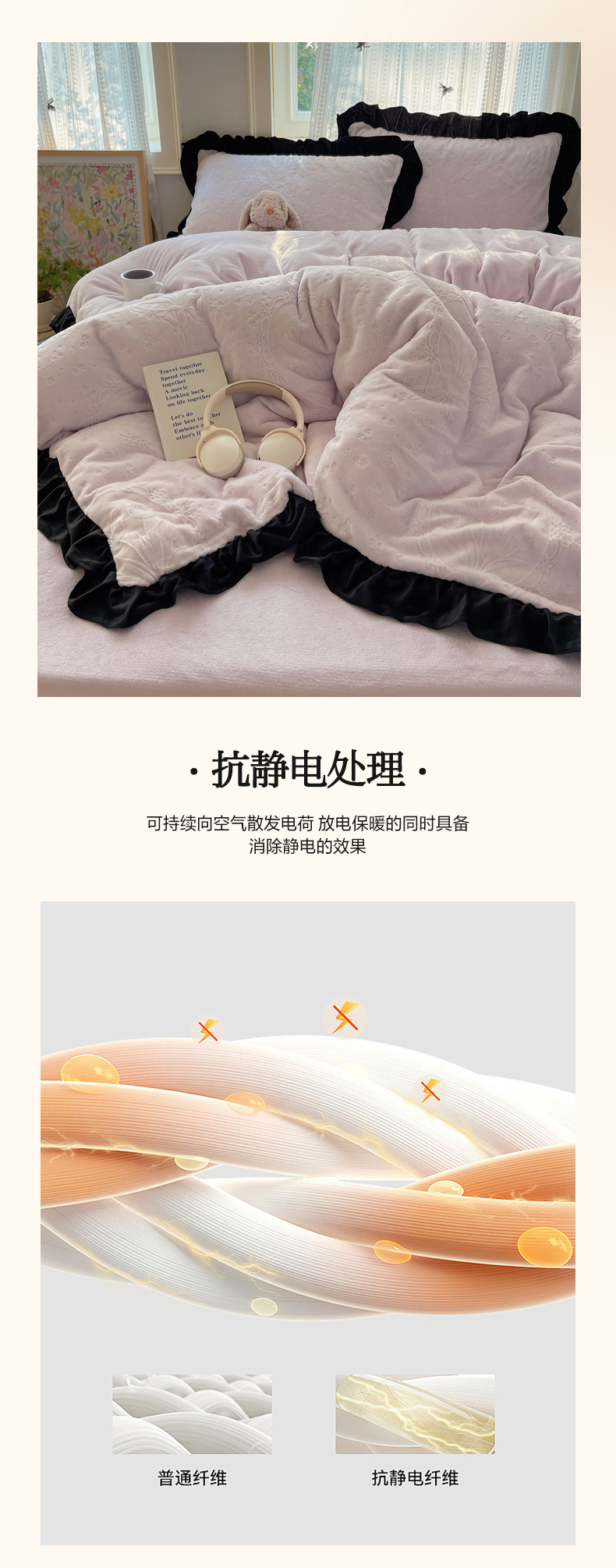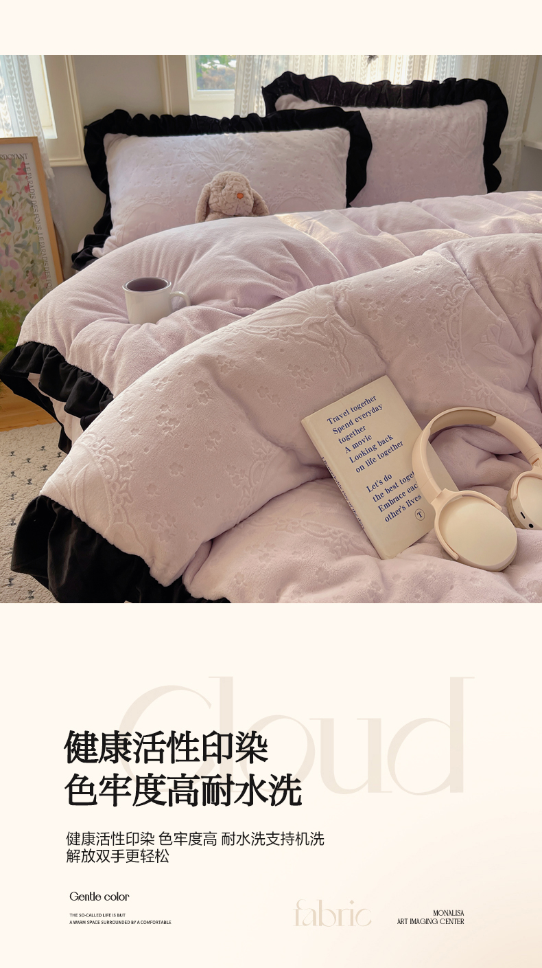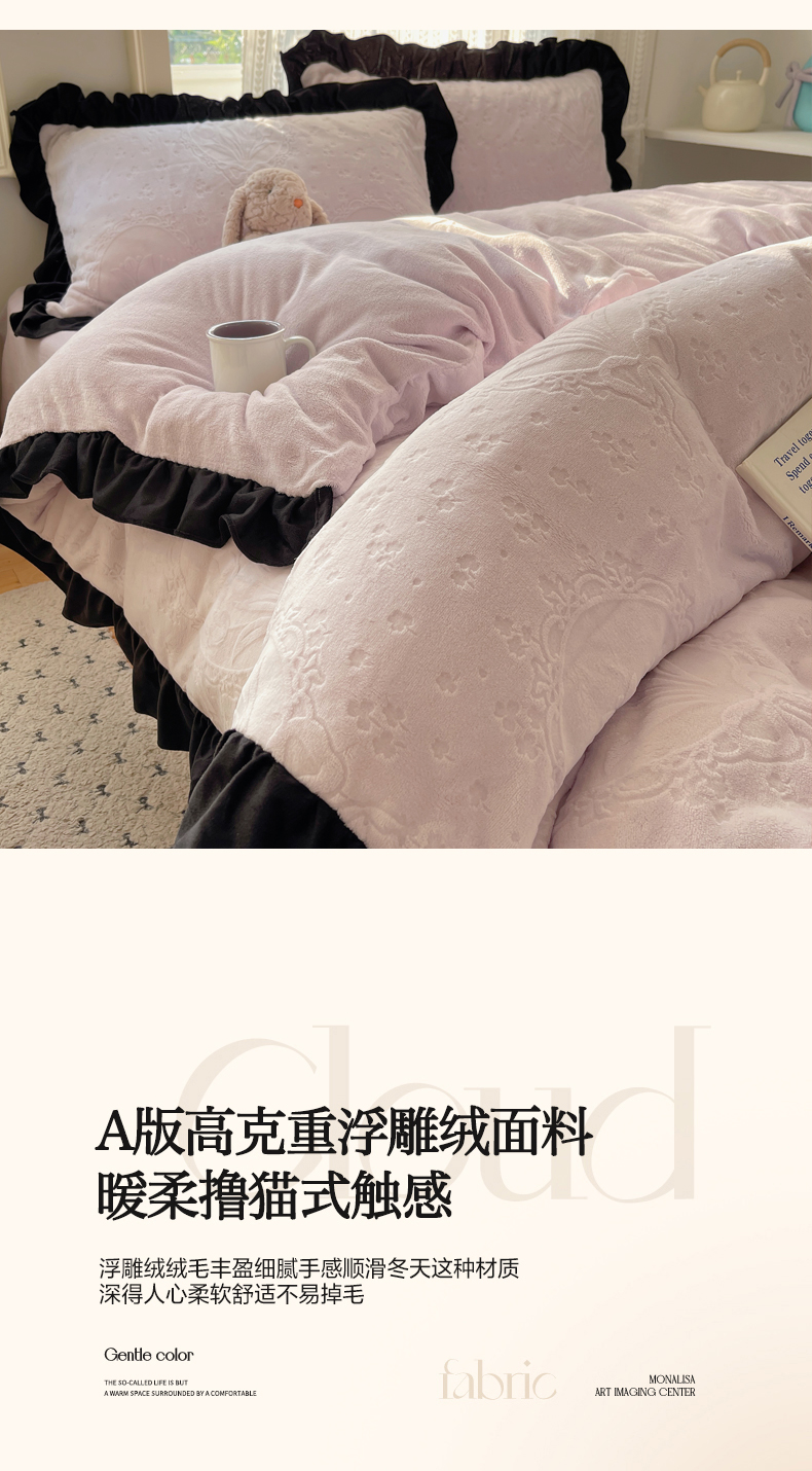 (总)三朵家纺 2025新款3D立体加厚雕花绒牛奶绒花边款四件套,花边宽条-灰色,花边宽条-蓝色,花边宽条-玉色,花边宽条-紫