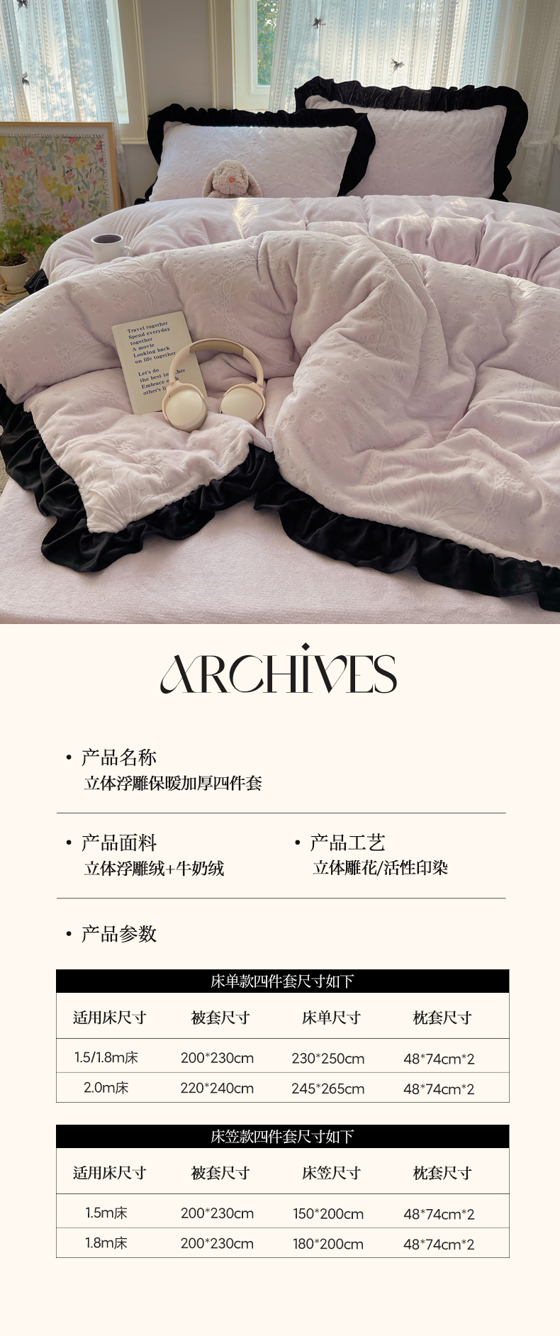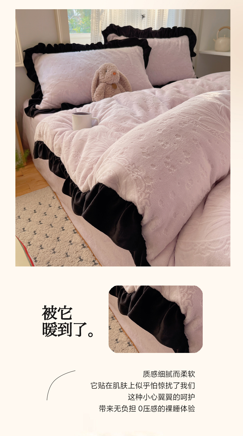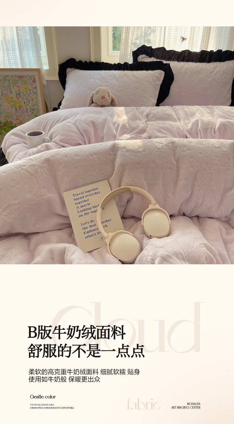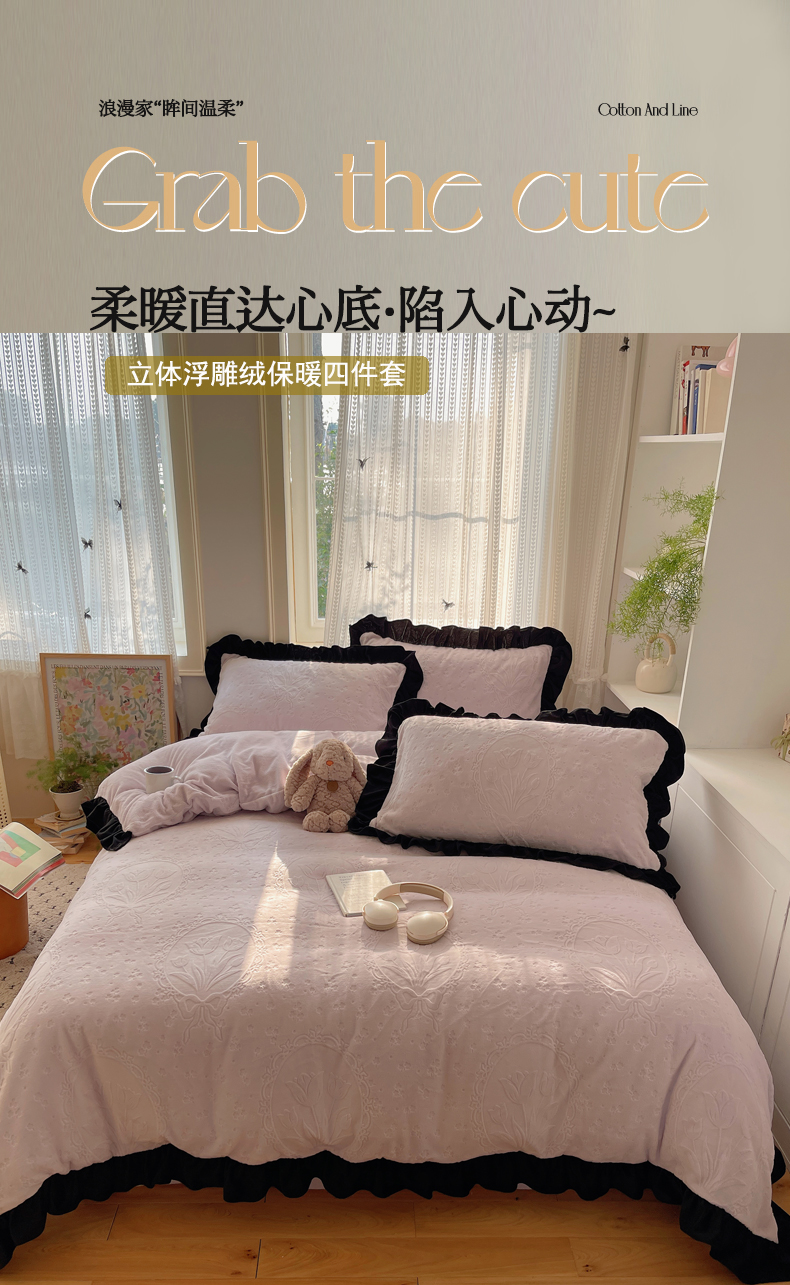 (总)三朵家纺 2025新款3D立体加厚雕花绒牛奶绒花边款四件套,花边宽条-灰色,花边宽条-蓝色,花边宽条-玉色,花边宽条-紫