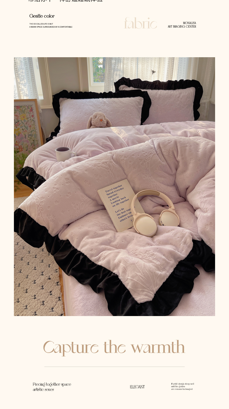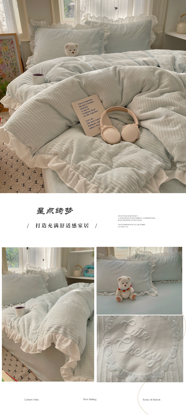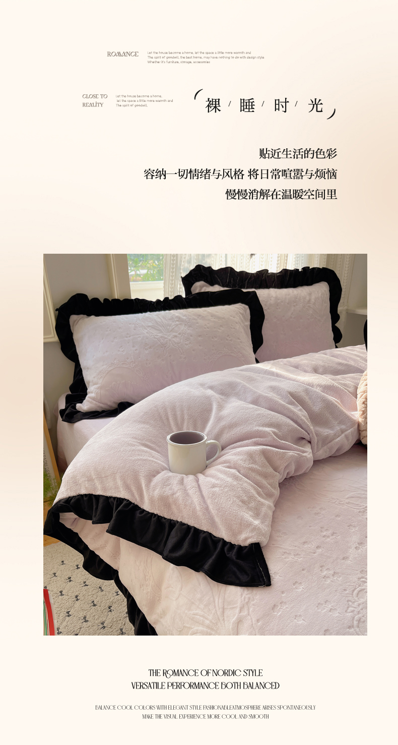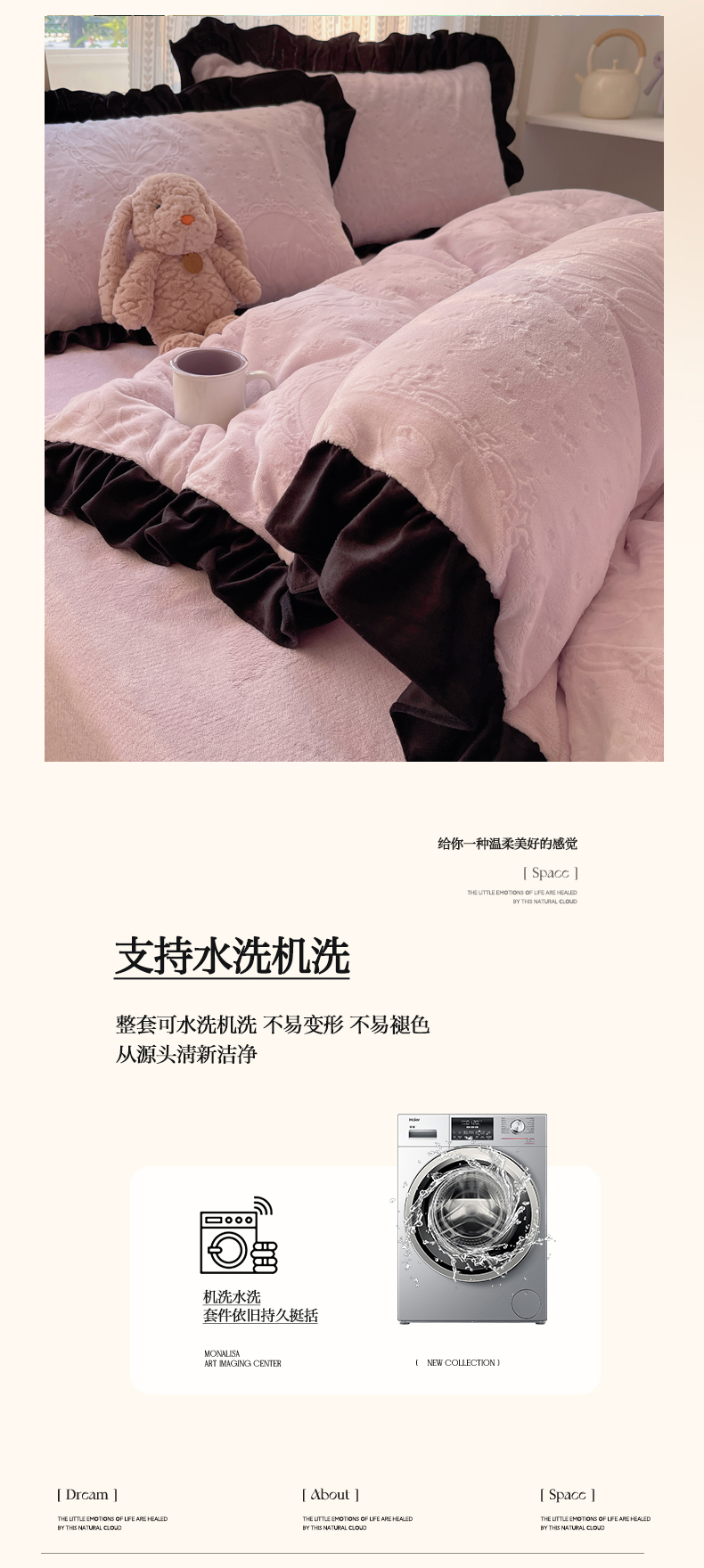 (总)三朵家纺 2025新款3D立体加厚雕花绒牛奶绒花边款四件套,花边宽条-灰色,花边宽条-蓝色,花边宽条-玉色,花边宽条-紫