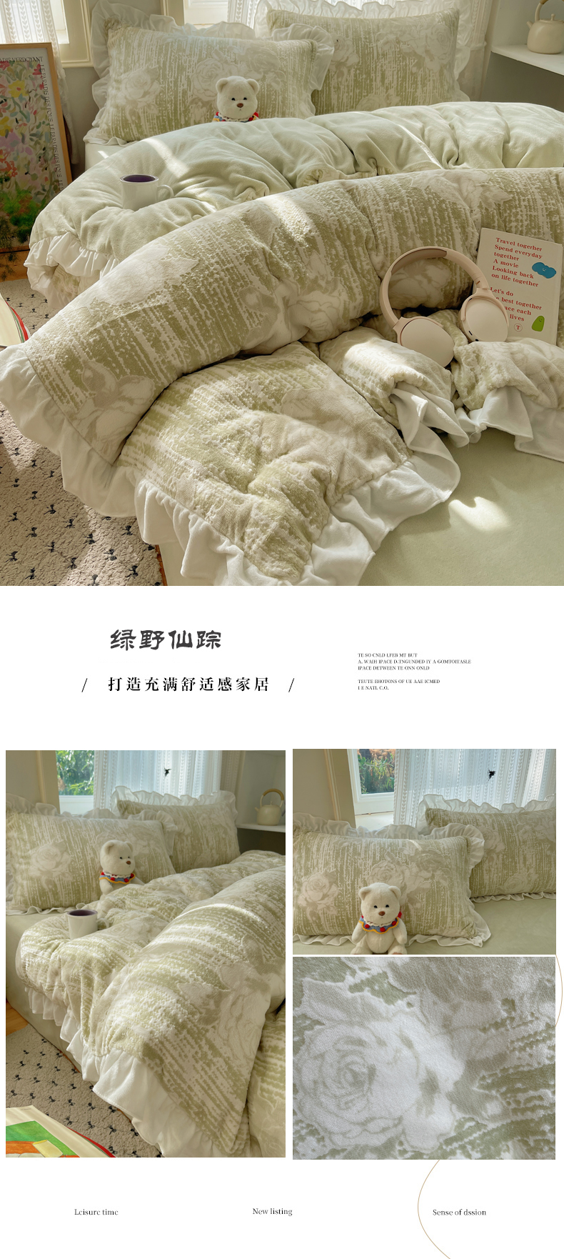 商品名称:三朵家纺 2025新款韩系花边雕花绒牛奶绒法莱绒四件套 屋顶花园-紫