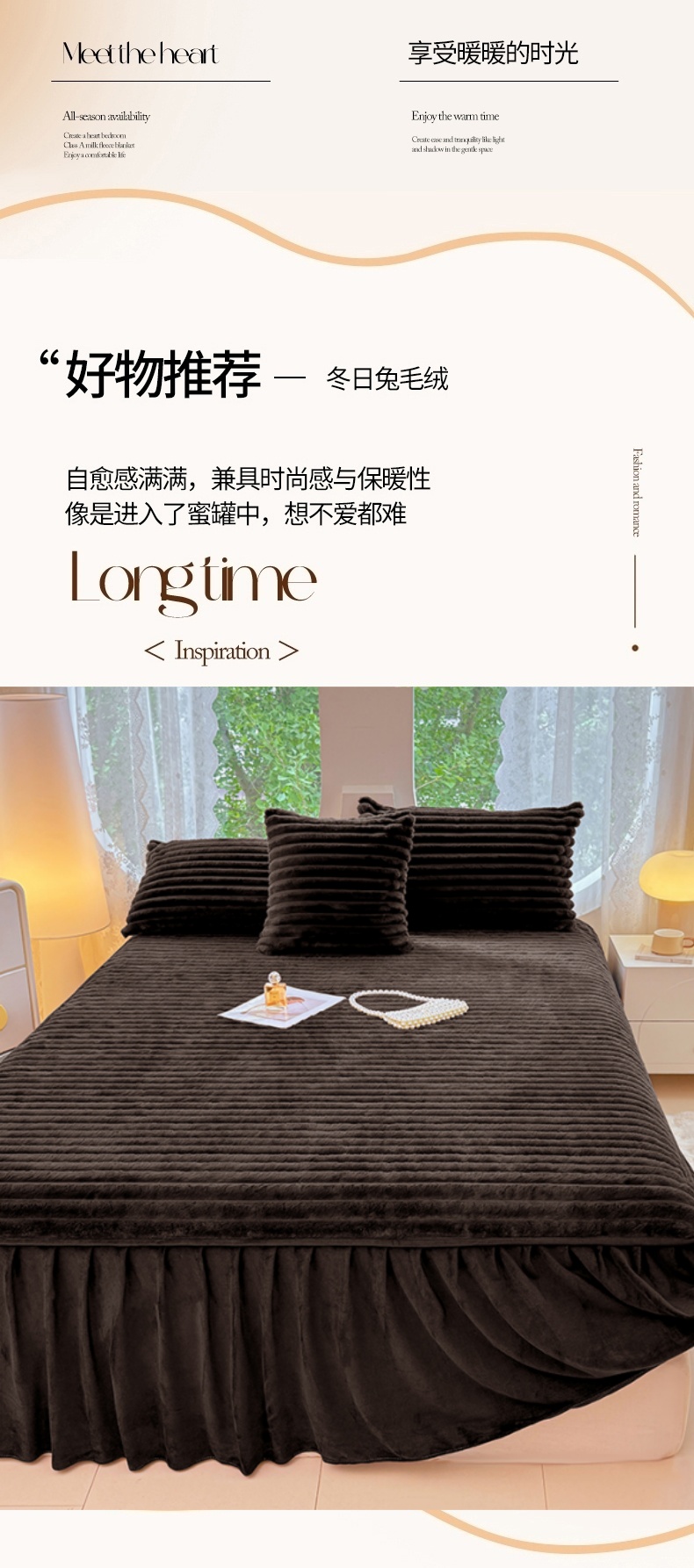 商品名称:圣比熊 2025新款兔毛绒床裙法兰绒床垫保护罩牛奶绒床垫法莱绒床单罩-抽条 兔毛绒抽条-咖啡色