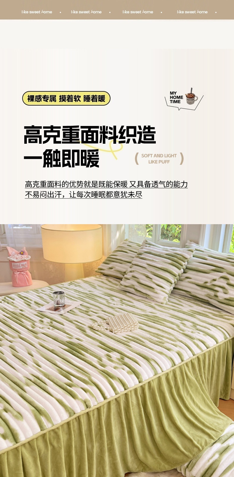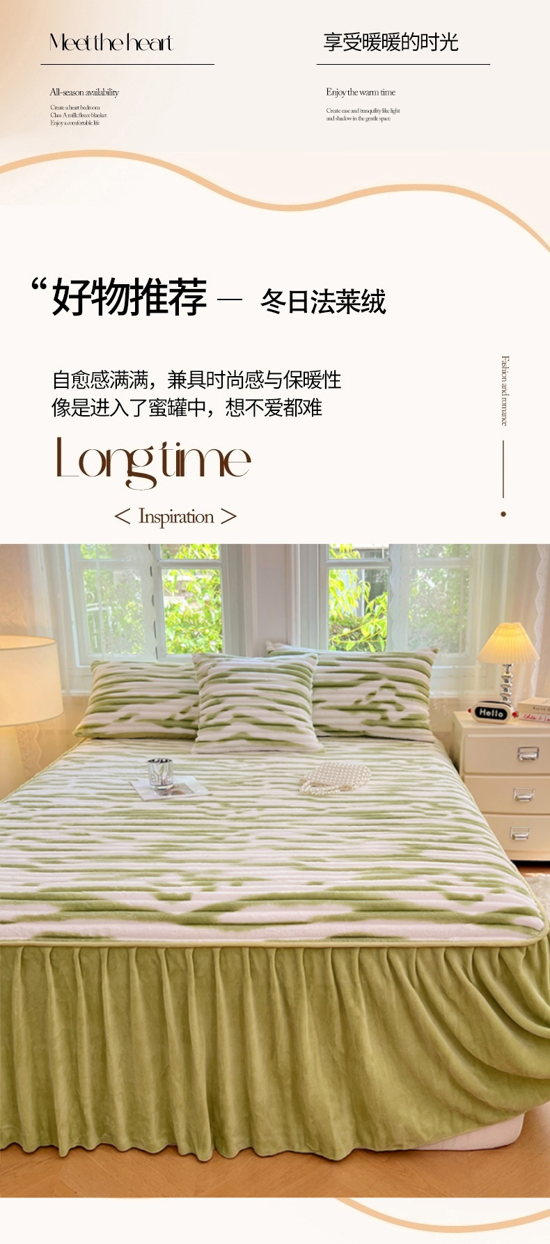 • 91家纺网 家纺一手货源 找家纺 梦舒羽 2025新款法莱绒床裙法兰绒床垫保护罩牛奶绒兔毛绒床垫床单罩-抽条 法莱绒抽条-梦幻果绿