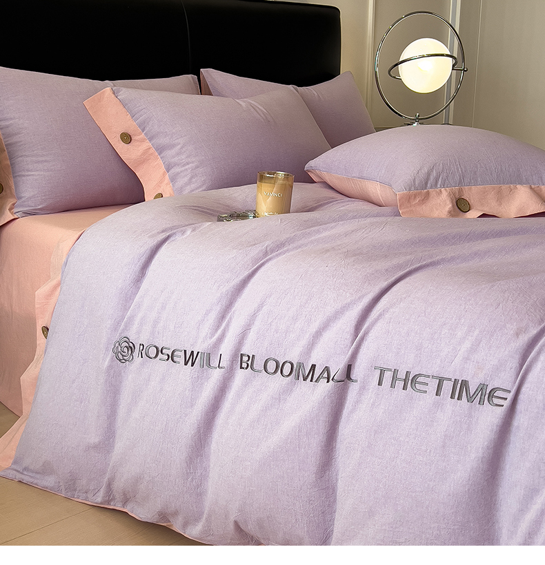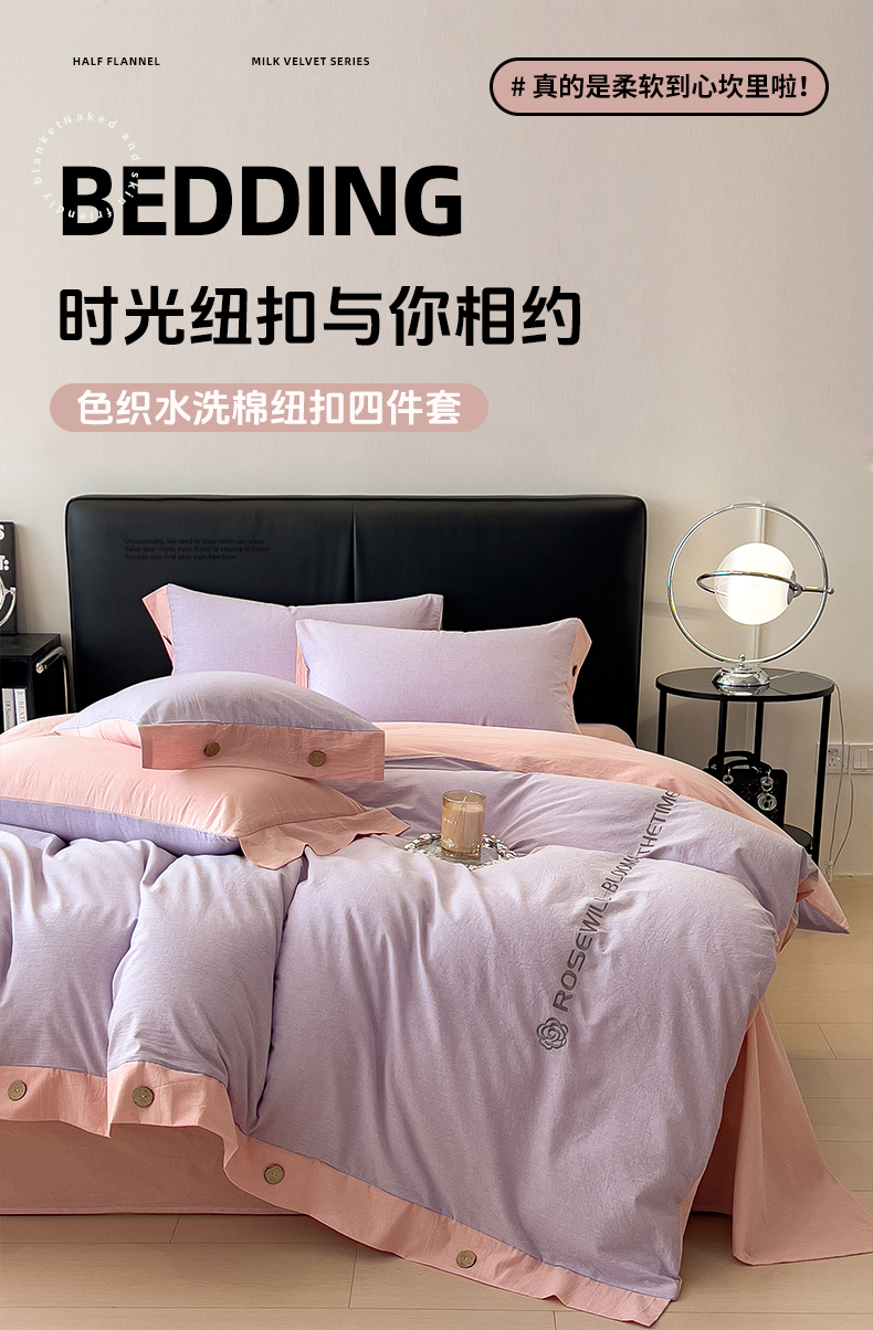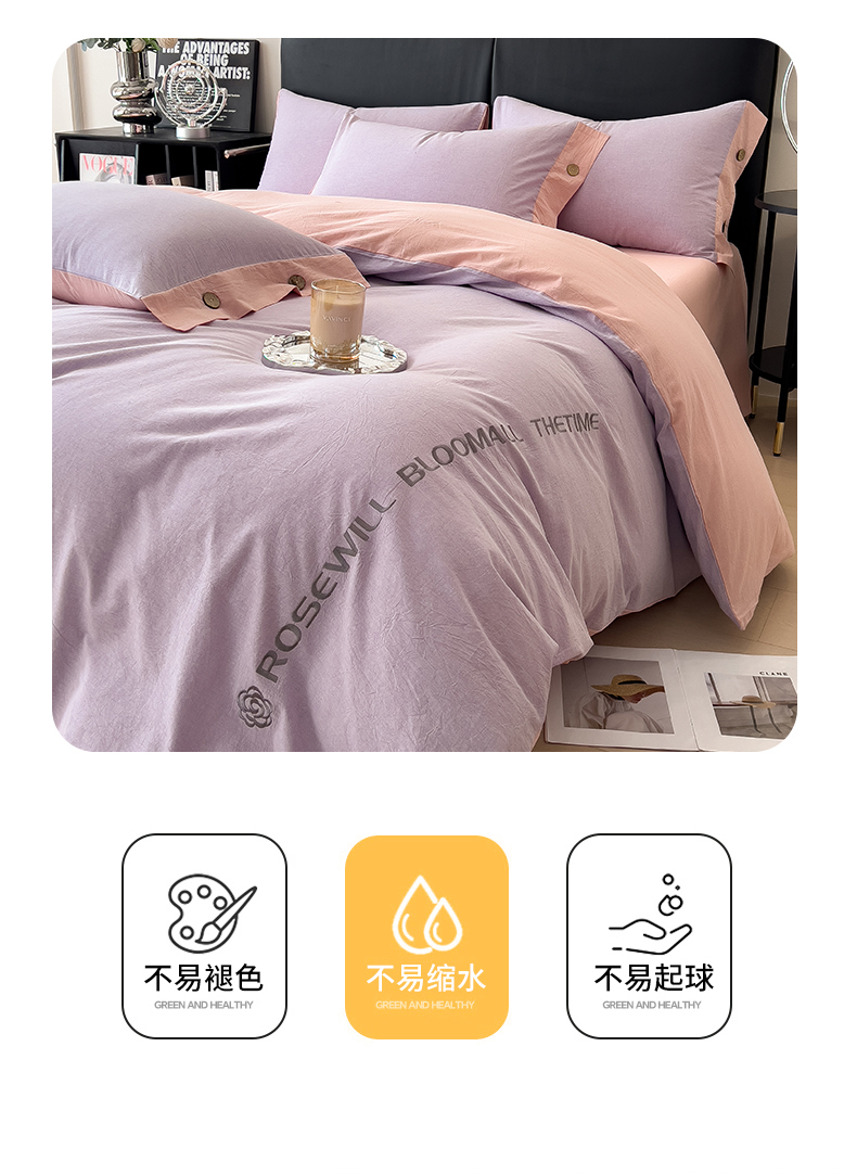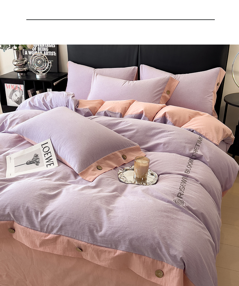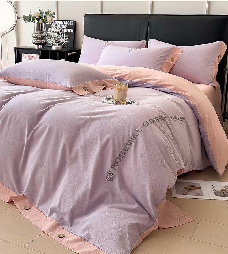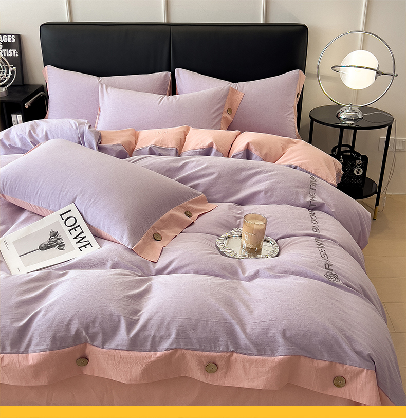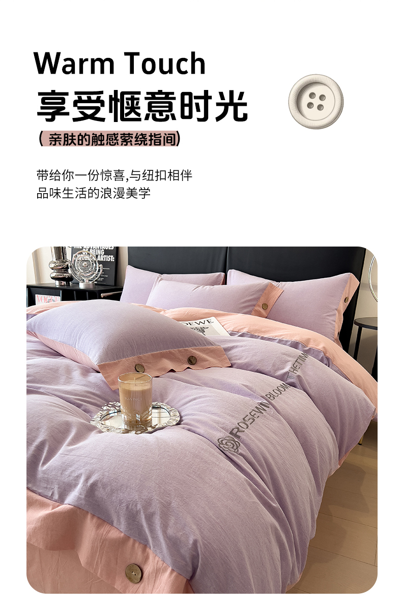 芃成家纺 2025新款A类全棉色织水洗棉纽扣绣花四件套 纽扣款-浅紫拼浅粉