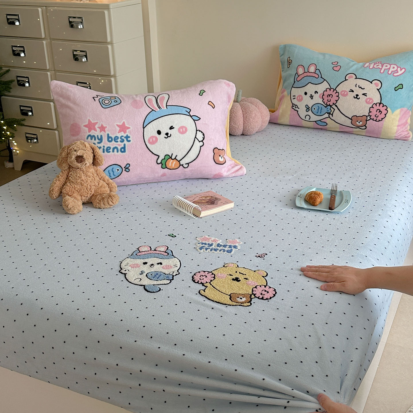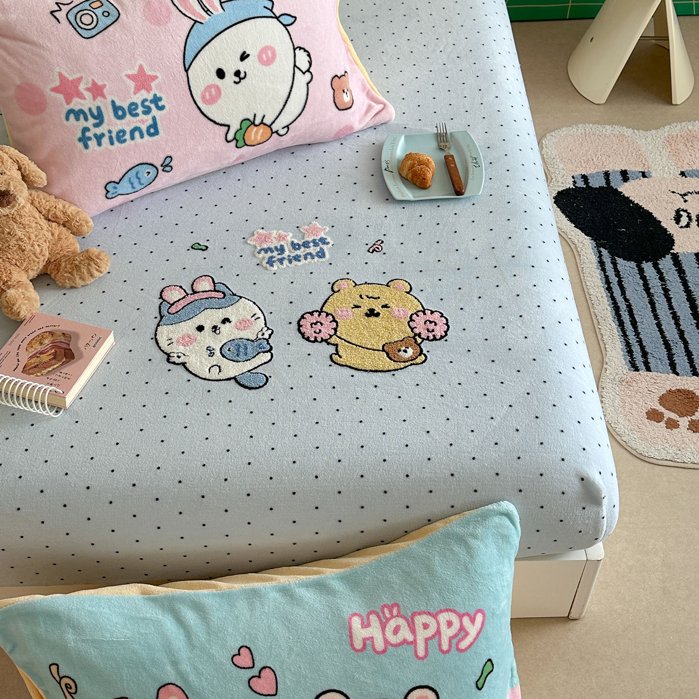 (总)柚子YOUTH 2025新款双面泰迪绒毛巾绣四件套,甜甜圈,快乐企鹅,森林聚会,甜酷KT,小茄子,雪人王国
