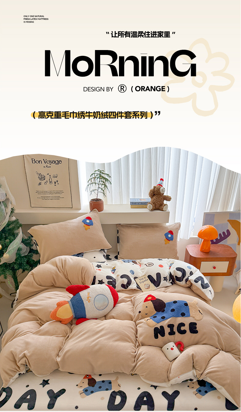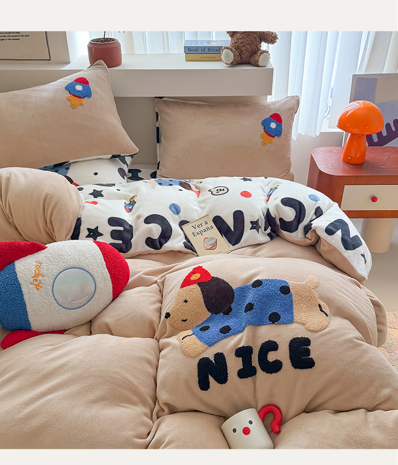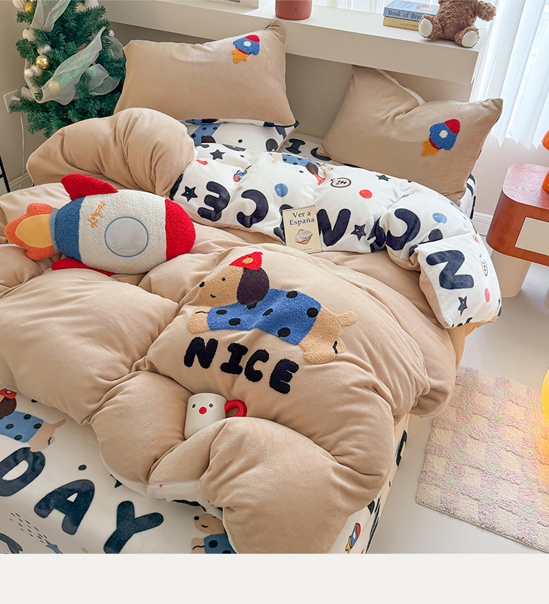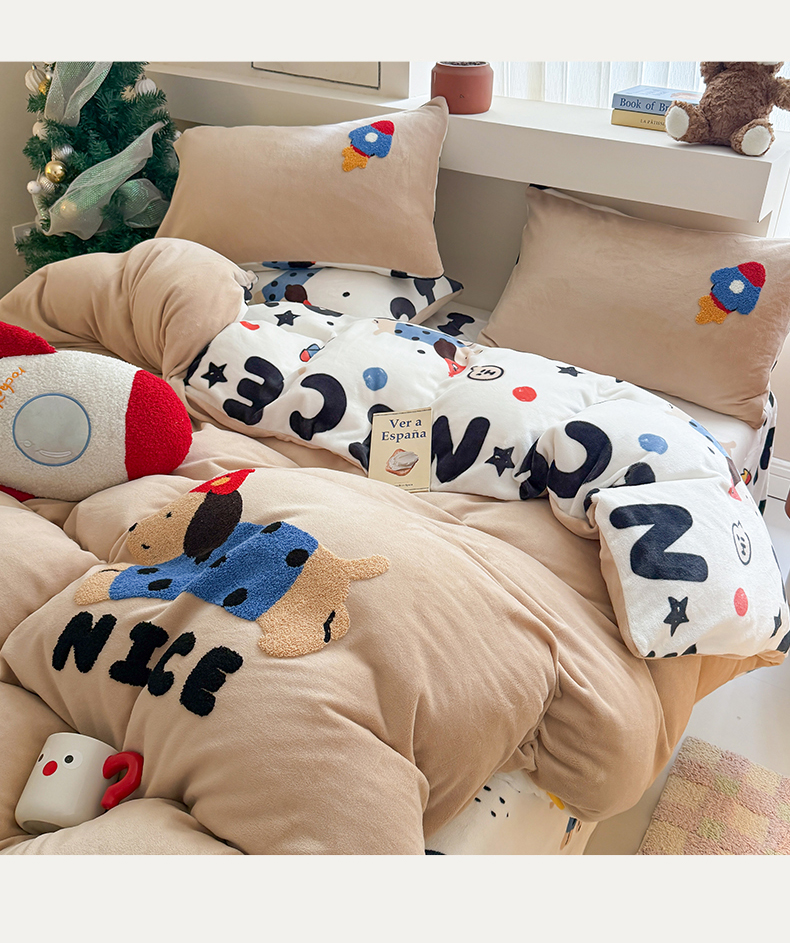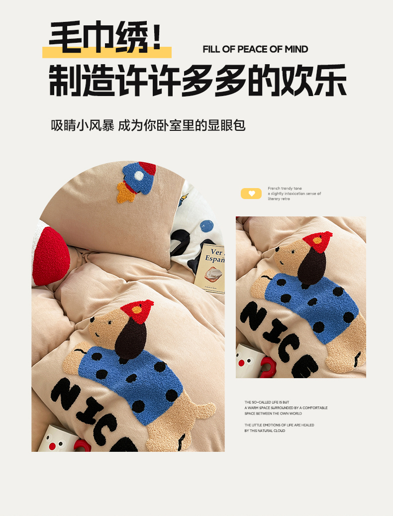 商品名称:艾特你 2025新款毛巾绣200克牛奶绒卡通毛巾绣四件套 快乐小狗
