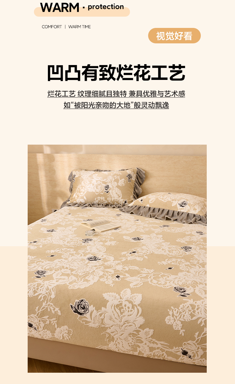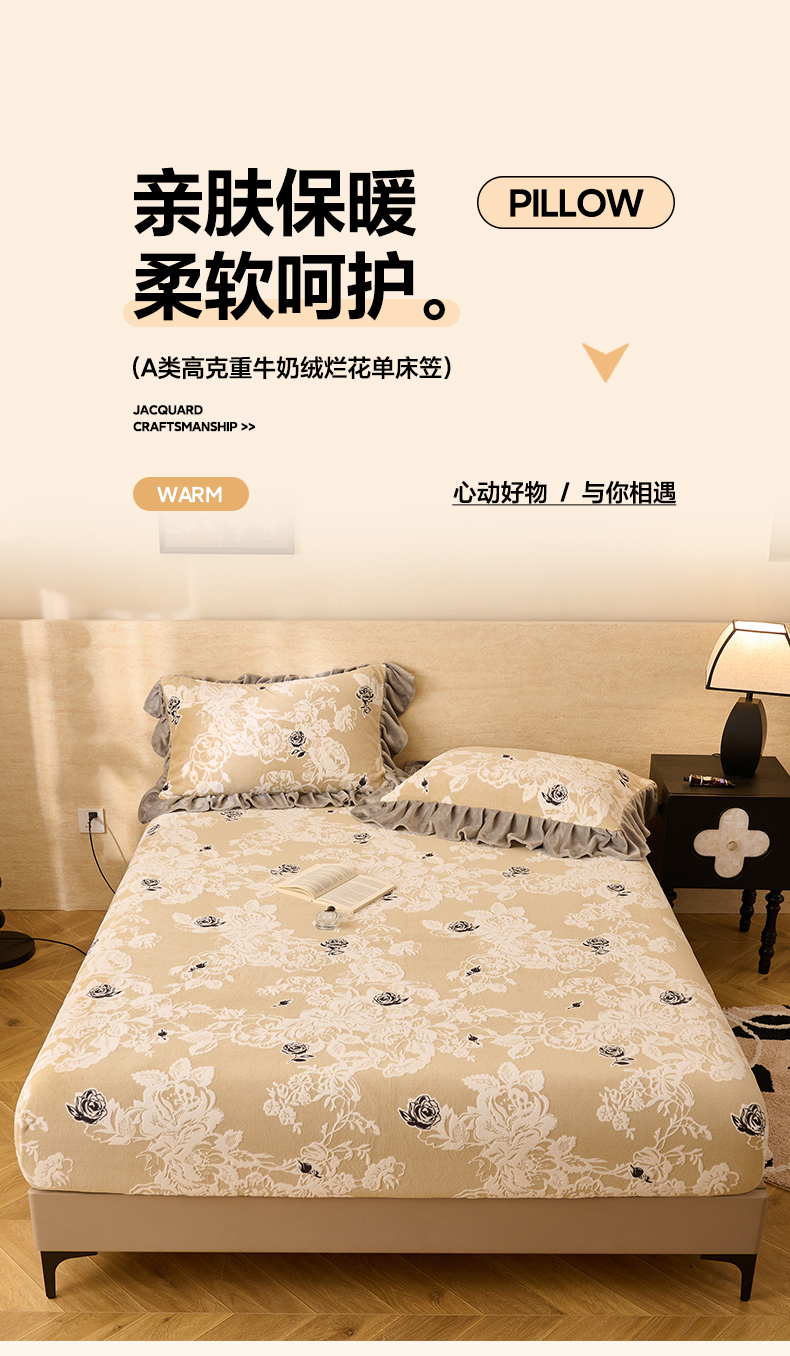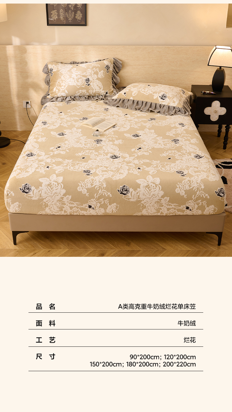 • 91家纺网 家纺一手货源 找家纺 早晨家纺 2025新款高克重牛奶绒烂花单床笠 雅庭花叙