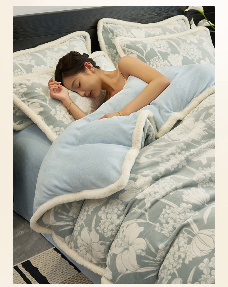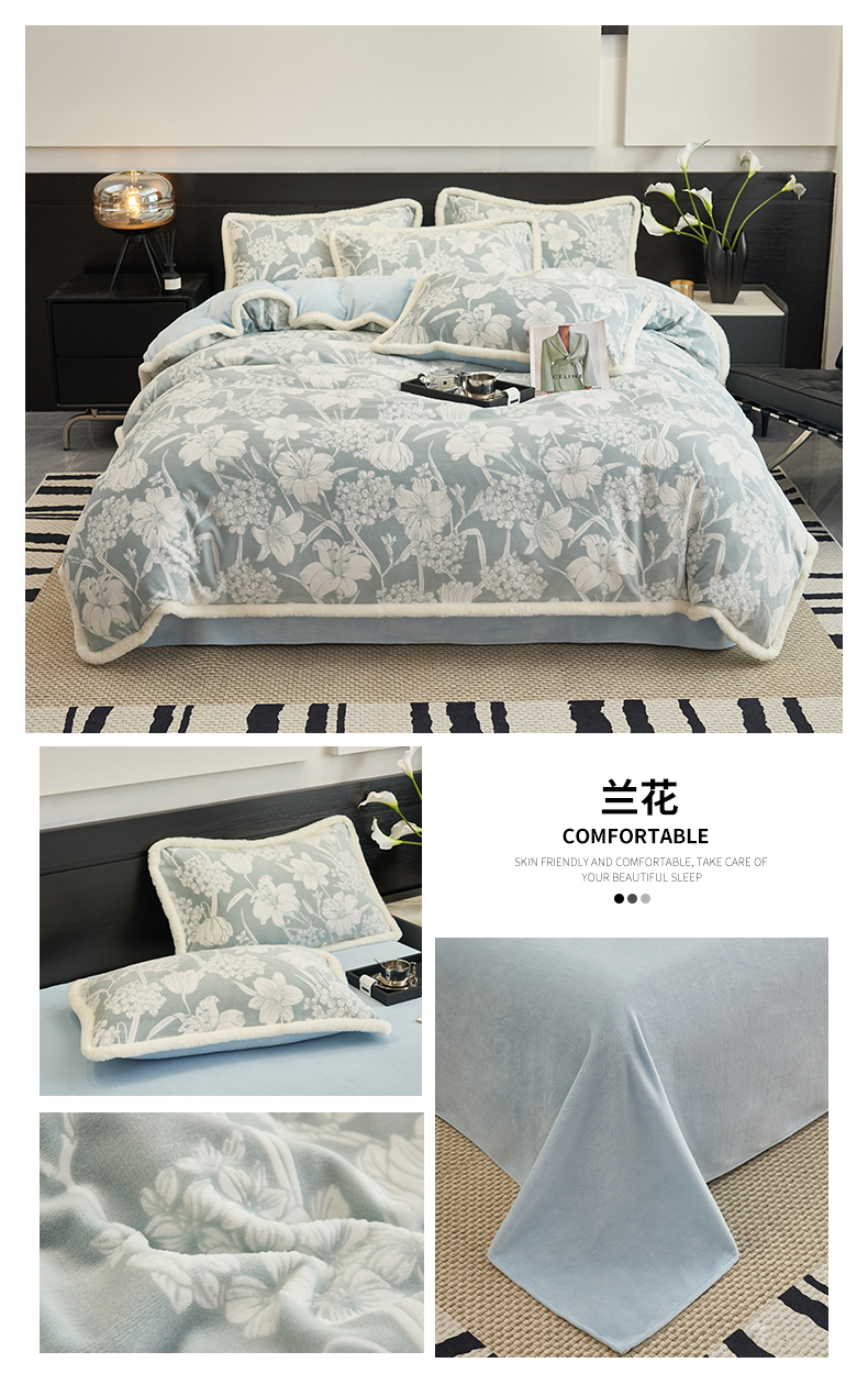 (总)金鹰 2025新款A类雕花牛奶绒烂花兔毛包边四件套,羽毛,波澜壮阔,繁花,蝴蝶梦,简爱,兰花,玫瑰物语,梦幻森林,清晨玫瑰,羽叶,仲夏晨歌