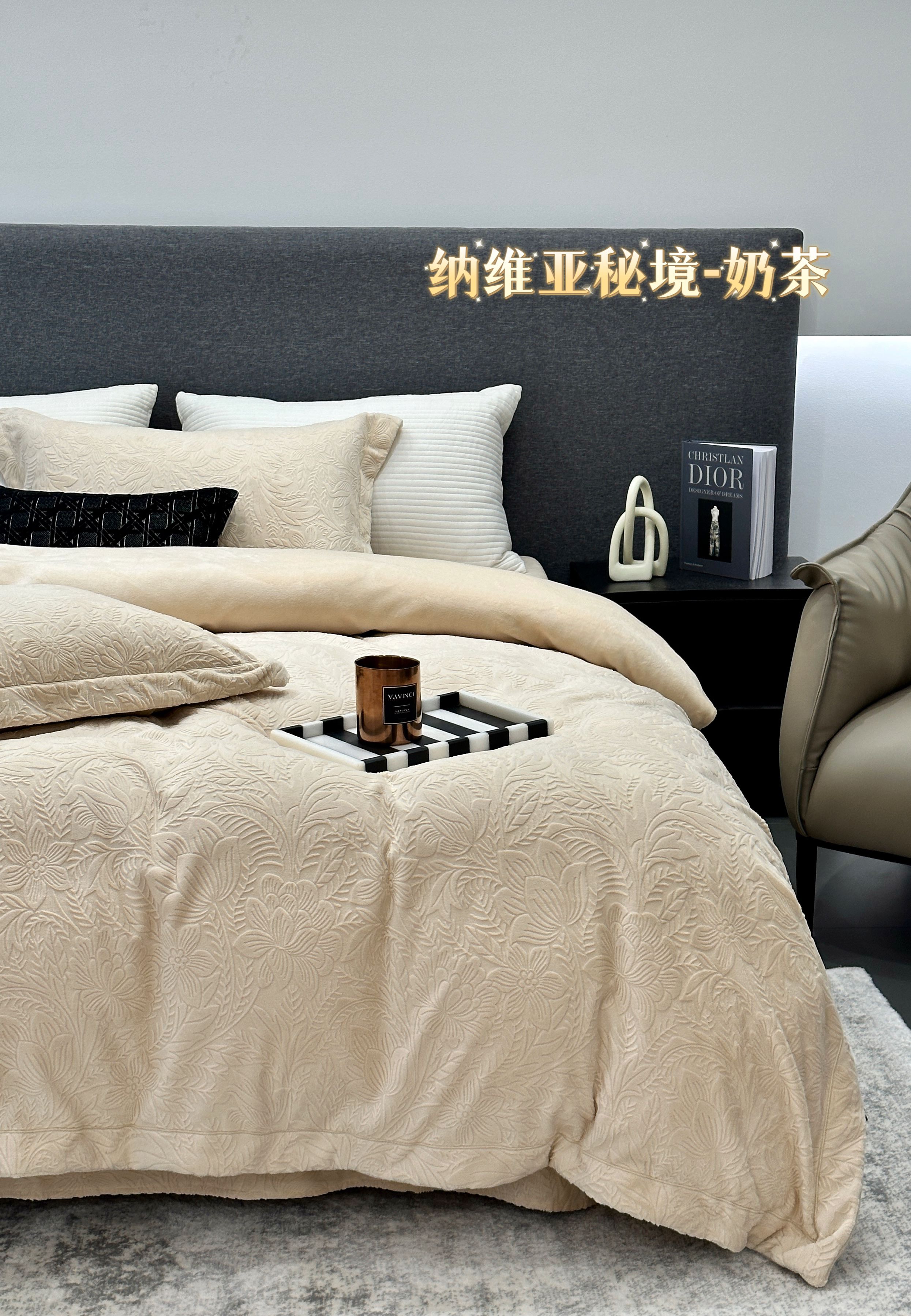 商品名称:JUICY 橘滋家纺 2025新款高级简约立体提花浮雕牛奶绒系列四件套 纳维亚秘境-奶茶