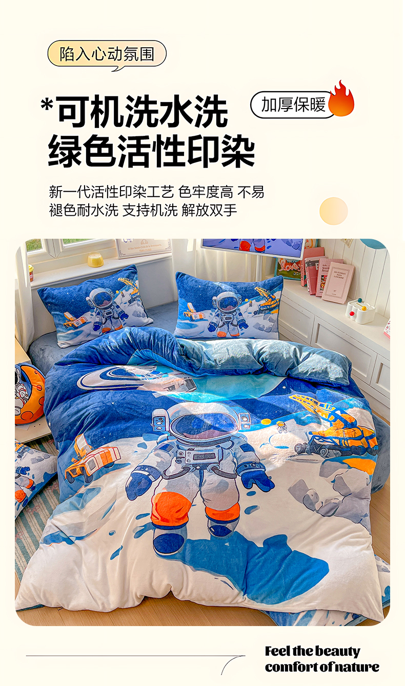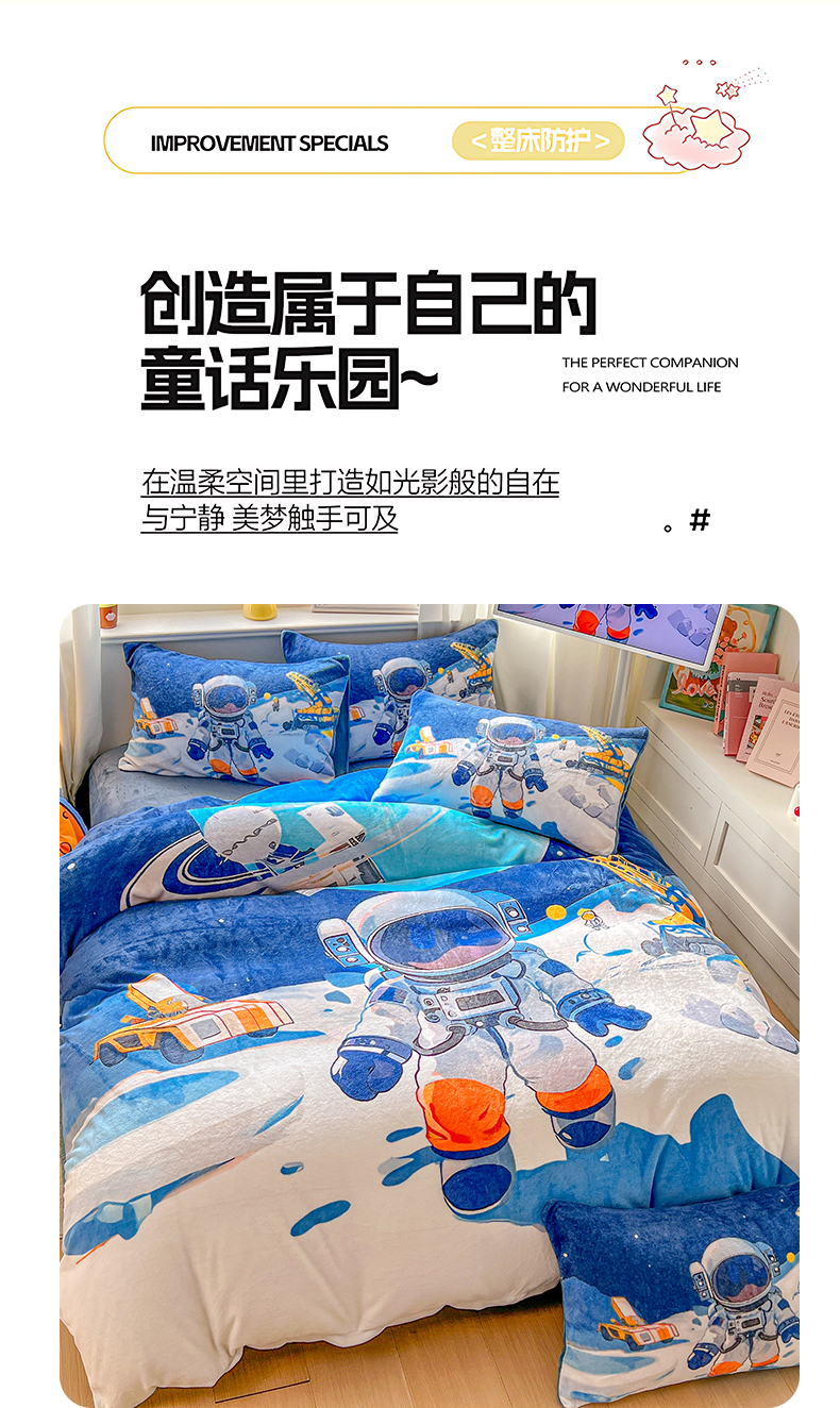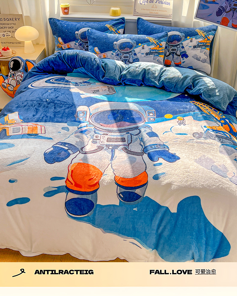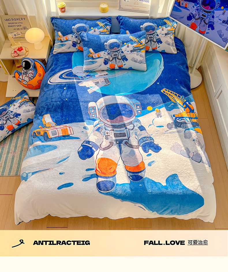 当前位置: 91家纺网 > 商品网购 > 床品套件 > 四件套 > 牛奶绒四件套 > 浩诚 2025新款高克重原创设计宇航员太空人牛奶绒大版卡通四件套 星际工程