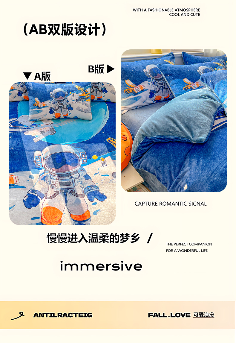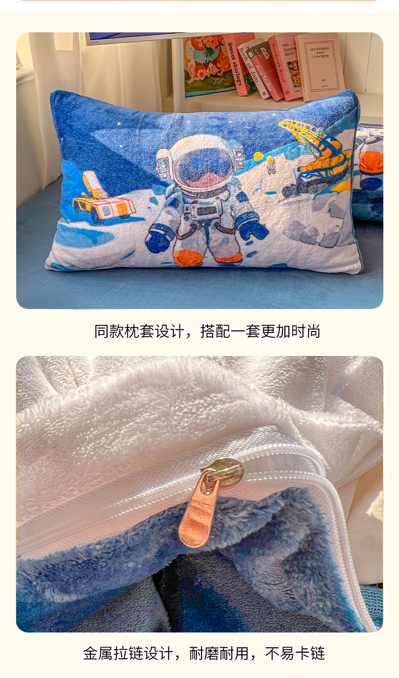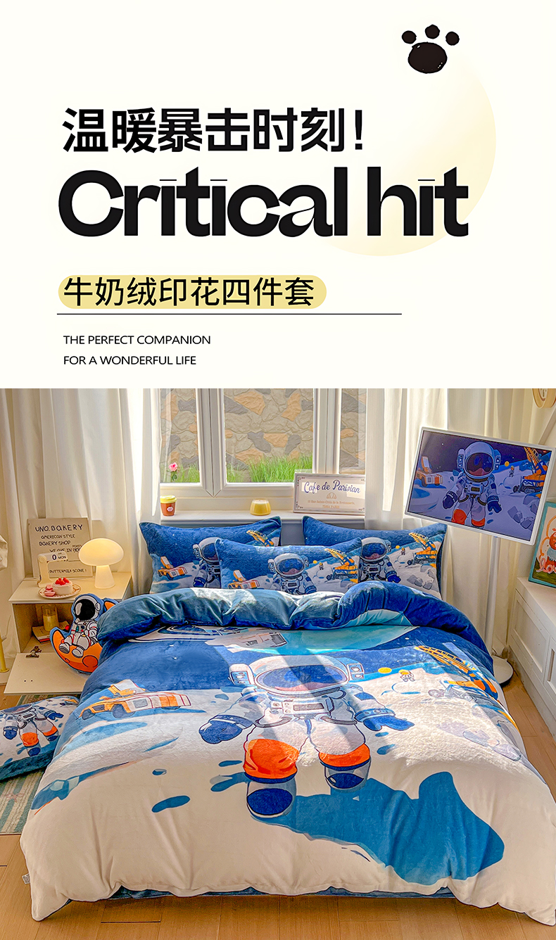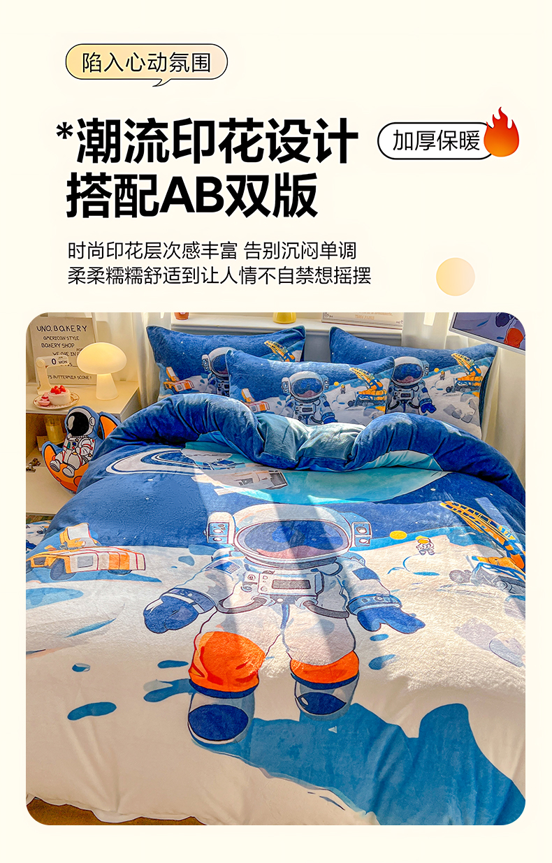 当前位置: 91家纺网 > 商品网购 > 床品套件 > 四件套 > 牛奶绒四件套 > 浩诚 2025新款高克重原创设计宇航员太空人牛奶绒大版卡通四件套 星际工程