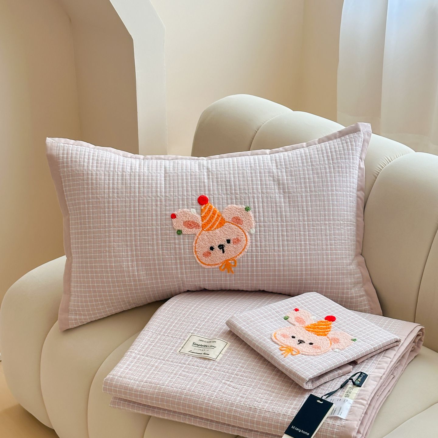 觅糖家纺 2025新款色织水洗棉毛巾绣床盖四件套 蘑菇兔