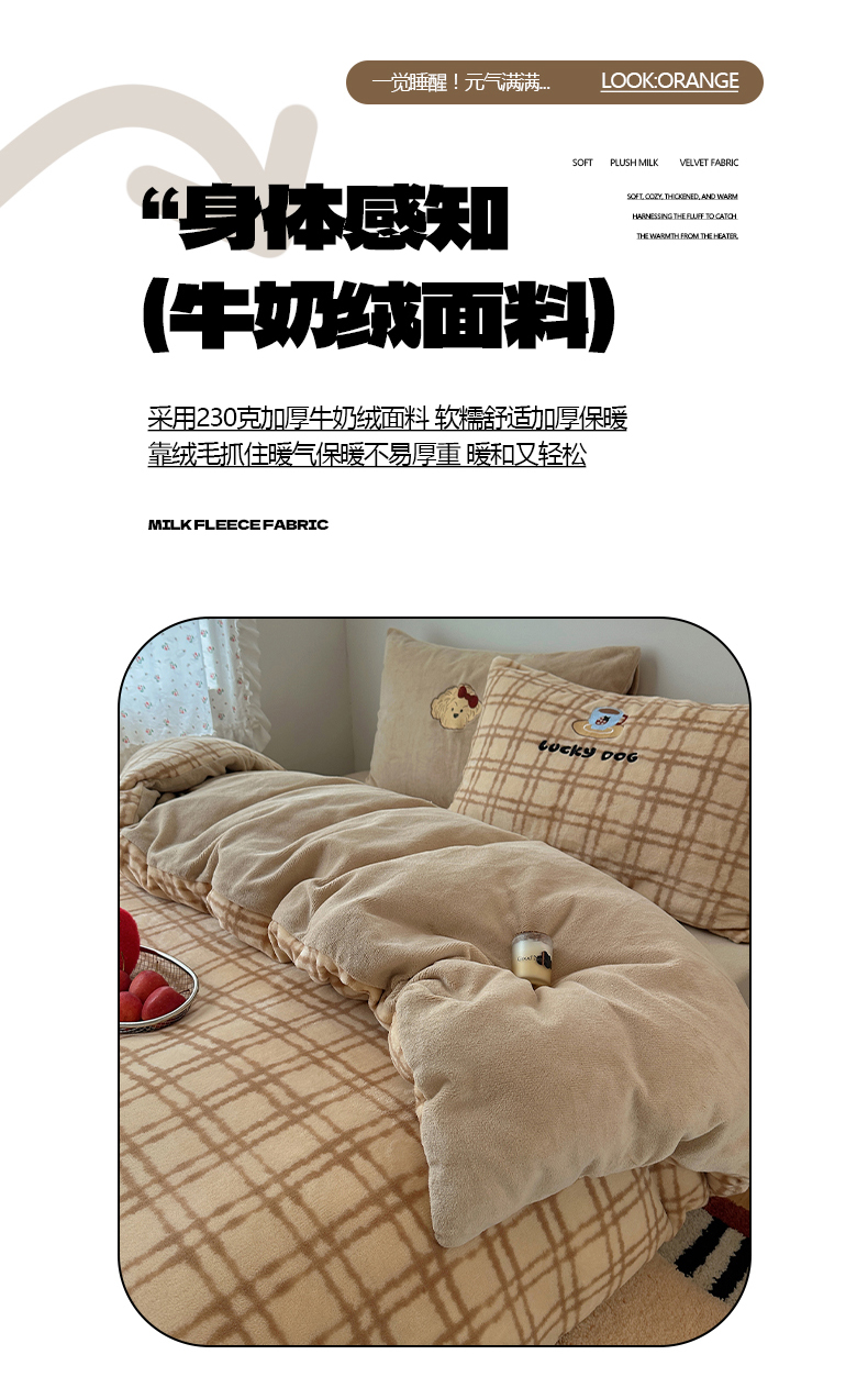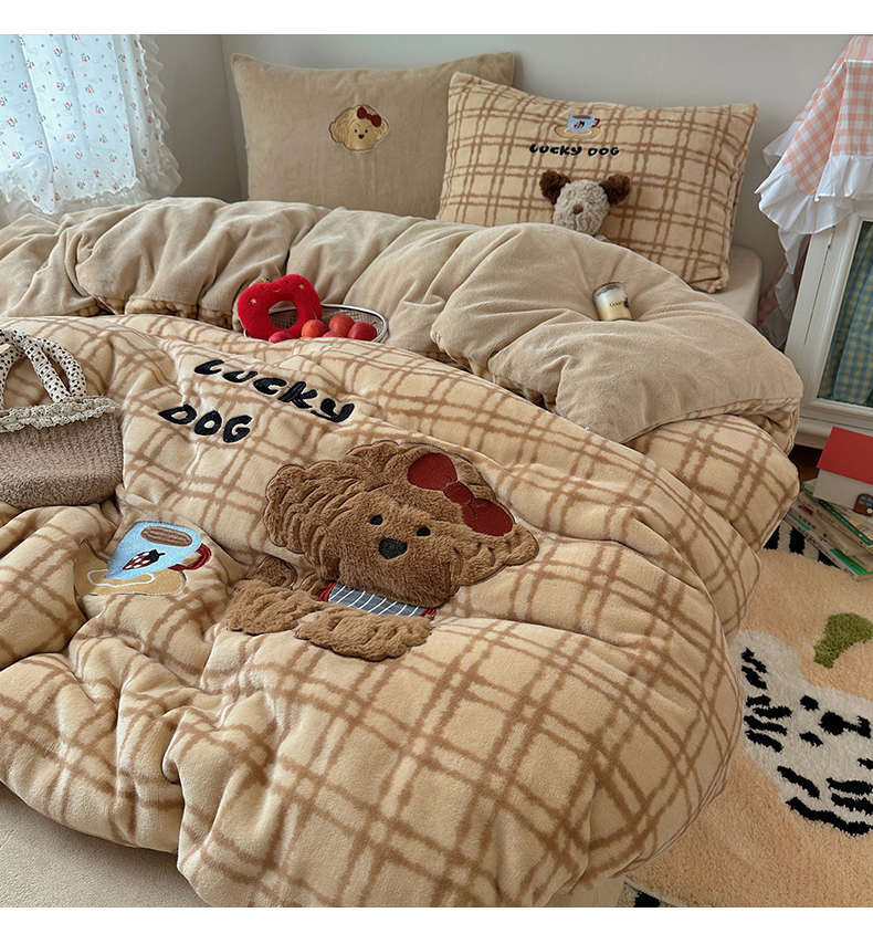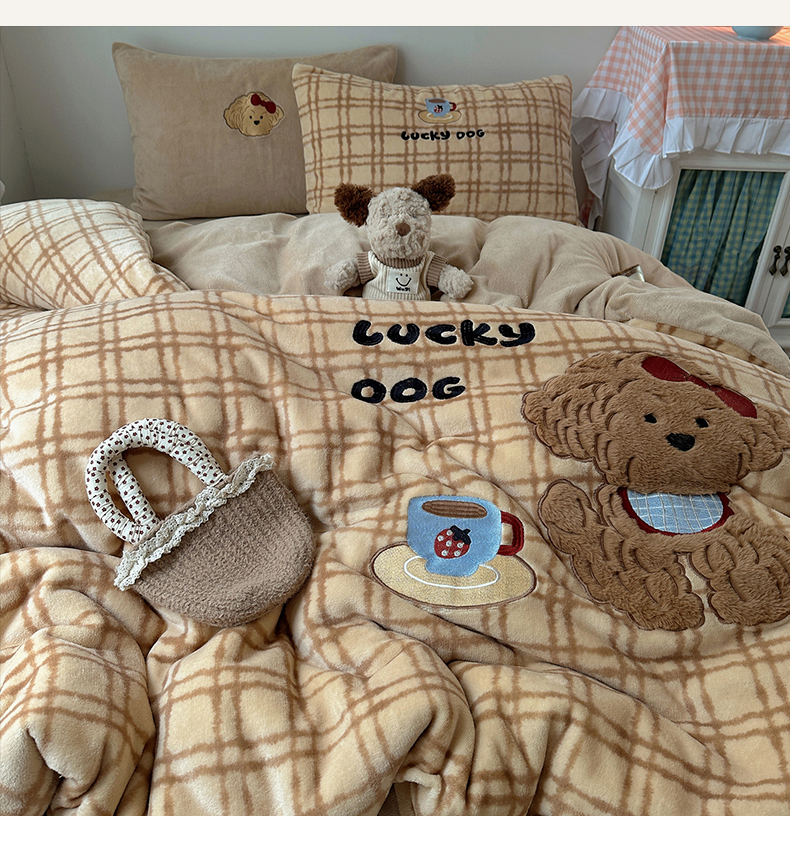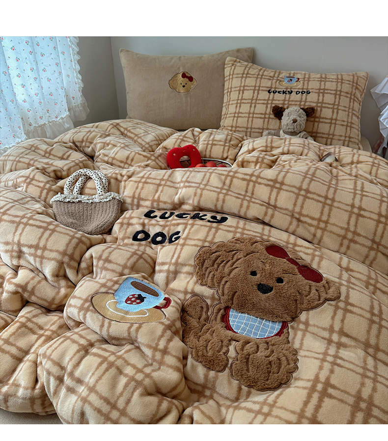(总)暖生活 2025新款高克重细颗粒羊羔绒四件套,调皮小狗,灰色小象,毛绒小狗,甜点玩偶,小咪排队,幸福小窝