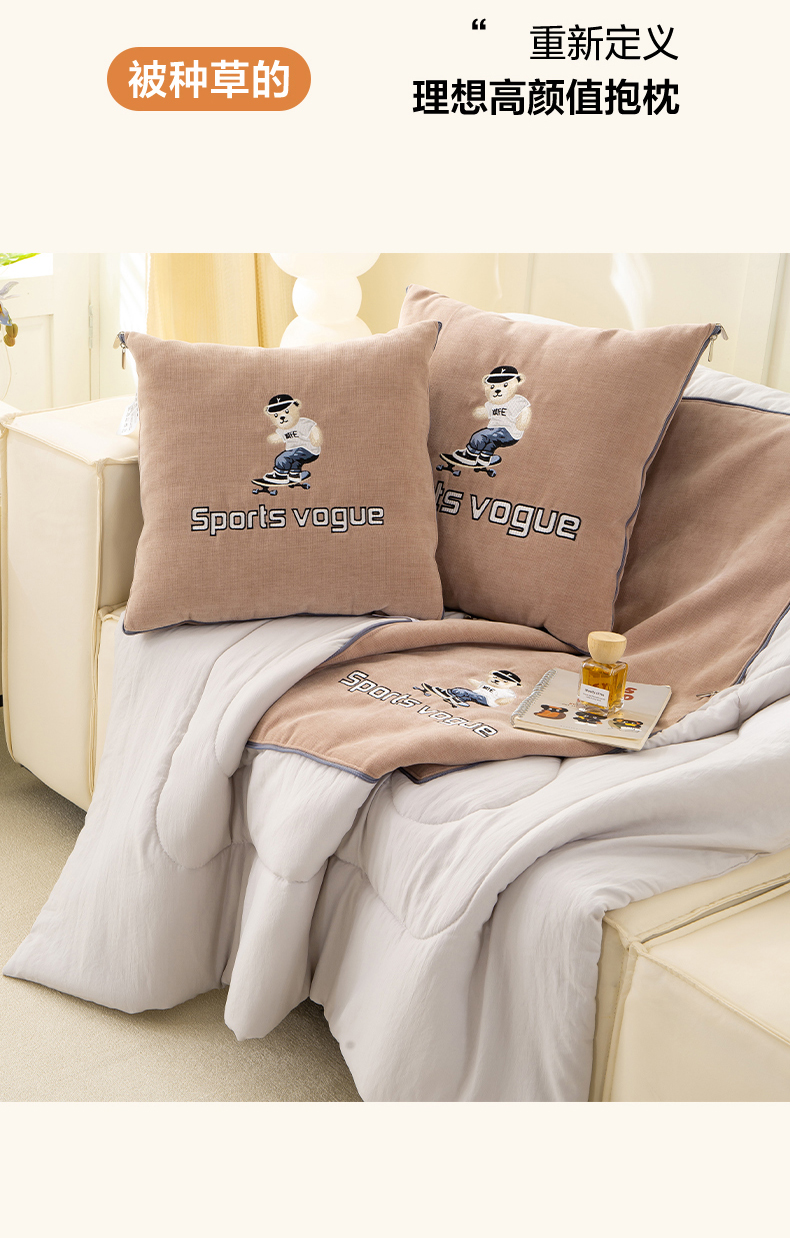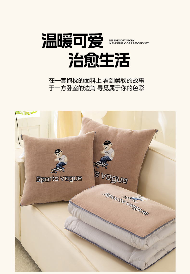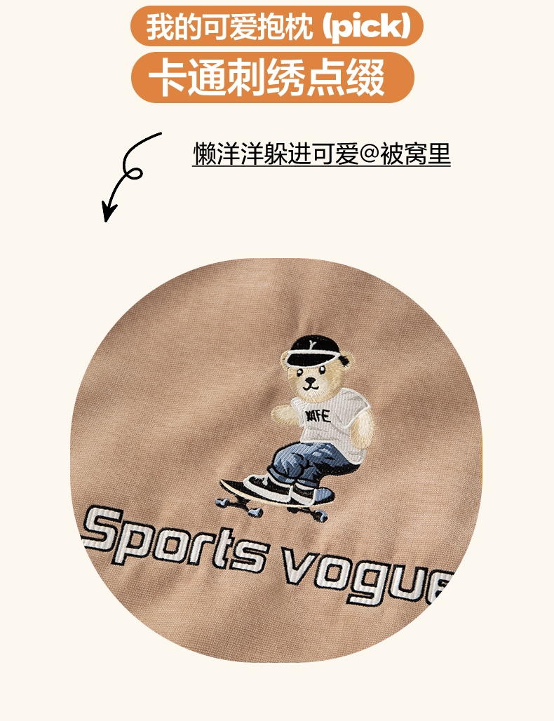 商品名称:多今家纺 2025新款水洗棉雪尼尔刺绣抱枕被子-滑板熊系列 滑板熊-淡桃红