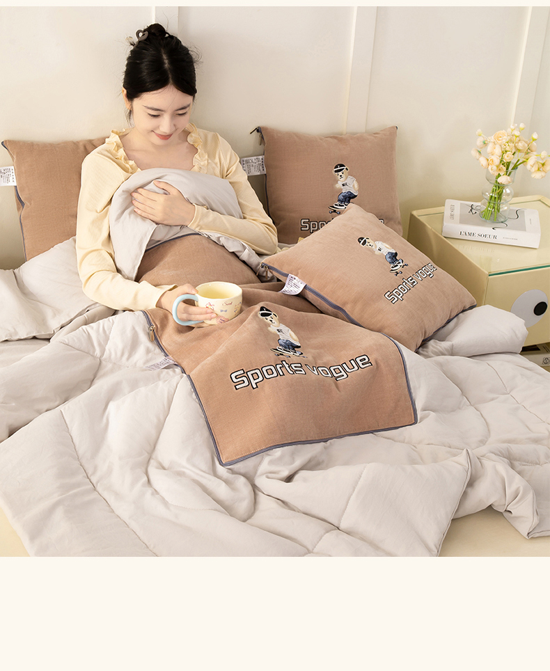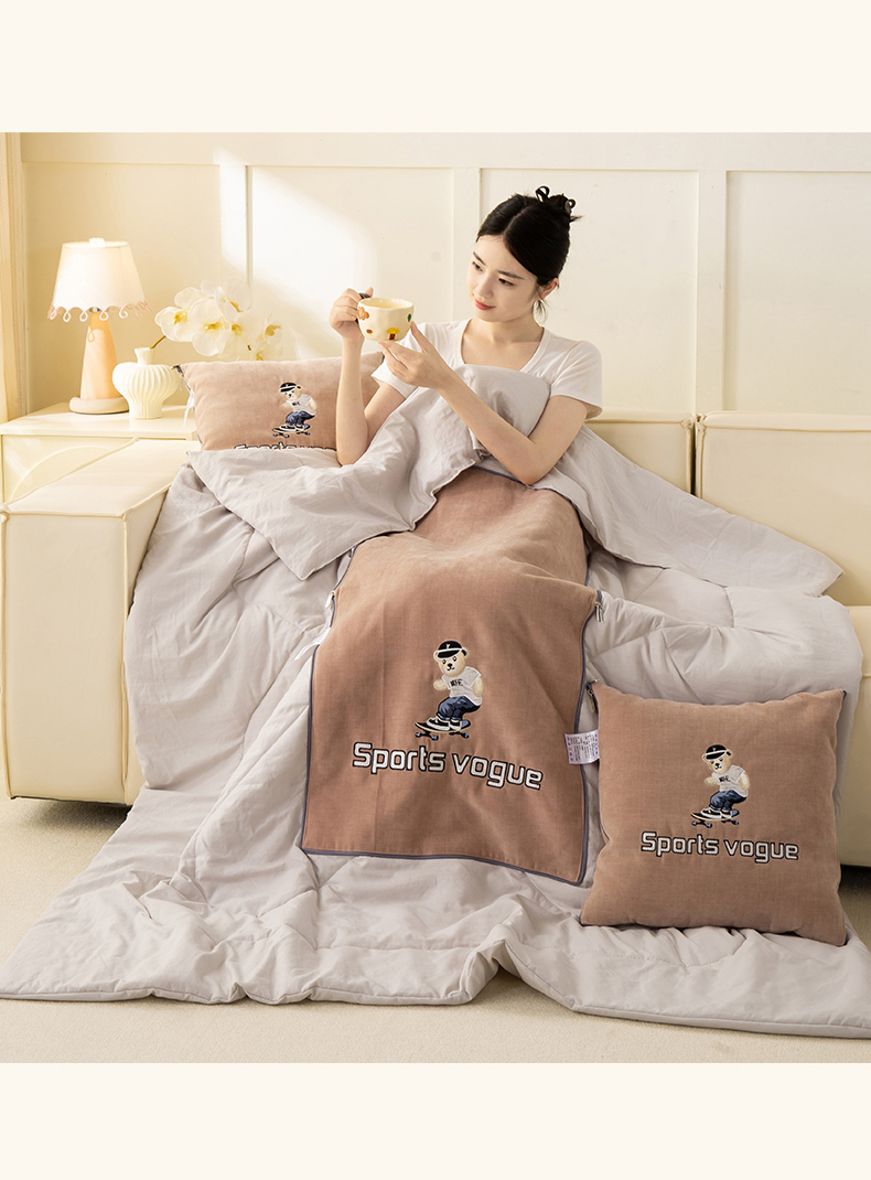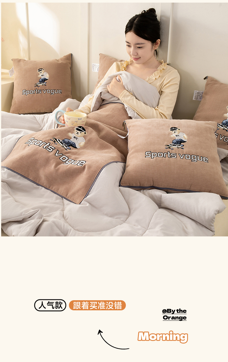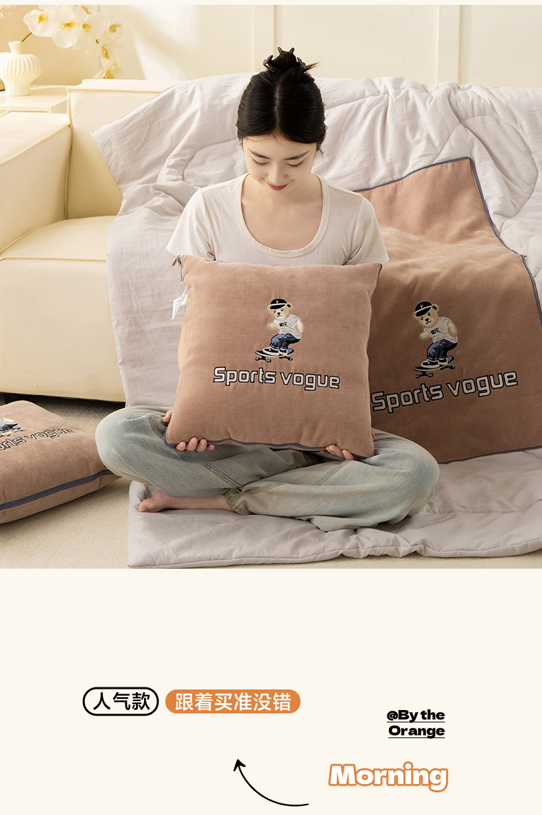 多今家纺 2025新款水洗棉雪尼尔刺绣抱枕被子-滑板熊系列 滑板熊-淡桃红