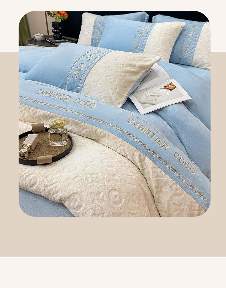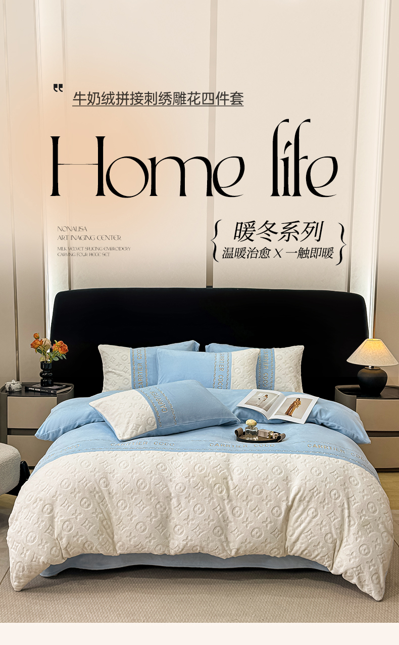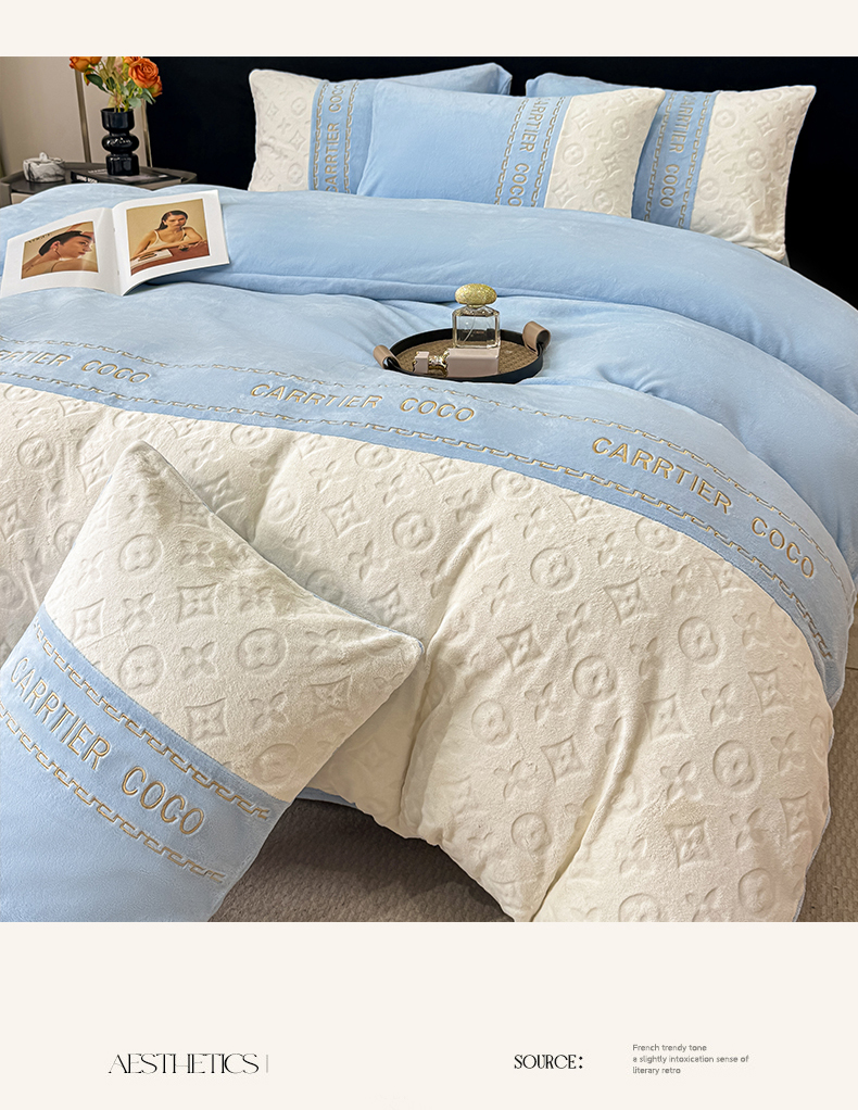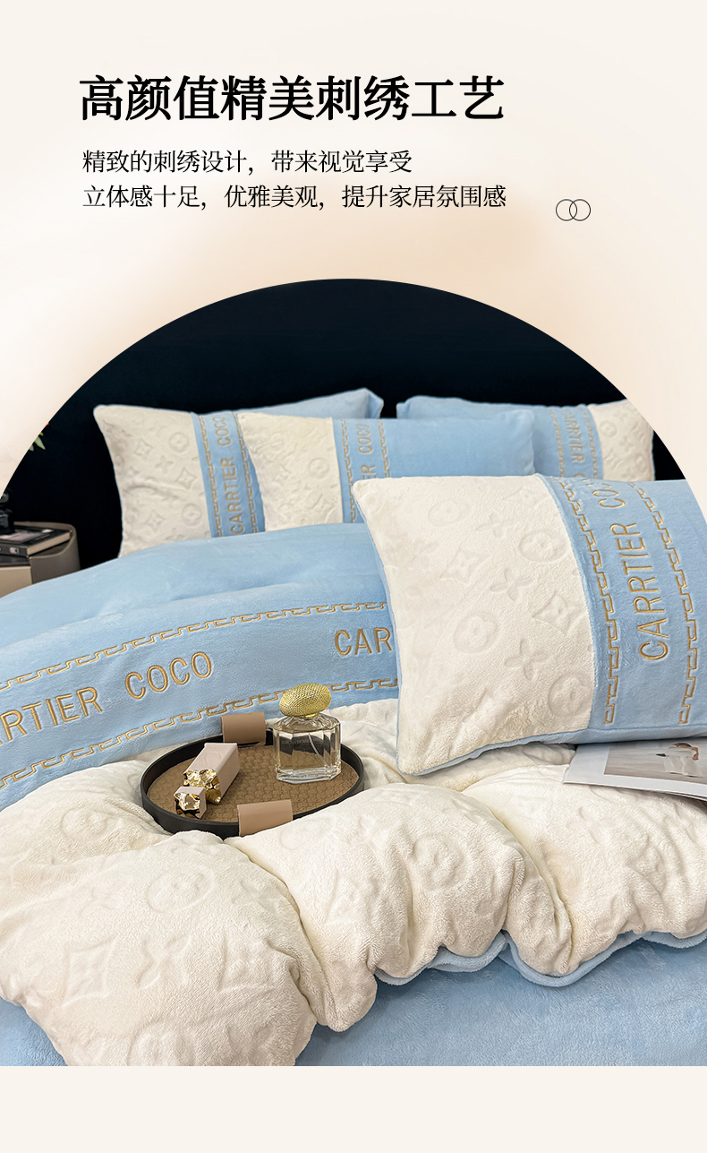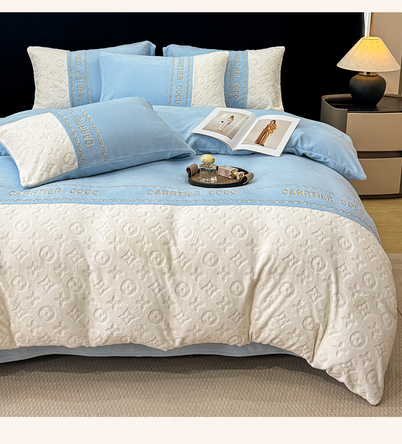 当前位置: 91家纺网 > 商品网购 > 床品套件 > 四件套 > 牛奶绒四件套 > 灰鲸 2025新款牛奶绒拼接刺绣雕花四件套-威登 威登-繁星蓝