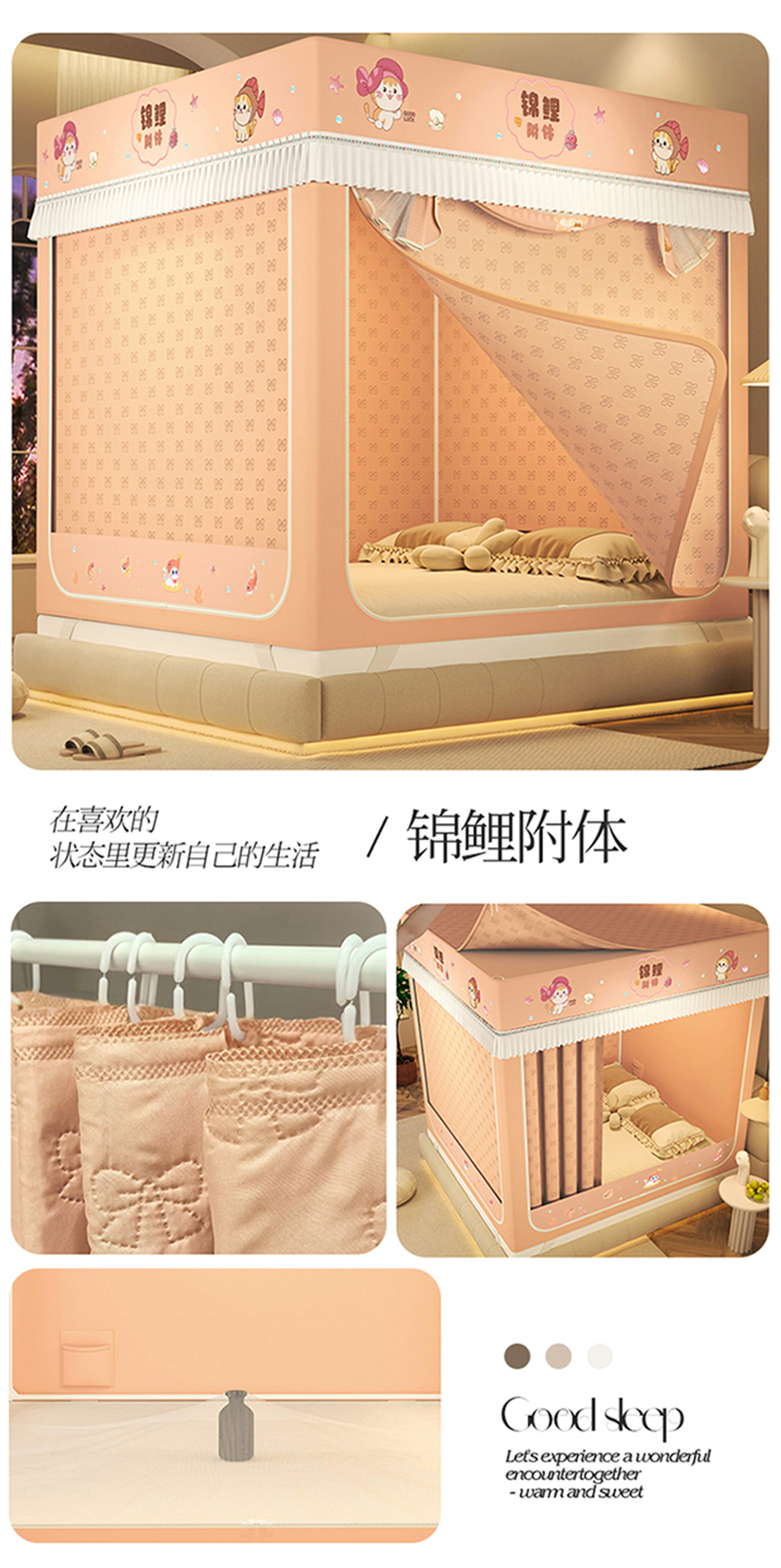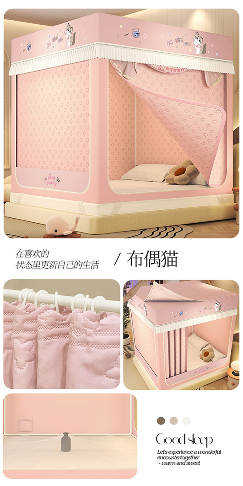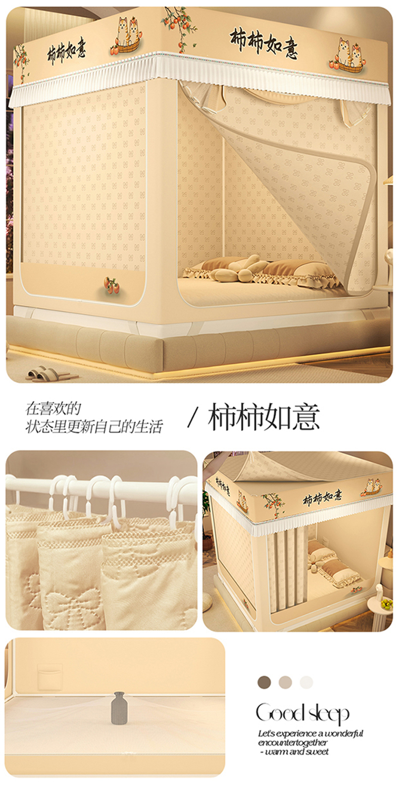 (总)艾晶美 2025新款学生全包一体式窗帘布遮光学生蚊帐,裸粉,灰蓝,卡其,烟灰,另加卡通配饰