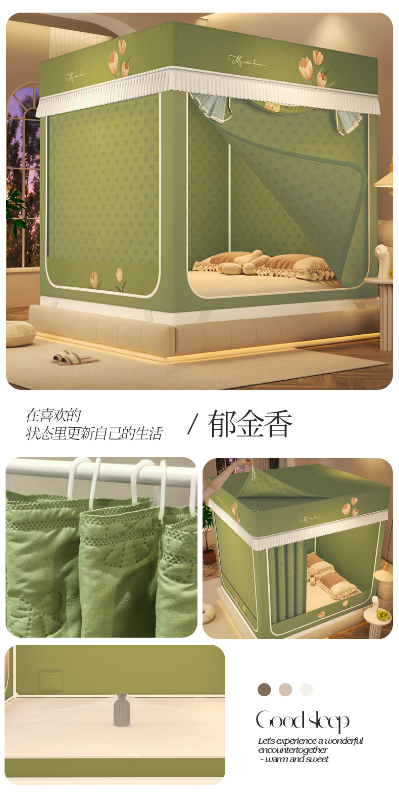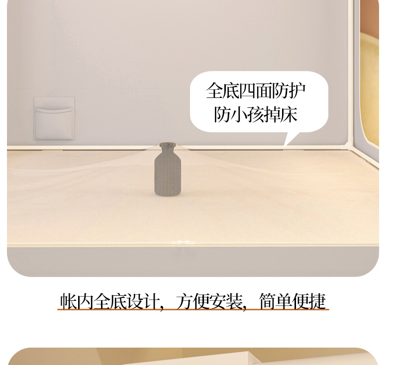 (总)艾晶美家纺有限公 2025新款防摔坐床外穿杆全底蚊帐,艾草绿,豆沙粉,高级灰,奶咖黄