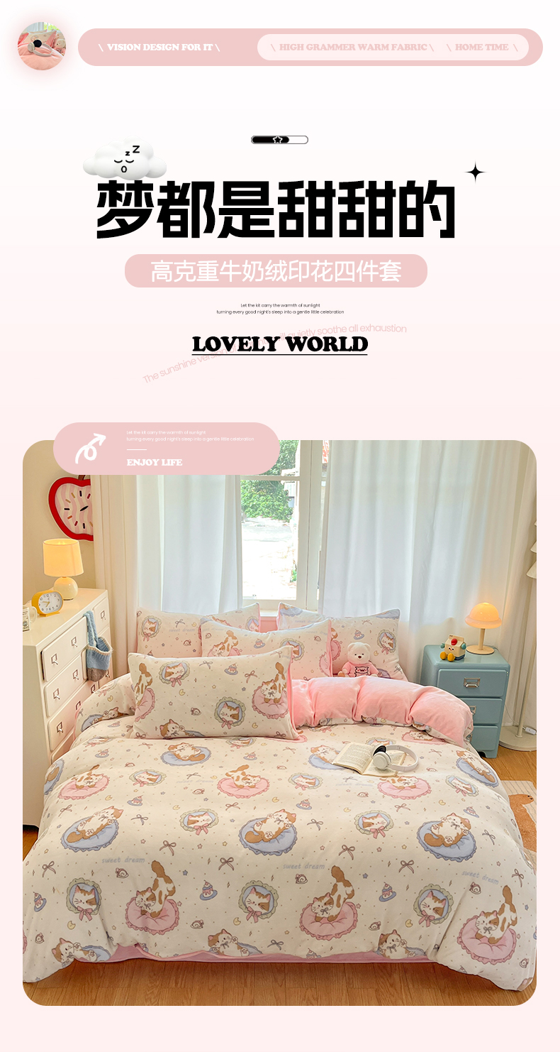 商品名称:吉象家纺 2025新款高克重牛奶绒印花被套 萝莉猫咪