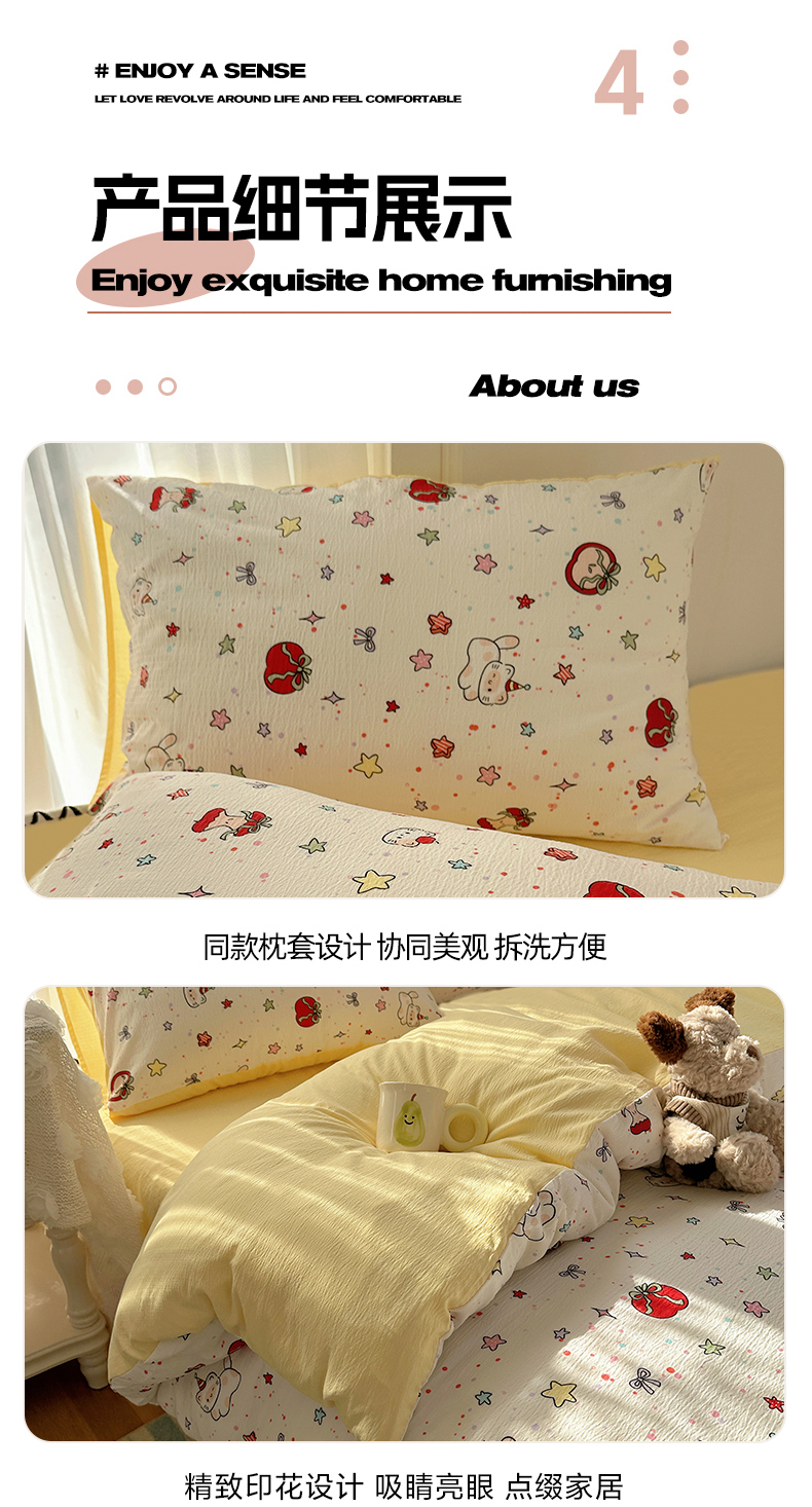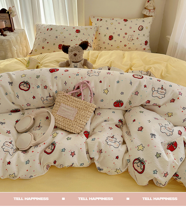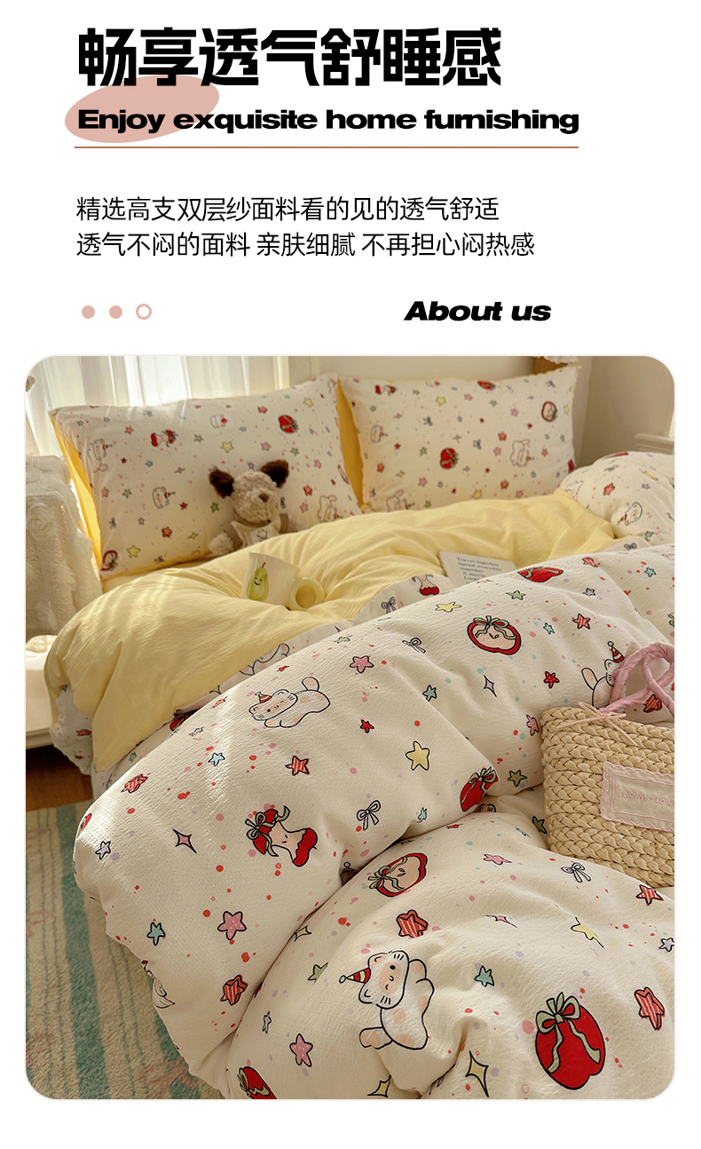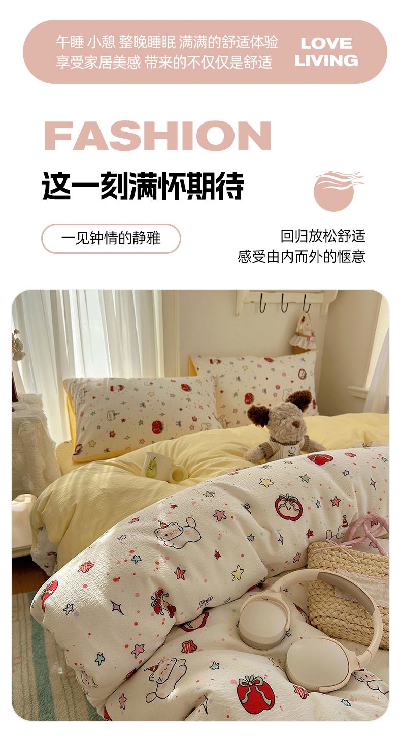 当前位置: 91家纺网 > 商品网购 > 床品套件 > 四件套 > 双层纱四件套 > 星禾优选 2025新款全新热款敲可爱的奶呼呼云感双层纱简约四件套系列(提供买家秀) 苹果小怪