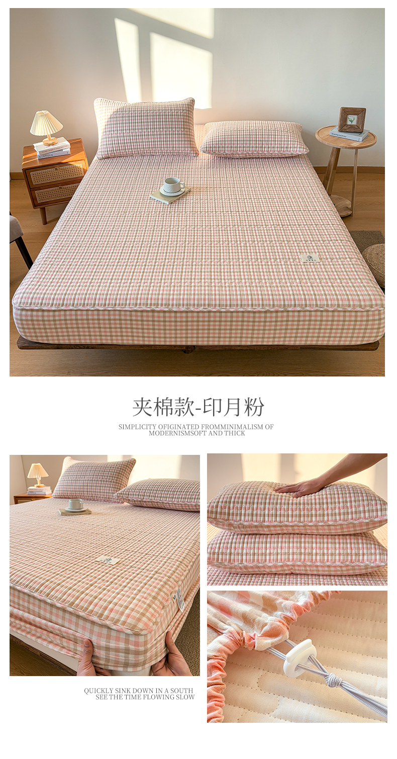 居眠 2026新款全棉色织水洗棉格子夹棉棉花床笠 夹棉款-印月粉