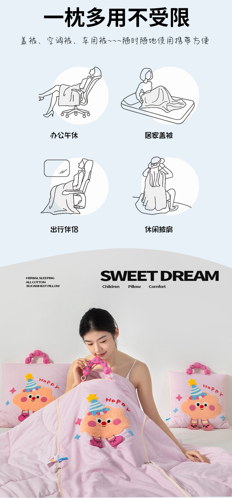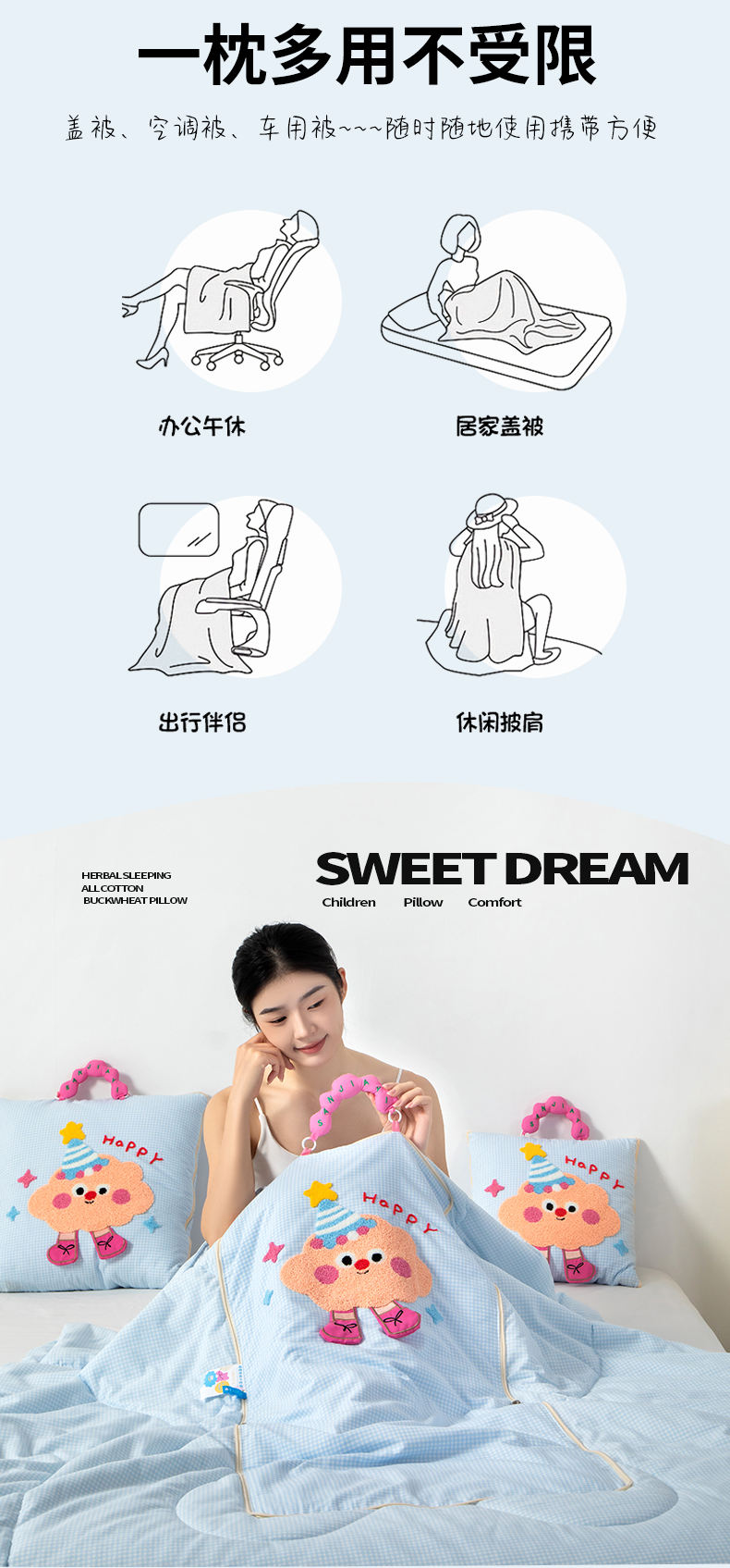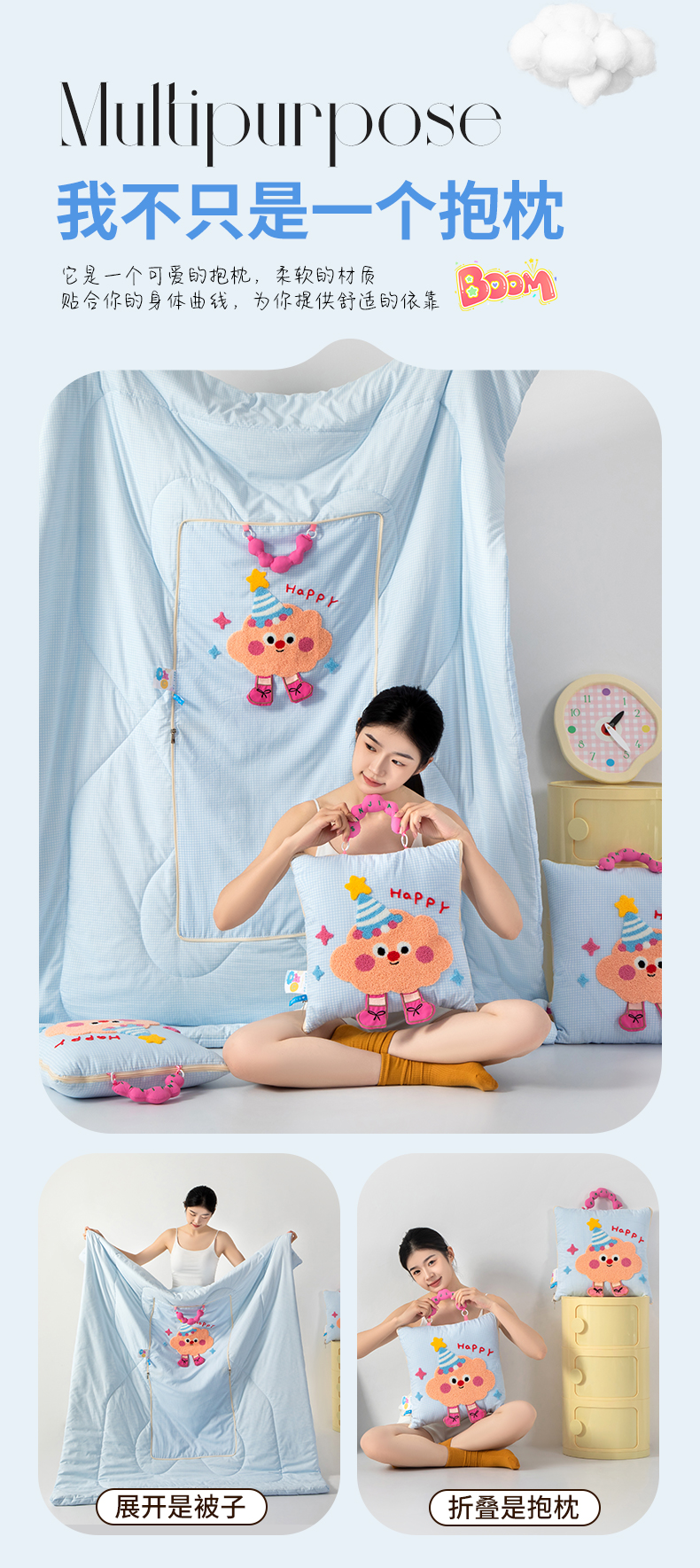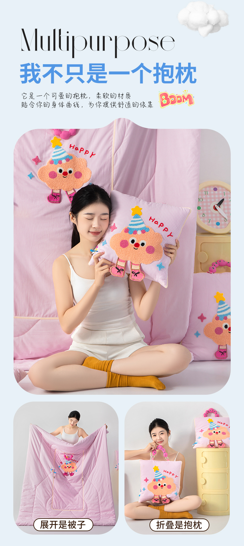 (总)2025新款无印风手提款开心兔系列抱枕被,开心兔粉色,开心兔蓝色,开心兔香草色,开心兔烟灰色