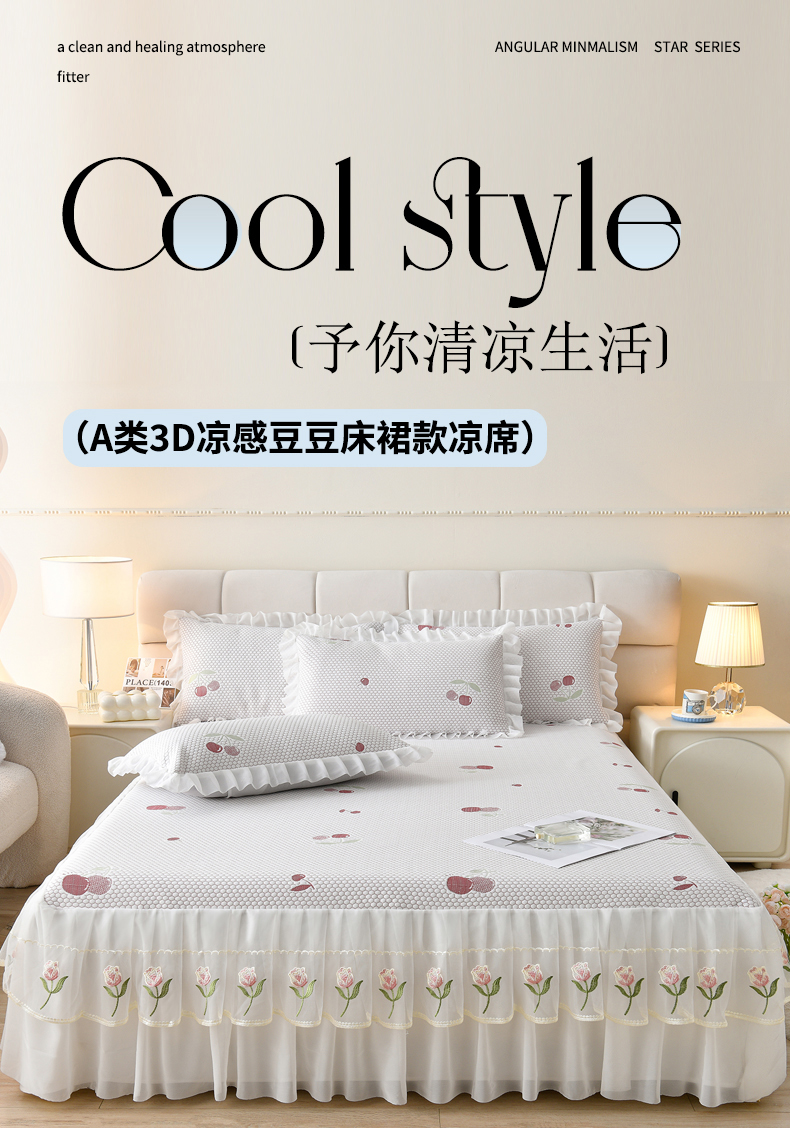 • 91家纺网 家纺一手货源 找家纺 优家居工厂店 A类2026夏季冰丝席裙款豆豆凉席三件套刺绣花边蕾丝花边床裙可机洗水洗 盛夏-樱桃