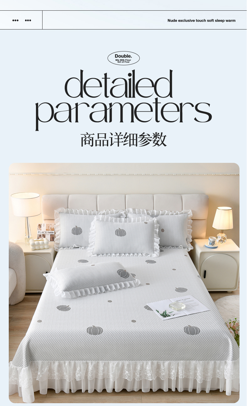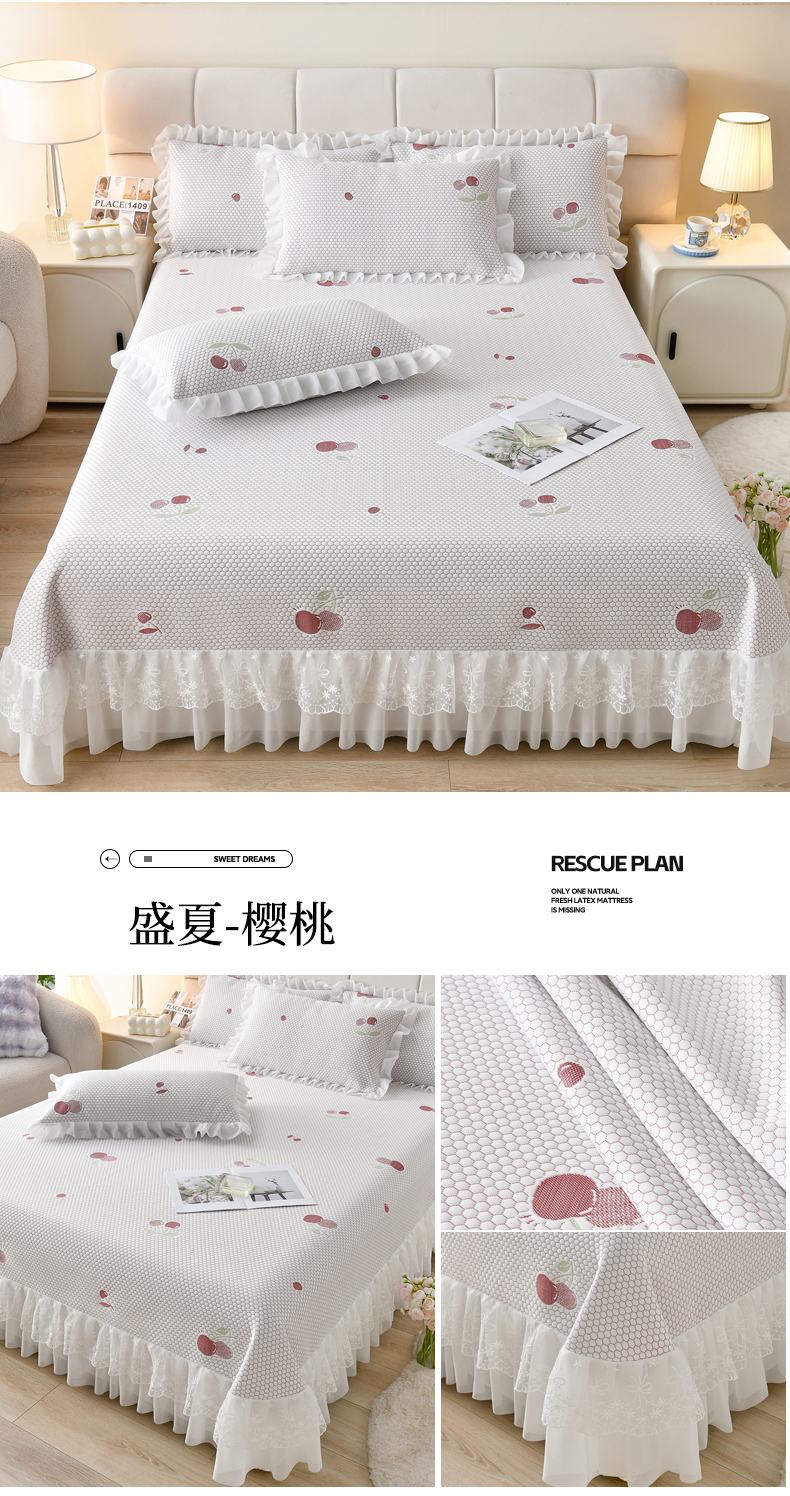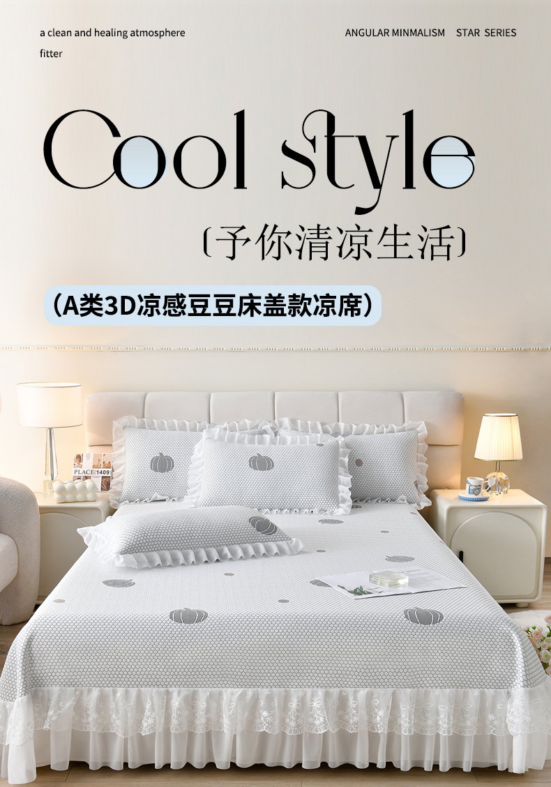 当前位置: 91家纺网 > 商品网购 > 床上用品 > 凉席 > 优家居工厂店 A类2026新款凉感豆豆提花凉席床裙款床盖三件套高档蕾丝花边可机洗水洗 盛夏-南瓜青