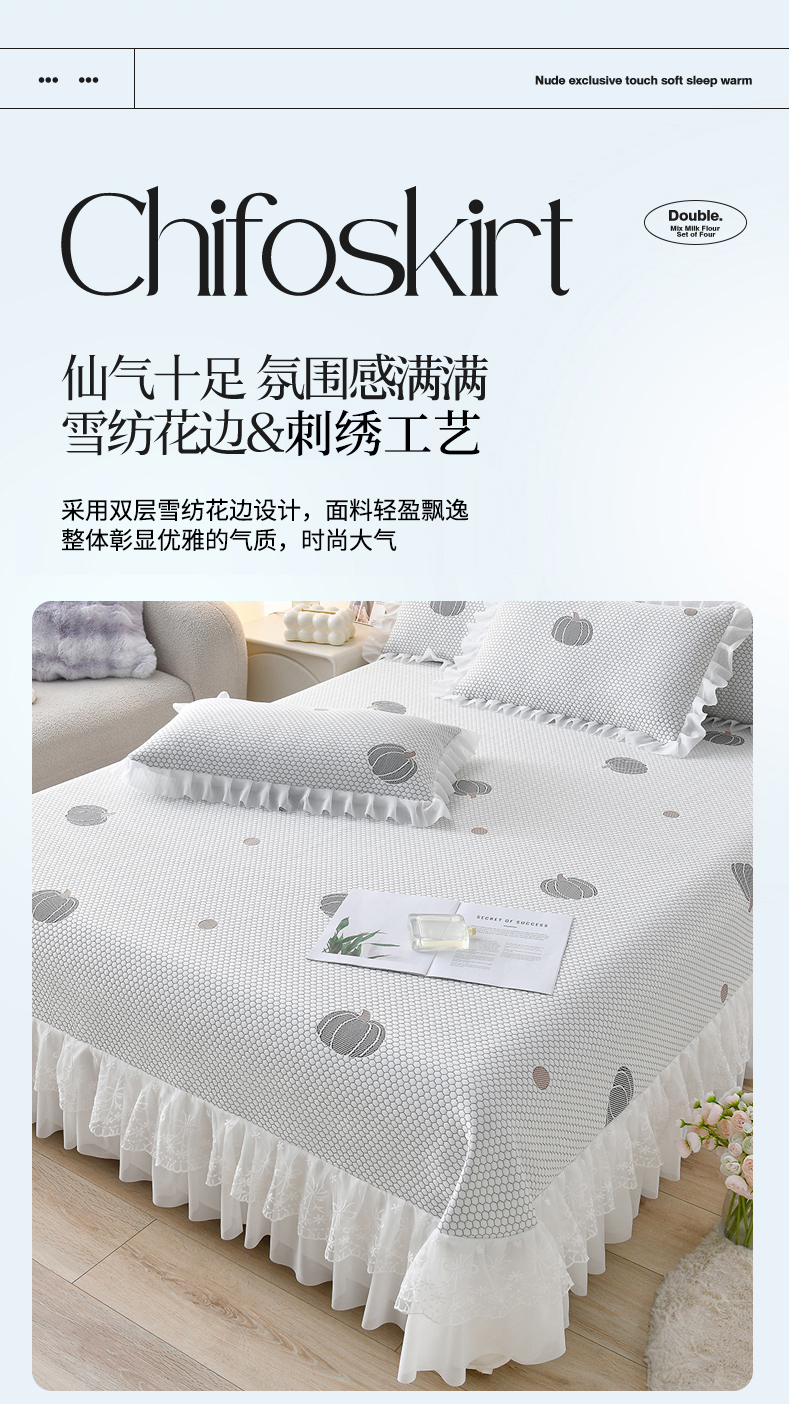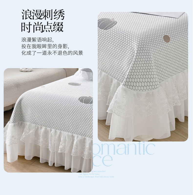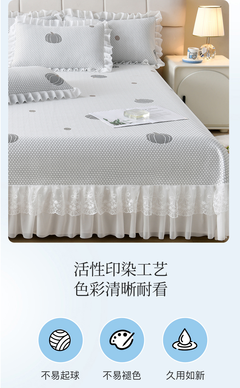 • 91家纺网 家纺一手货源 找家纺 优家居工厂店 A类2026新款凉感豆豆提花凉席床裙款床盖三件套高档蕾丝花边可机洗水洗 盛夏-南瓜青