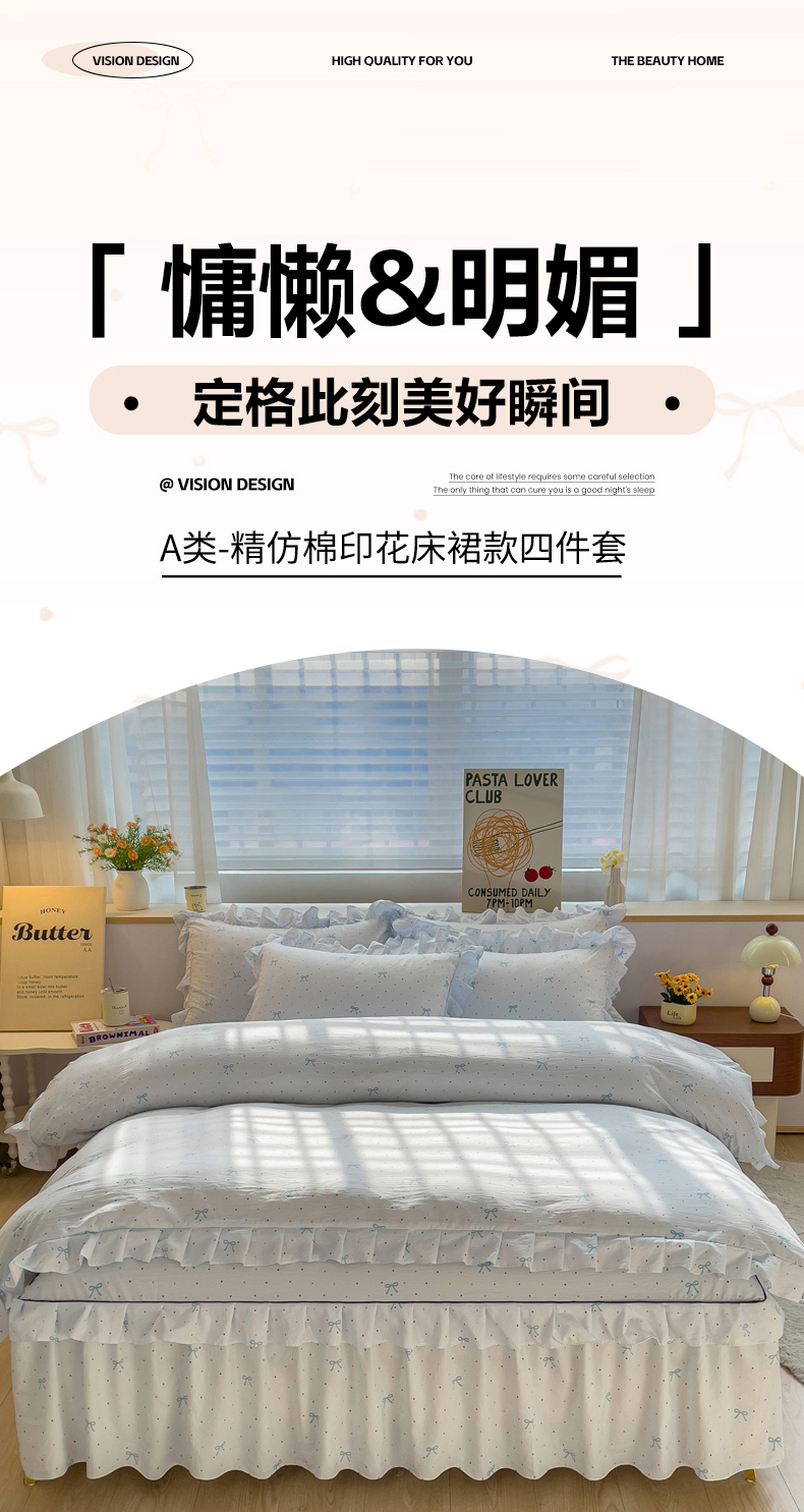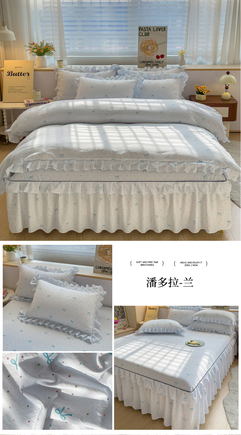 当前位置: 91家纺网 > 商品网购 > 床品套件 > 四件套 > 其它四件套 > 优家居工厂店 2026新款精仿棉床裙四件套水洗棉韩版公主风花边床裙单被套直播外贸定制 潘多拉-兰