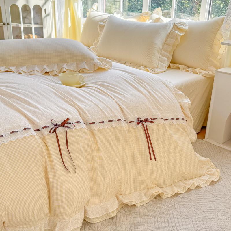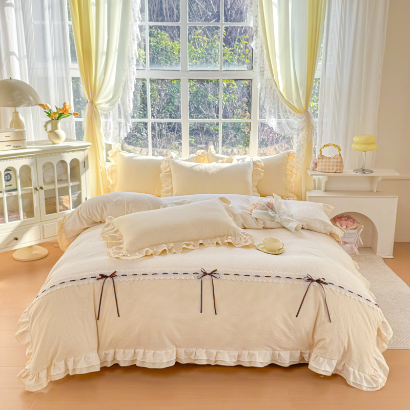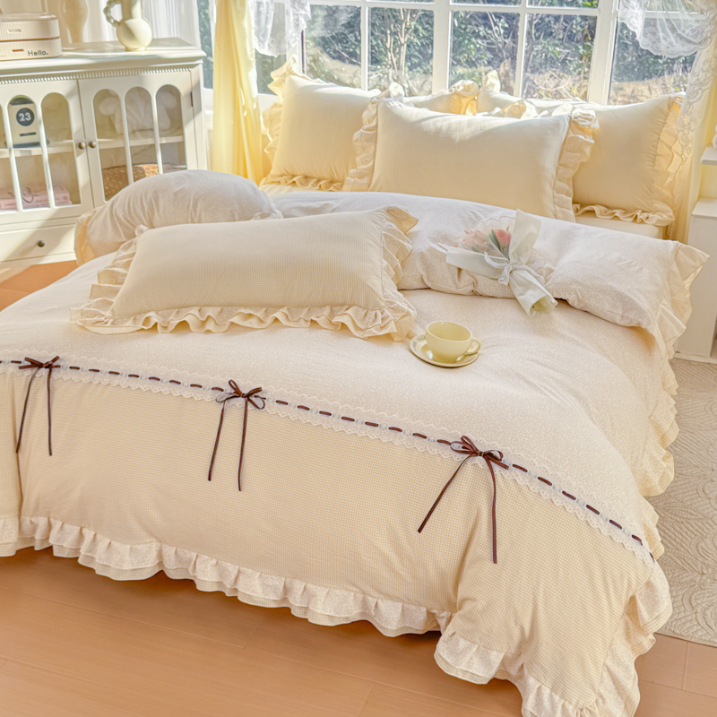 赛丽雅 2026年新款直播爆款双层花边拼接蝴蝶结工艺款四件套床上用品 南法假日-姜黄