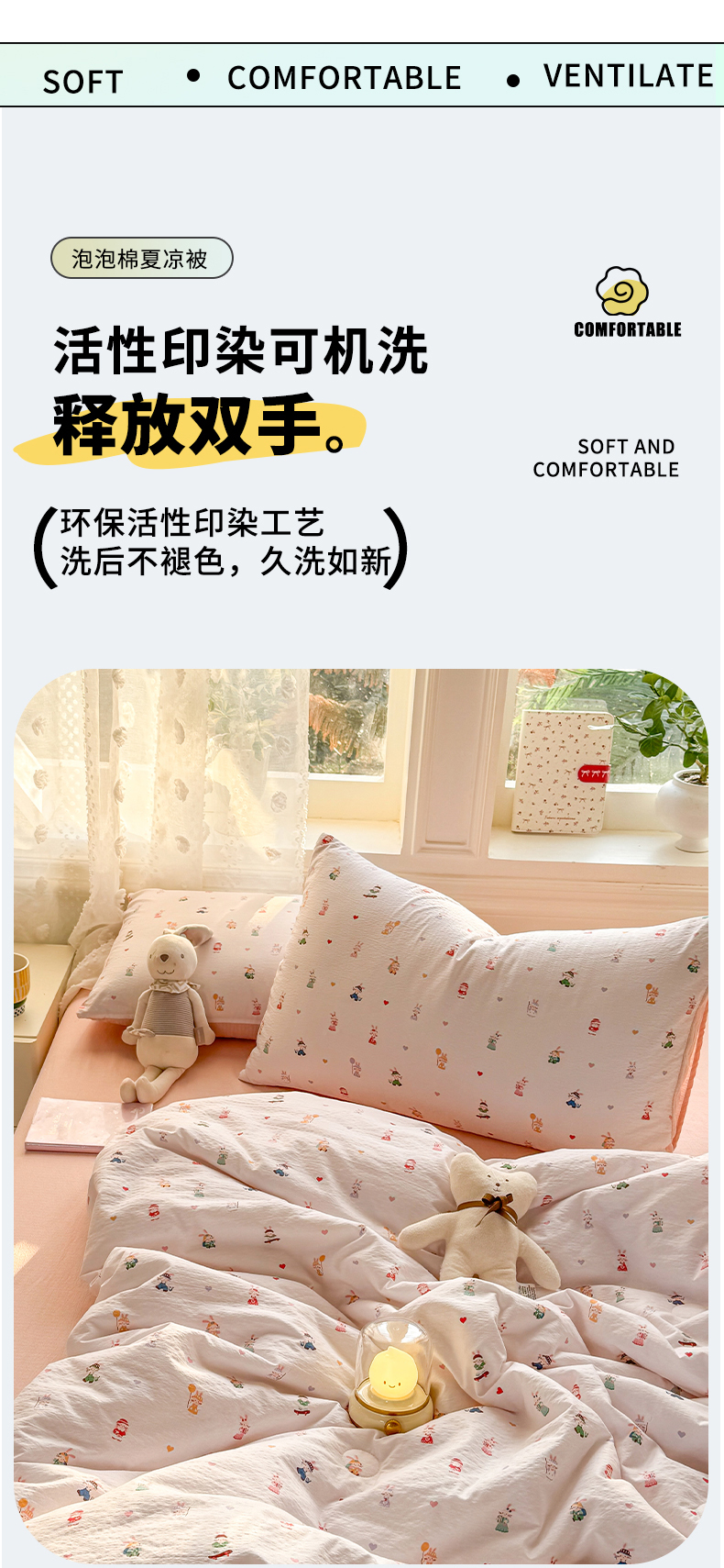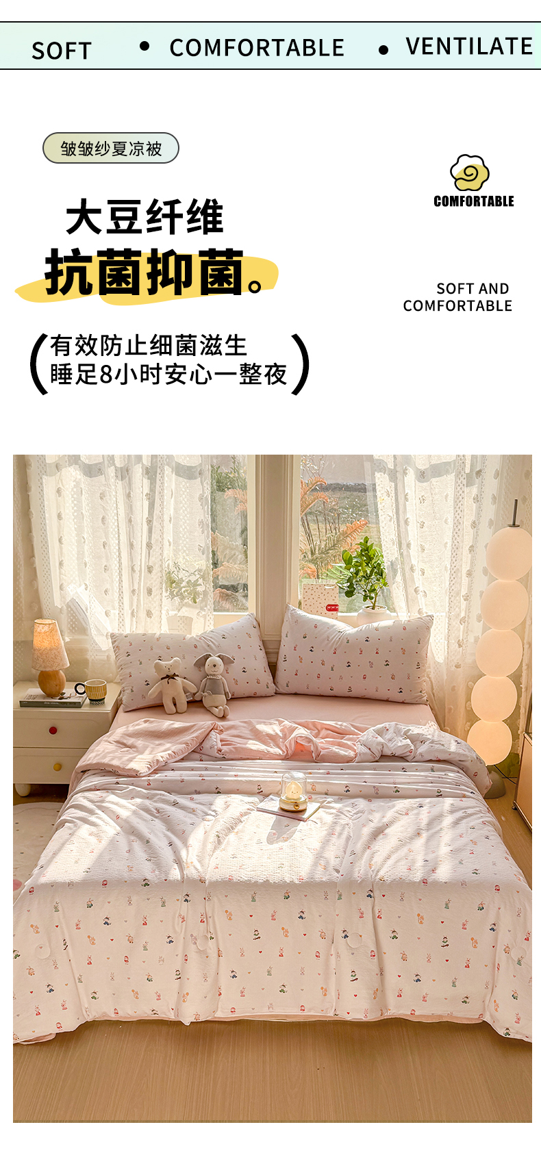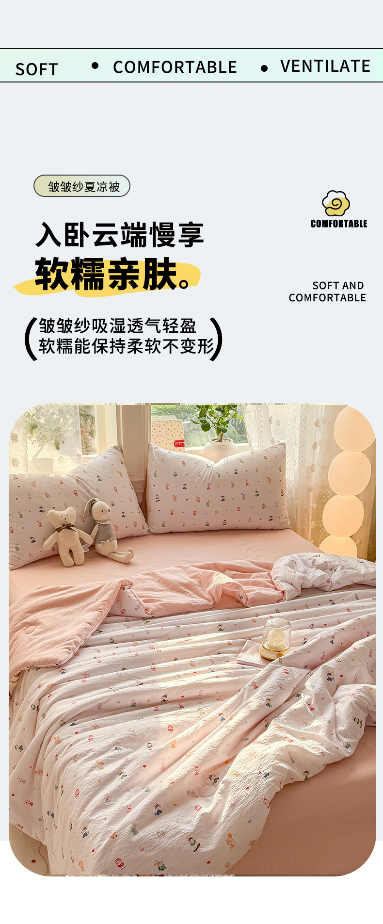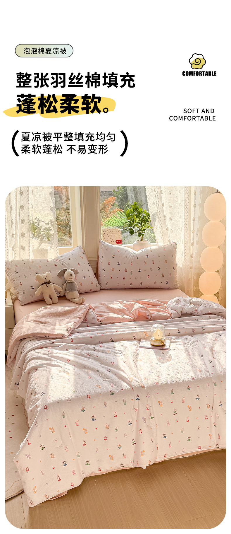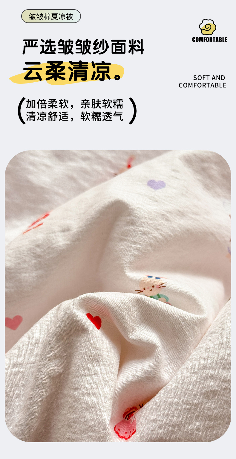 • 91家纺网 家纺一手货源 找家纺 丽美人家纺 2026春夏新款简单款皱皱纱夏被夏凉被空调被 桃心萌兔集