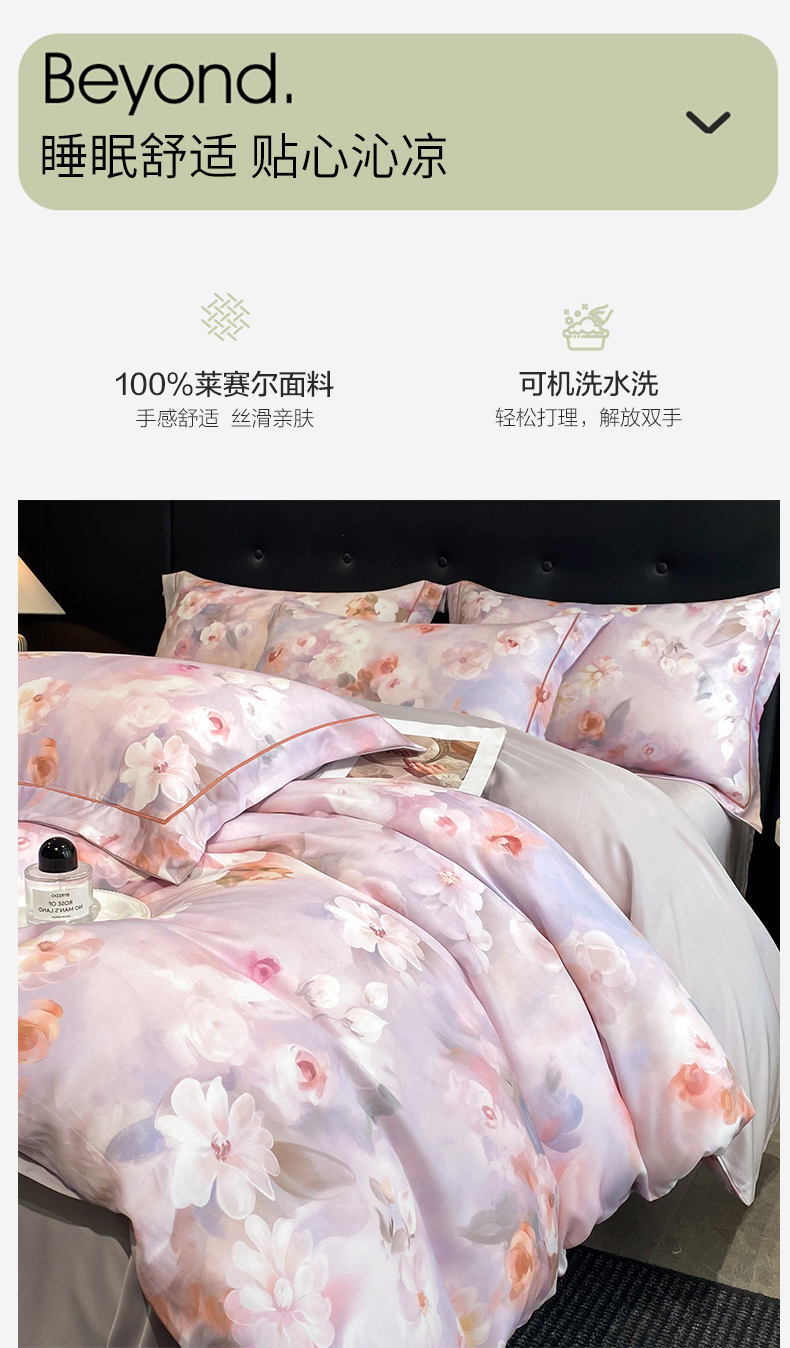 商品名称:启航家居 2026新款春夏天丝莱赛尔数码印花四件套 栀花语粉
