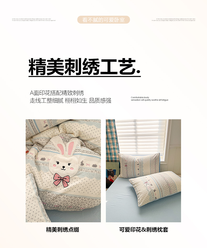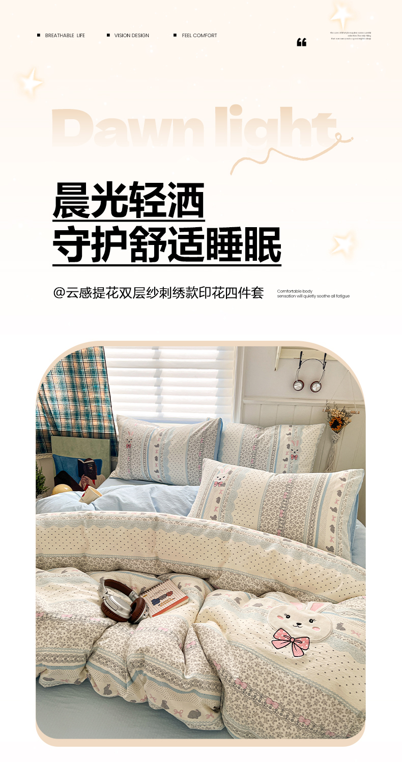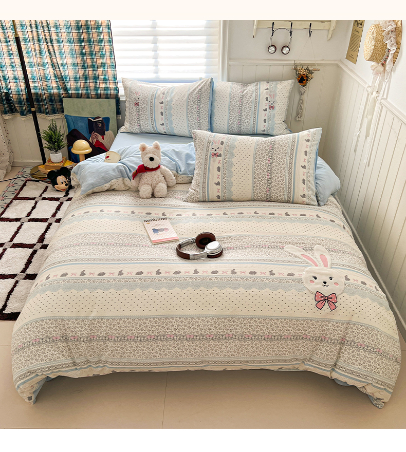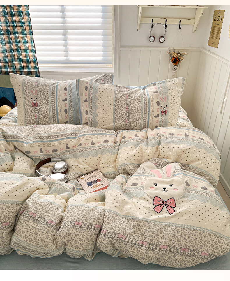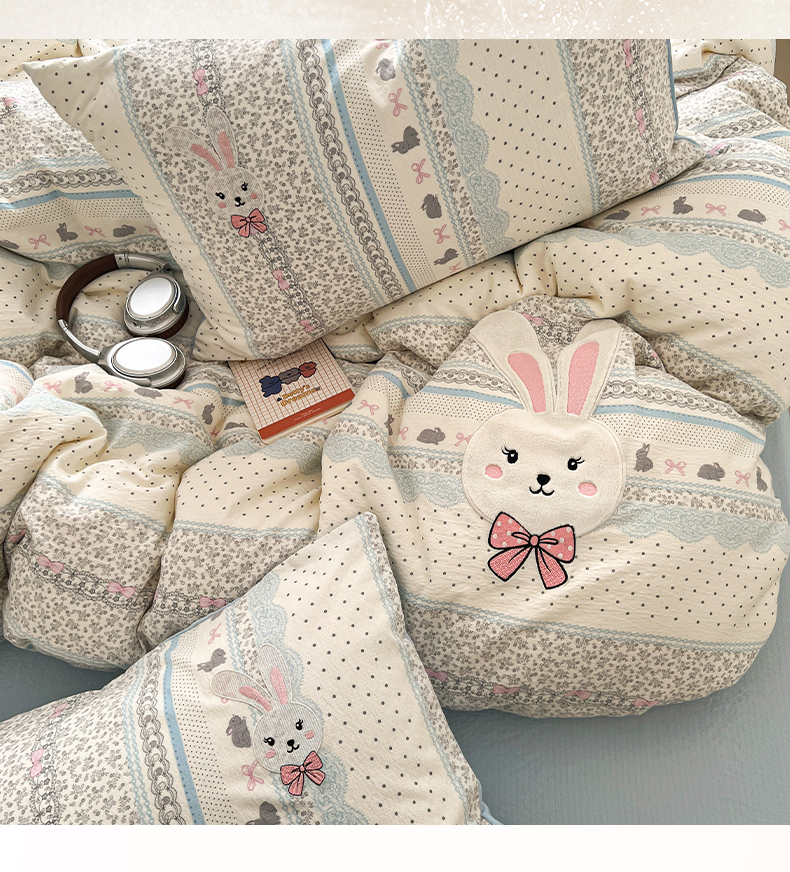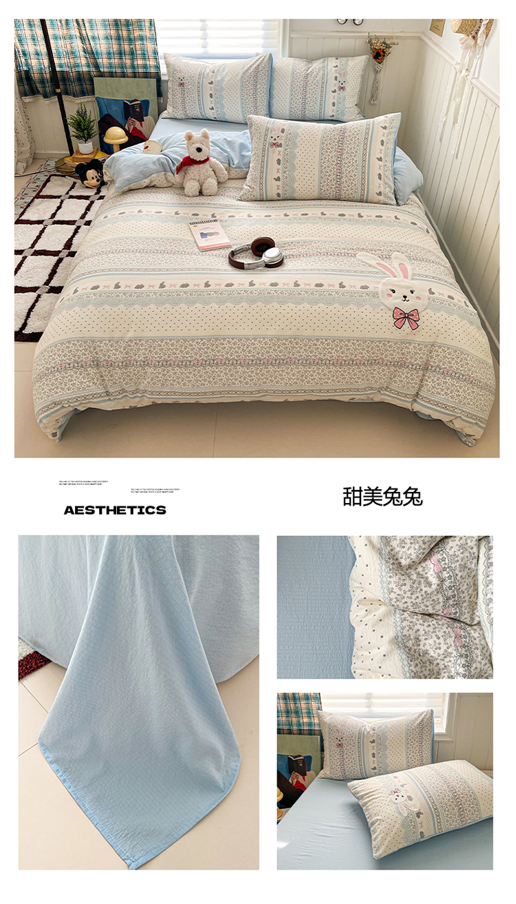 当前位置: 91家纺网 > 商品网购 > 床品套件 > 四件套 > 其它四件套 > 妖妖家纺 2026小清新软糯双层纱刺绣四件套 甜美兔兔-刺绣