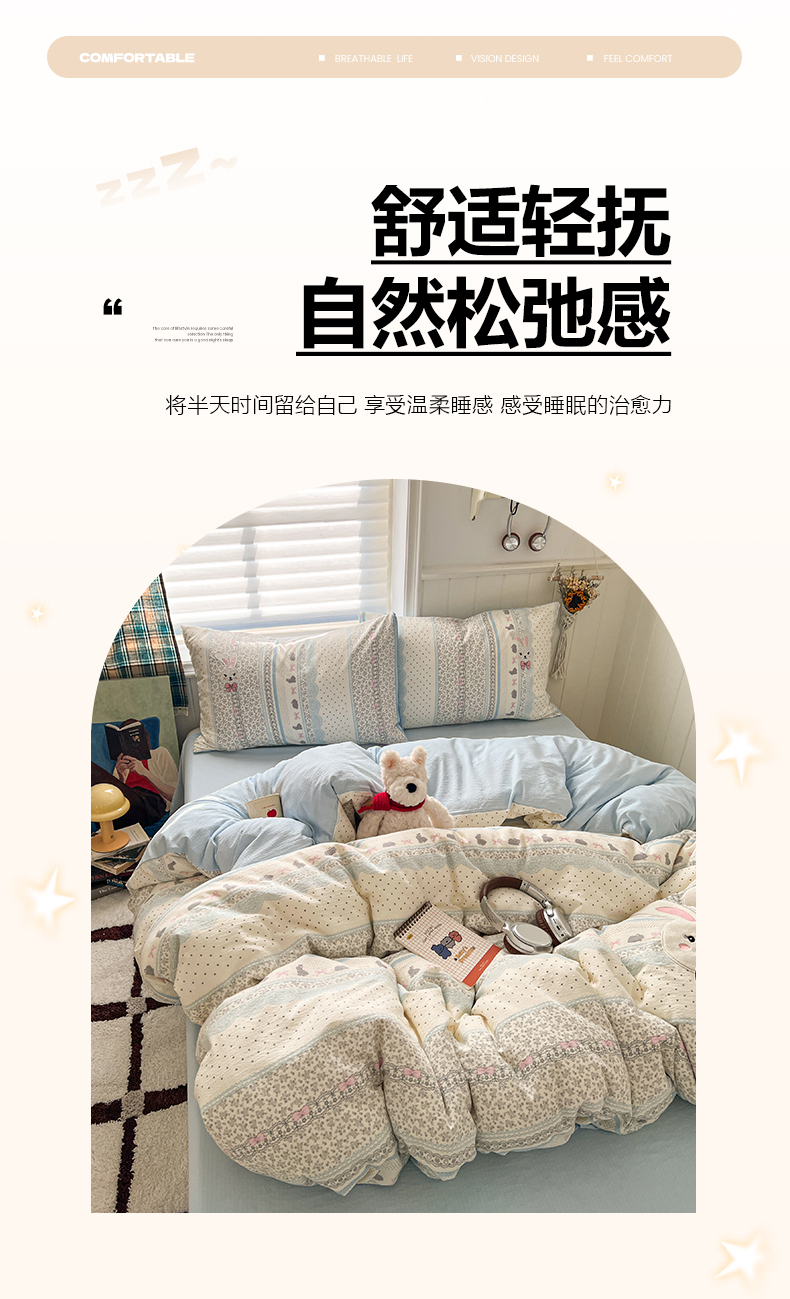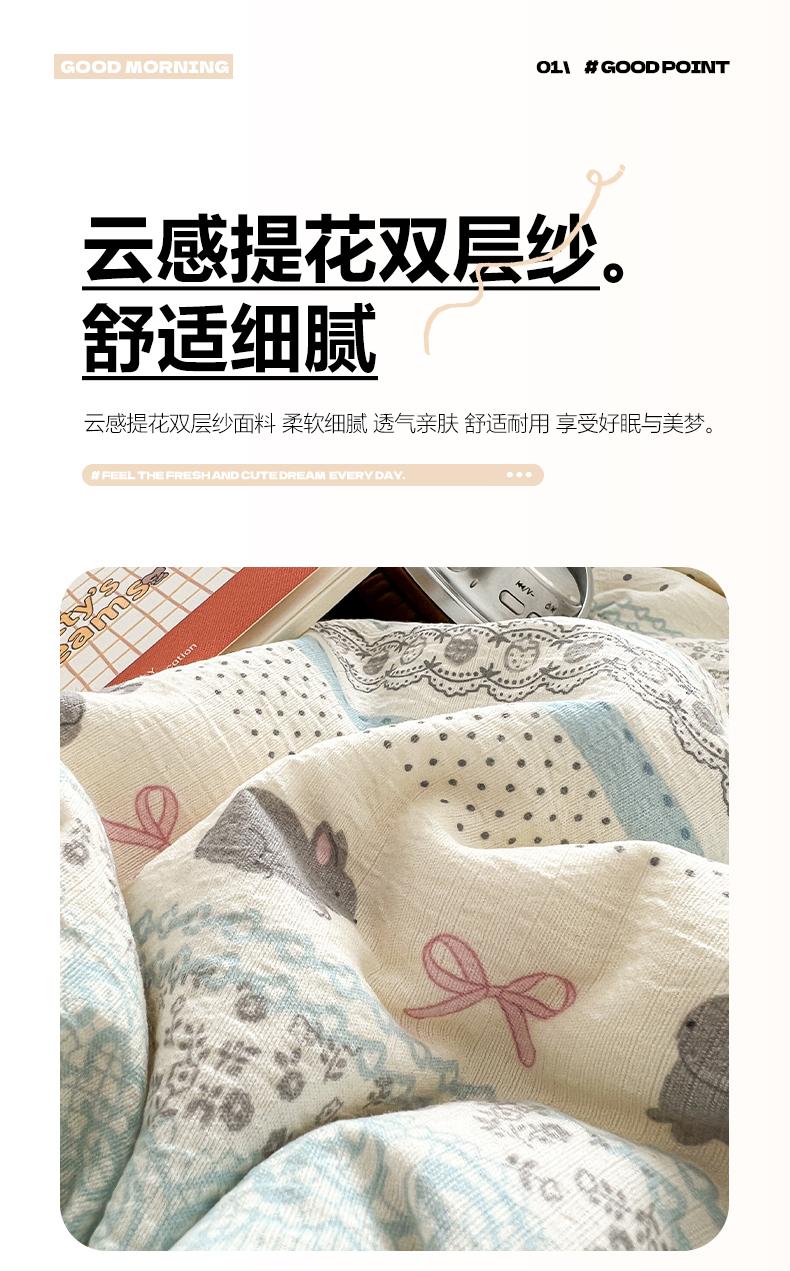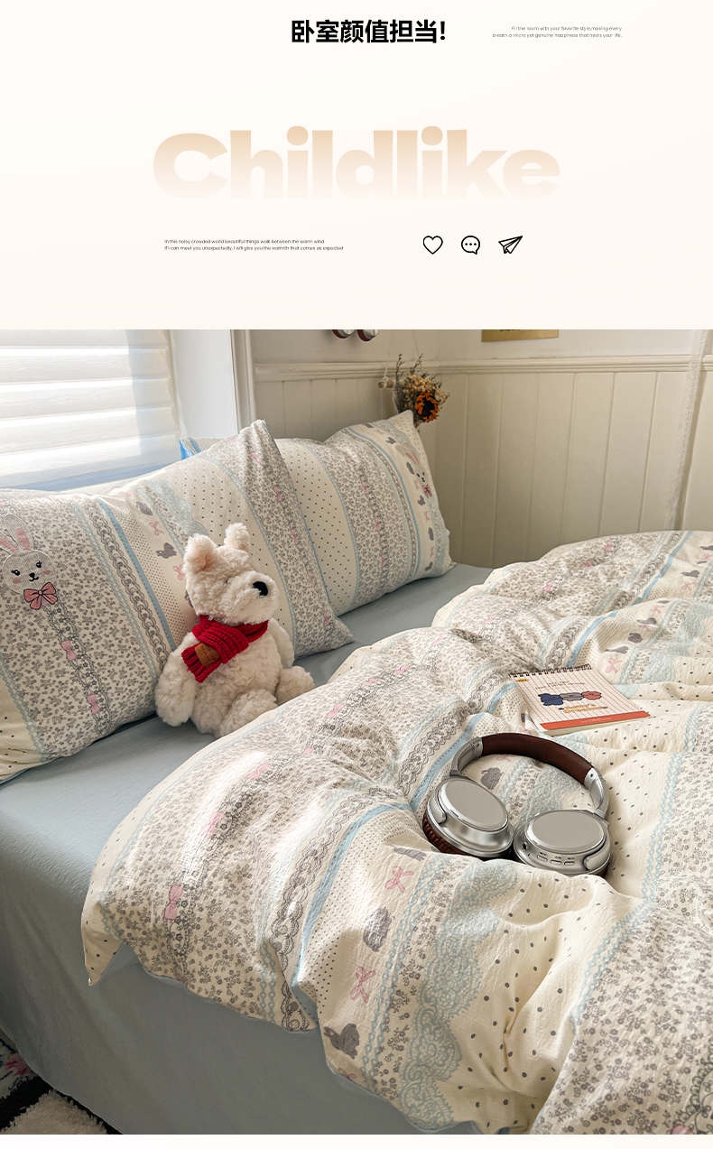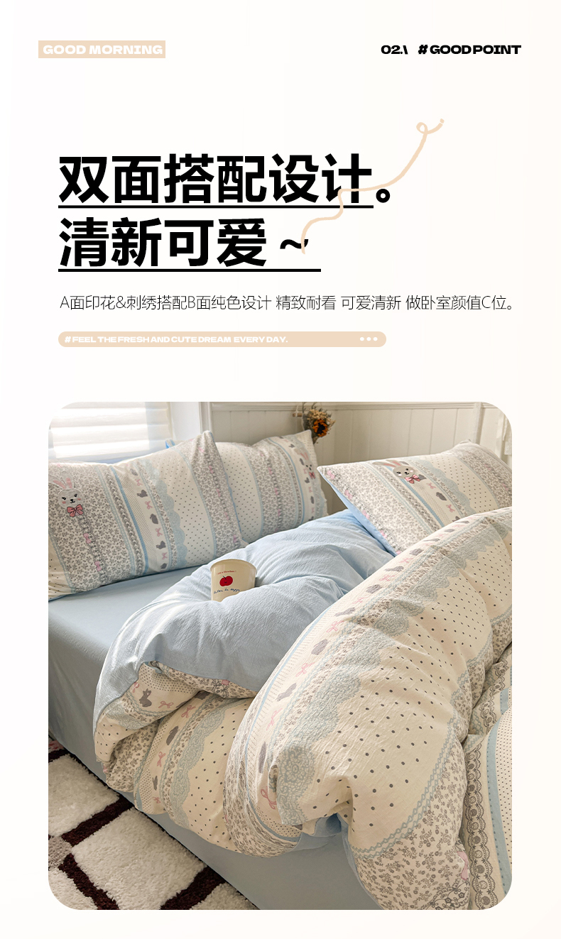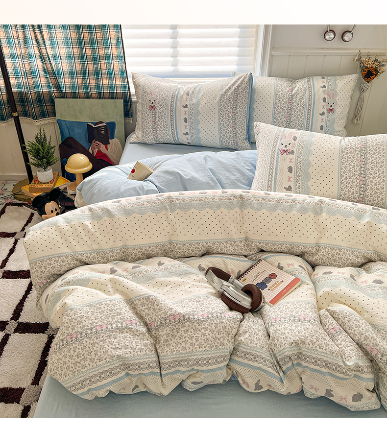 当前位置: 91家纺网 > 商品网购 > 床品套件 > 四件套 > 其它四件套 > 妖妖家纺 2026小清新软糯双层纱刺绣四件套 甜美兔兔-刺绣