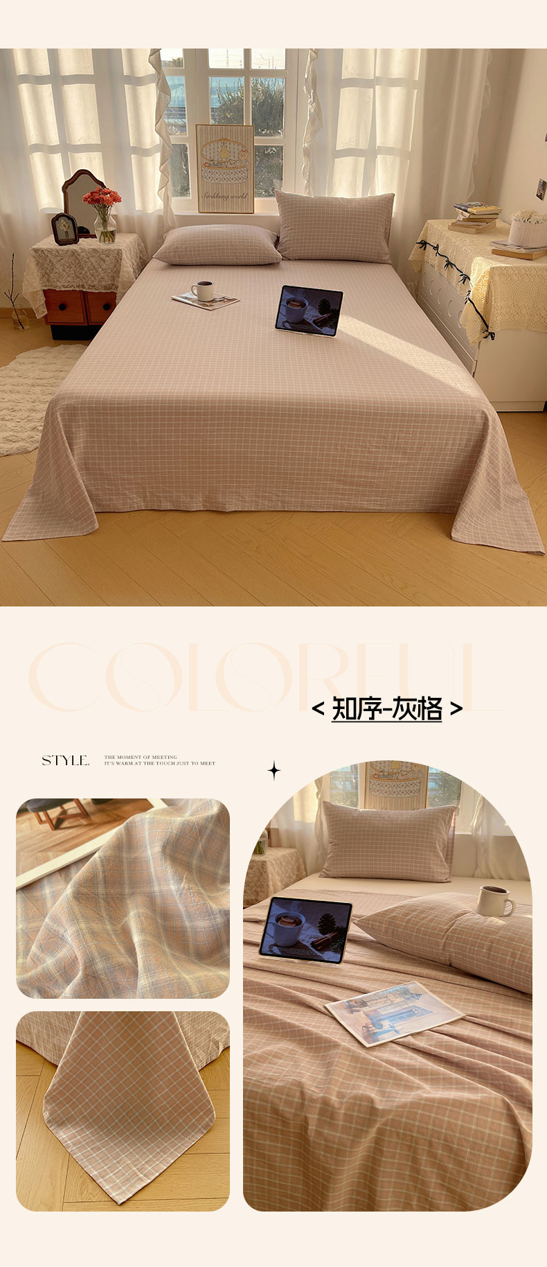 商品名称:六巷胡同 2026新款A类全棉纯棉水洗棉色织格子单品床单 床单单件 觅影-棕格
