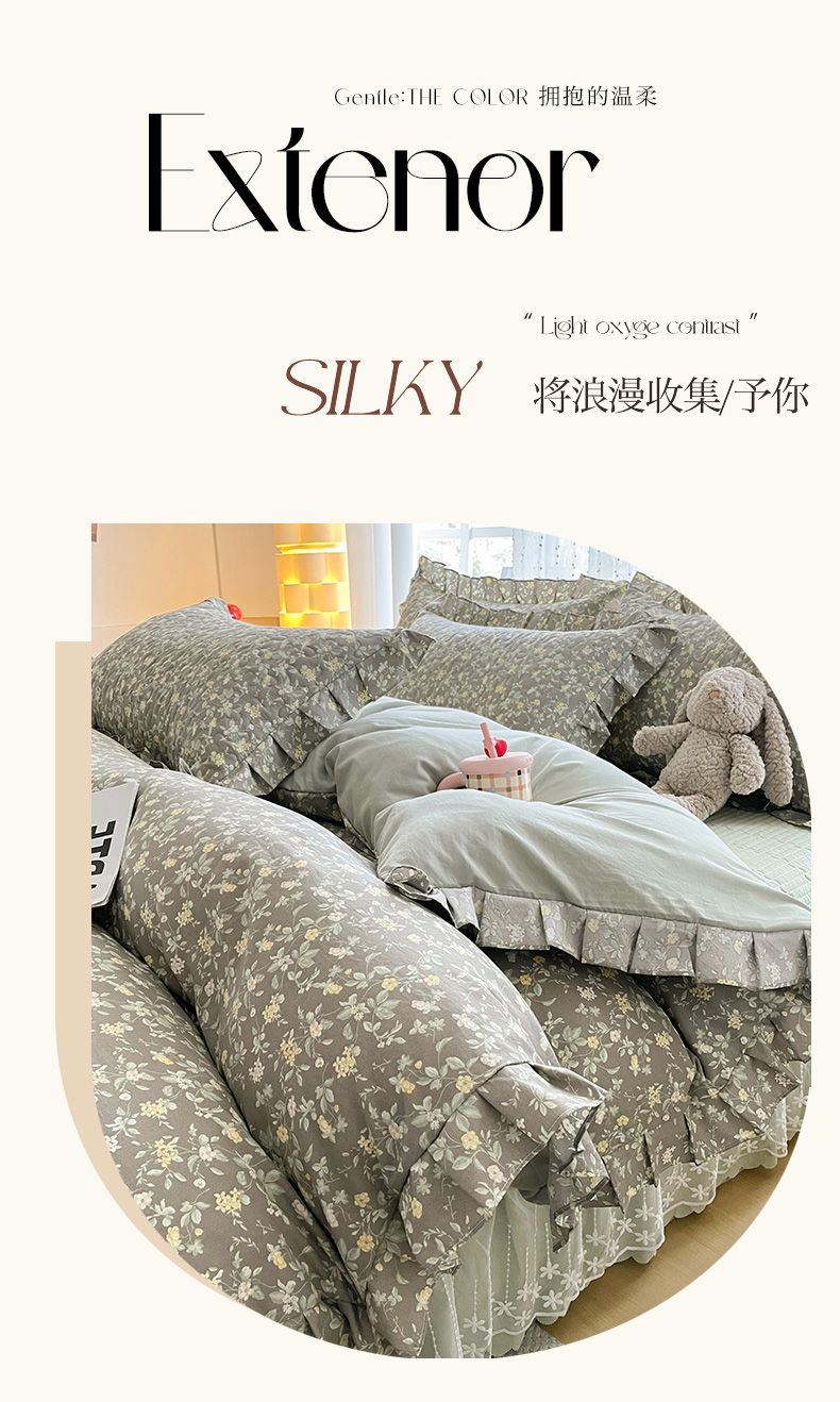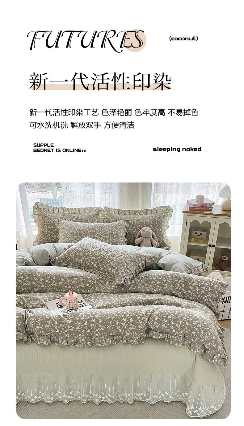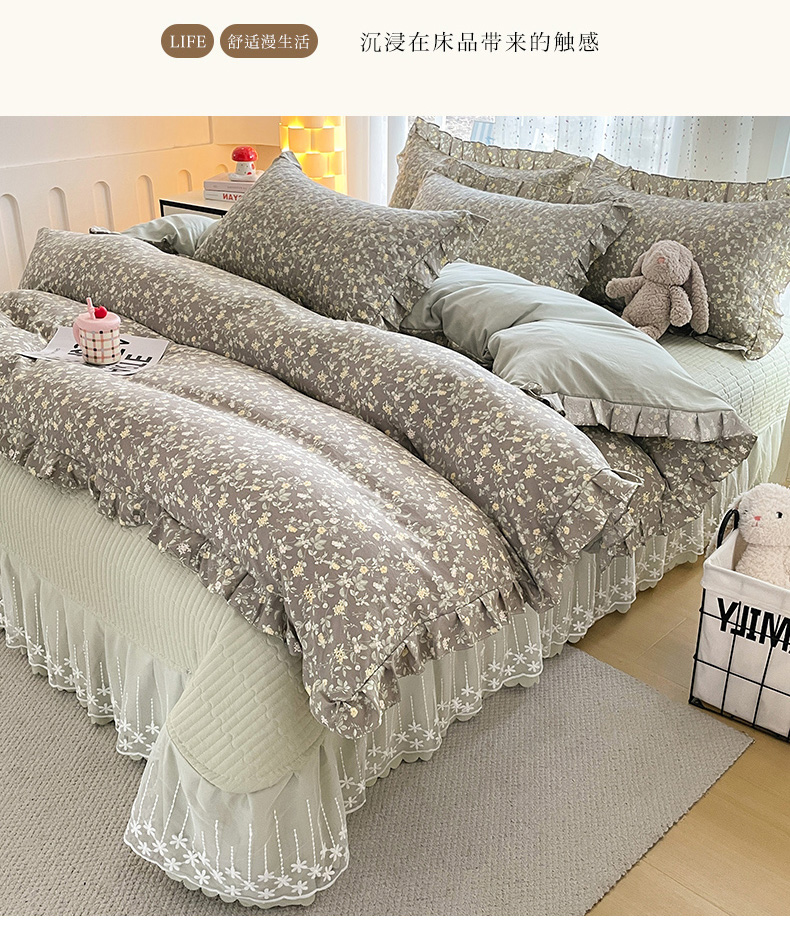 当前位置: 91家纺网 > 商品网购 > 床品套件 > 四件套 > 其它四件套 > 艺慕家纺 2026新款直播热款古法仿棉AB版水洗棉印花双层蕾丝花边床盖四件套 AB版-金盏花语