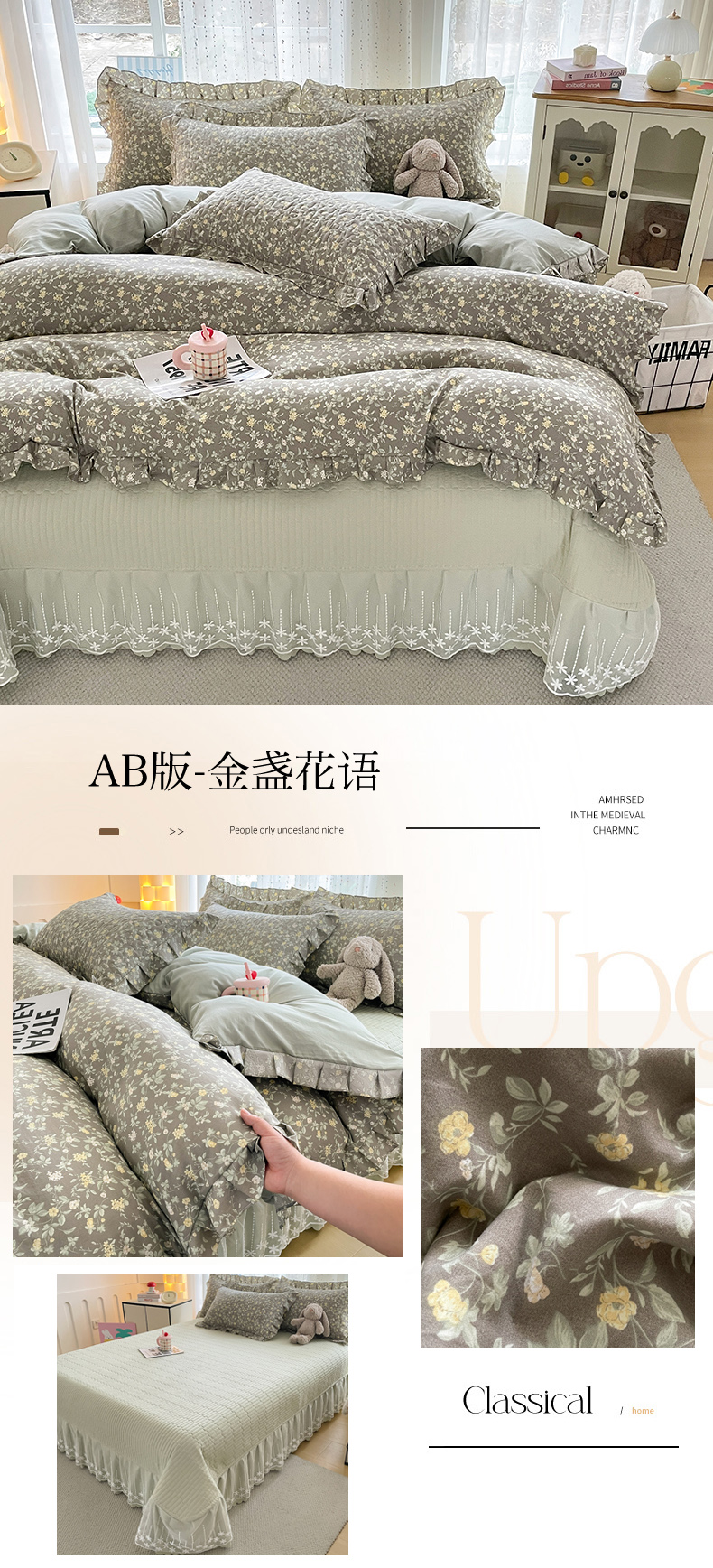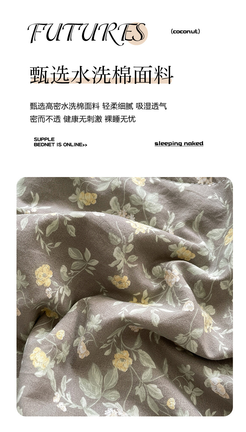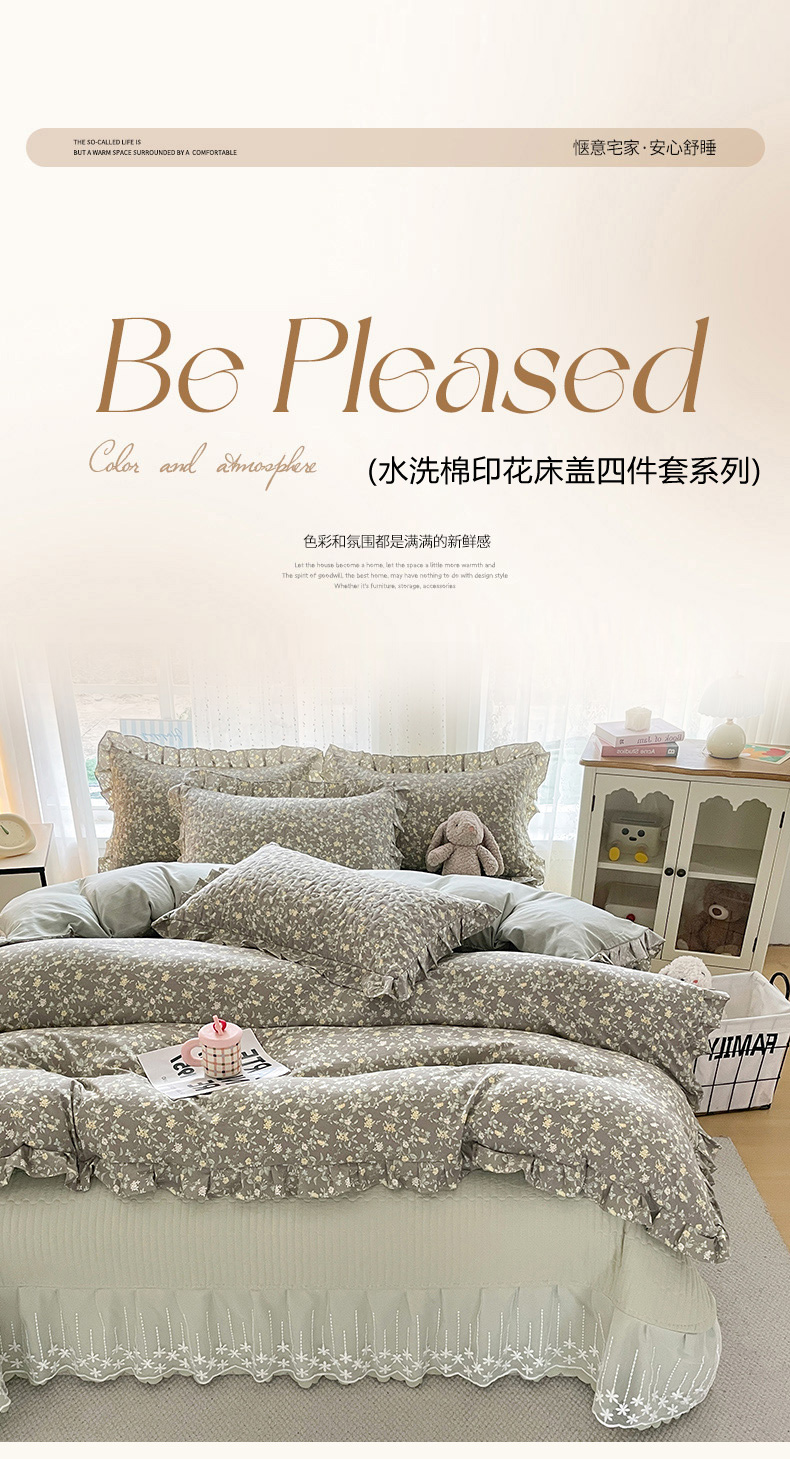 当前位置: 91家纺网 > 商品网购 > 床品套件 > 四件套 > 其它四件套 > 艺慕家纺 2026新款直播热款古法仿棉AB版水洗棉印花双层蕾丝花边床盖四件套 AB版-金盏花语